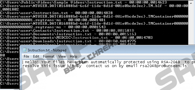 RSA2048Pro RansomwareRSA2048Pro Ransomware is spread via spam emails, and if you do not want to get your personal files encrypted, you need to keep this malicious infection away. If you have not managed to succeed at that, and the threat is already active, you must be desperate to get your files back. Unfortunately, we cannot guarantee that you will achieve that. As you might have figured out yourself already, the threat demands a ransom for some kind of a decryptor. Can you trust cyber criminals to present you with a decryptor after you pay the ransom? You cannot trust cyber criminals in general, and so we do not recommend following their demands. That being said, you need to decide for yourself what kinds of risk you want to take. Hopefully, you do not need to worry about any of this because your files are backed up, and you can focus completely on the removal of RSA2048Pro Ransomware. In either case, we recommend reading this report to learn more about the threat. If you are tricked into executing RSA2048Pro Ransomware – which, as we already discussed, is spread using spam emails – the encryption begins immediately. According to our research, the infection starts by encrypting the files that were created in the past three months. That is a unique feature. Unfortunately, after this, the threat continues to encrypt older files as well. Once the files are corrupted, they are given the “.aes” extension that you can see appended to their original names. Do not waste time deleting this extension because that is not how you can decrypt files. After the encryption, the threat launches a CMD window representing the files that were encrypted, and then it opens a file named “Instruction.txt”. This file has copies in every location where you can find encrypted files, and so even if you close it, you can find it afterward. The file represents a ransom note, according to which the files were encrypted using the RSA-2048 key and that you must email rsa2048pro@unseen.is to “resolve this issue.” If you did as told, you would be asked to pay a ransom. According to the latest information, the ransom might be 0.5 Bitcoins (around 1700 USD, but the conversion rates shift all the time), but the ransom could be adjusted from one victim to the next. Needless to say, the creator of RSA2048Pro Ransomware has no scruple when it comes to your virtual safety or your personal files. All they care about is your money, and it is unlikely that they have any intention of giving you a decryption key to ensure that the trade is fair. Of course, there is nothing fair about this malware, but if you are promised a fix in return of a payment, it would be nice for it to work the way as expected. On top of that, the ransom is very big – if 0.5 is the actual ransom – and that is not the kind of money you can just throw around. Even if that is not a big deal to you, think if you really want to support cyber criminals. At the end, you have to decide what you want to do. Since there is no way to decrypt files without a decryptor (note that legitimate file decryptors are unlikely to help), you might feel backed up into a corner. Hopefully, not all is lost. If your files are backed up, you should be able to recover them once you delete RSA2048Pro Ransomware. Can you eliminate this threat manually? If you can find the launcher, you should be able to perform the removal manually. On the other hand, if you cannot find it, a legitimate anti-malware tool will certainly help. If you employ a legitimate and trustworthy tool, it will not only erase existing threats but will also keep your operating system protected against new infections in the future. Obviously, you have to become more cautious as well. If you carelessly click on random links, open bogus spam email attachments, download unfamiliar software, and do other risky things, you could let in all kinds of malicious threats, and we are sure that is not what you want. RSA2048Pro Ransomware Removal