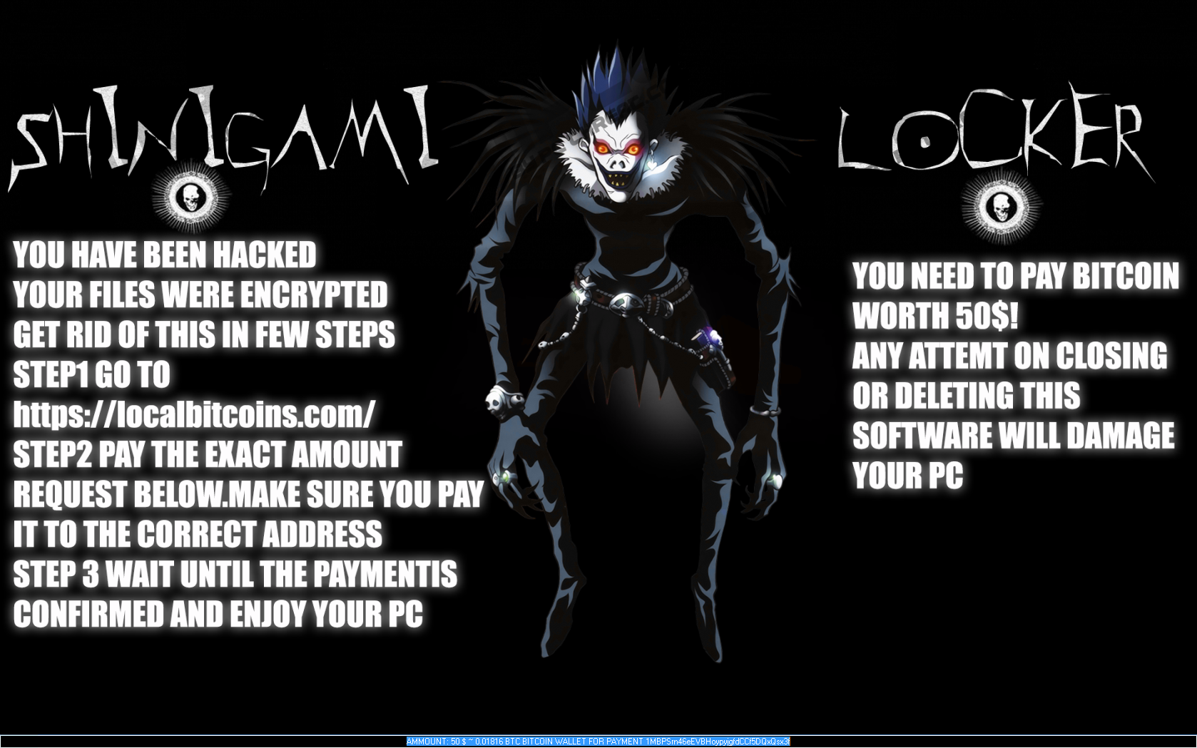 ShinigamiLocker RansomwareIf ShinigamiLocker Ransomware manages to slither onto your system, it is quite likely that you will lose your most important files in this vicious attack. Of course, if you have a recent backup saved in cloud storage or on a removable hard disk, you can easily restore your files. Otherwise, they will all remain inaccessible and unusable due to encryption. Unfortunately, we have not found any free tool on the web that could help you recover your files after this dangerous attack. This does not mean that such a tool will not appear on the web in the near future but we cannot rely on that either. Although you are offered a ransom fee to get your files decrypted, we do not advise you to trust your attackers. In fact, experience shows that it is very rare that such crooks actually decrypt victims’ files or send them the decryption key. It is more likely that instead of a working key they send another dangerous threat to extort more money from you once you proved that you are ready to pay for your lost files. All in all, we recommend that you remove ShinigamiLocker Ransomware from your system if you want to restore your system security. We have found that this dangerous malware infection can be distributed the usual ways. The most likely of these is spamming campaigns since this way cyber criminals can reach a lot of potential victims in a very short time. This spam has an attached file that you should not open in under any circumstances. Obviously, if you are infected with this dangerous threat, chances are we are too late with this warning; however, it may help you avoid the next attack. This spam could look like something very important to you. This effect is reached by the authentic-looking sender name and e-mail address pairs as well as the subject, which is usually something that would draw your attention right away. These subjects include unsettled invoices, unpaid speeding ticket or other fines, and issues with your credit card details. Unfortunately, we are a very curious type as humans and we would like to see such a mail even when we cannot related to it right then. We may believe that opening this mail can clear up the clouds and we would see the whys and hows. The problem is that you would only know any better if you downloaded the attached file; at least, this is what you are led to believe by this mail. However, once you try to open this file attachment, you simply initiate this dangerous attack and you will not be able to delete ShinigamiLocker Ransomware in time to save your files. But there are other ways for this infection to sneak onto your system and most likely behind your back. For example, if your browsers and drivers (Java and Adobe Flash) are not updated regularly, you could be infected by Exploit Kits. These kits are used by cyber crooks on webpage especially created to drop such an infection as soon as the page loads in your browser. You can easily land on such a page after clicking on a corrupt link or third-party advertisement on a shady website or you could also be redirected there by malware programs hiding on your computer. Therefore, we advise you to keep all your browsers and drivers up-to-date and to run a reliable malware scanner after you remove ShinigamiLocker Ransomware. Once this threat is activated, it targets your most important files (photos, videos, documents, and archives) and encrypts them. Every encrypted file gets an encoded name that has 8 alphanumeric characters as well as a “.shinigami” extension. When the damage is done, this ransomware locks your screen with its ransom note image that contains a well-known anime character in the middle. This ransom note demands you to pay 50 US dollars worth of Bitcoins (around 0.01 BTC) to a given Bitcoin address in order for you to be able to unlock your files and computer. Such a lock screen can be very misleading as you may really believe that there is no other way out. Even more so, as this note warns you not to restart your computer or quit this screen any other ways. However, sending money to these criminals may not guarantee the decryption of your files. On the other hand, you would simply assist cyber criminals to commit further crimes on the net. Therefore, we recommend that you remove ShinigamiLocker Ransomware as soon as possible even if this would possibly mean the loss of your files. Hopefully, you see now why it is important to keep a backup somewhere safe. If you are lucky enough to have one, you should delete ShinigamiLocker Ransomware before you start transferring the clean files. In order for you to be able to do so, you need to restart you computer first. Fortunately, this ransomware does not start up automatically with Windows, so this is the best way for you to end the screen lock. Then, you can delete all related files. Please follow our guide below if you feel skilled enough for the task and if you can possibly identify the malicious executable. If you want to find the best way to safeguard your PC against all malicious attacks, we suggest that you employ a trustworthy malware removal program, such as SpyHunter. How to ShinigamiLocker Ransomware from Windows