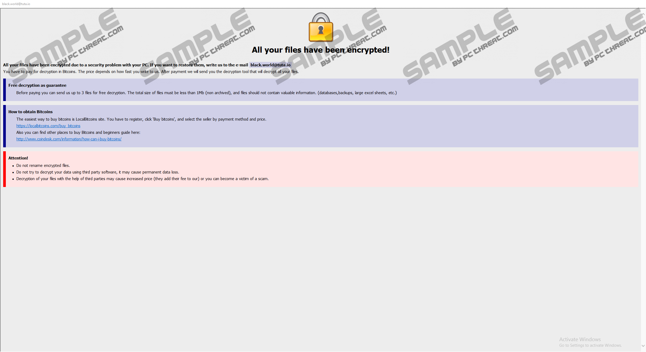 Nuclear RansomwareNuclear Ransomware is a new threat that Windows users need to be cautious about, but it is not a new threat per se. According to our research team, it is just a new variant of the infamous BTCWare Ransomware that emerged earlier this year. This encryption key used by this malware was deciphered, and so victims were capable of decrypting their files for free. Unfortunately, that is not the case with the new variant, and it is possible that this threat is stronger than its predecessor. Hopefully, a decryptor becomes available in the future, but whether or not it does, you need to remove Nuclear Ransomware. We are sure that you need no explanation as to why this threat must be deleted, but if you want to learn a little more about this piece of malware before you get rid of it, continue reading this report. If you find the information unclear, or if you have questions, use the comments section to contact our research team. According to the latest information provided by our researchers, the malicious Nuclear Ransomware should spread via RDP hacks and spam emails. That is pretty much how all ransomware infections are spread. Of course, the threat is silent, and it keeps itself concealed until the encryption is complete. When the threat encrypts files, it attaches the “.[black.world@tuta.io].nuclear” extension to their original names. That is done for the sole purpose of helping you understand the magnitude of the malicious ransomware. When you go through your folders and realize that all of your personal files have this extension – which means that they are encrypted – you are more likely to pay attention to the demands. According to our research, these demands are represented via a file named “HELP.hta”. A RUN key is added to HKEY_CURRENT_USER\SOFTWARE\Microsoft\Windows\CurrentVersion\RUN to ensure that the file is launched even if the infected computer is restarted. The same is not done with the main launcher, which means that if the PC is restarted, the malicious executable will not continue encrypting files. Needless to say, both the launcher and the HTA file must be deleted. The message delivered using the HELP.hta file informs that files were encrypted, and it is most likely that this is how you will learn about the attack of Nuclear Ransomware first. The message introduces you to the black.world@tuta.io email address and informs that you must email cyber crooks via it to initiate the decryption of your files. The threat does not hide the fact that you are expected to pay a ransom in return of a decryption tool, but a specific sum is not revealed. You would be introduced to this information only if you emailed the creator of Nuclear Ransomware. The ransom message also informs that renaming files or decrypting them using third-party tools can lead to permanent loss. That is likely to be just a scare tactic to make you follow the instructions. Unfortunately, the ransomware deletes shadow volume copies, and so recovering files manually might be impossible. What about the decryption tool that is promised in return for a ransom? At this moment, this tool cannot be retrieved in any way. In fact, you are unlikely to get it even if you pay the ransom. If you cannot risk losing money for no good reason, paying the ransom requested by the developer of Nuclear Ransomware is a bad idea. Of course, if your personal files are not backed up, and you cannot find a free file decryptor, paying the ransom might be the only option. Whatever happens, you must remove the ransomware as soon as possible. If you are thinking about manual removal, you must be able to find the launcher file. If you cannot do that, it is unlikely that you will be able to delete Nuclear Ransomware all by yourself. If you know exactly where this file is, go ahead and follow the instructions below. Of course, you still need to think about virtual protection, and we advise that you employ reliable security software afterward to help you defend your operating system against malicious threats. You can install this software right away to have the ransomware eliminate automatically as well. Hopefully, you now know what to do, and your operating system will be cleared in no time. Nuclear Ransomware Removal