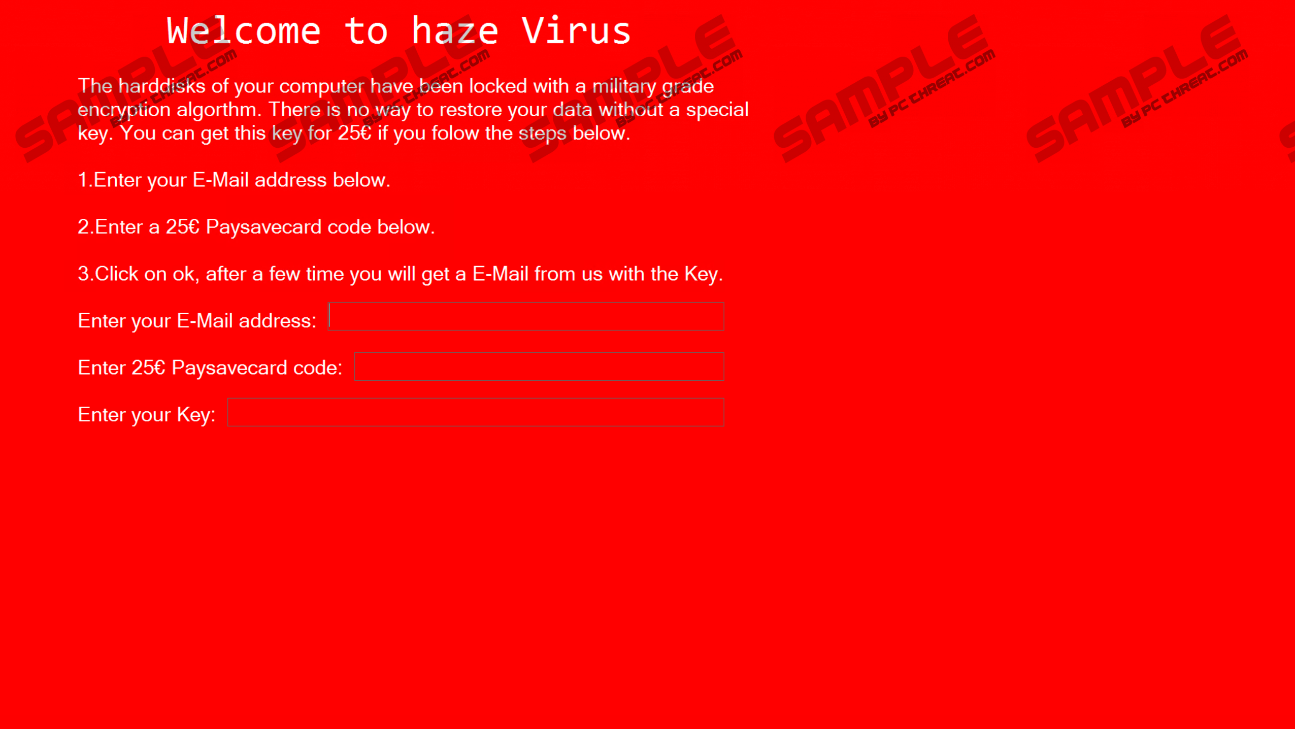 Haze RansomwareHaze Ransomware is a newly-detected malware developed by cyber criminals for money extortion. Currently, it acts more than a screenlocker because it does not encrypt files even though it opens a red window with a message claiming that all hard disks have been locked. Although it does not act as a typical ransomware infection today, it does not mean that its new updated version cannot be released in the future. No matter which of the versions of this ransomware infection show up on your system, you must remove this threat without further consideration. The chances are high that none of your personal files have been encrypted, so we see no point in sending cyber criminals the required money. Users should not give malware developers what they want even if their files become encrypted because malicious software creators will definitely take the money sent to them, but there are no guarantees that they will unlock files or give the decryption tool in exchange. Additionally, victims encourage cyber criminals to continue developing bad applications by sending money to them, so our advice would be to find another way to unlock files if they ever become locked. We are sure that Haze Ransomware is the one that has infiltrated your computer if you have been presented with a message “Press any key” in a flashy background before finding your screen locked. Although it does not encrypt any files, this infection still demands money from users, so it is very likely that it is its only goal. At the time of writing, it was asking the ransom of €25, but the size of the ransom might change. Unlike some other ransomware infections, it does not tell users to send money in the Bitcoin currency. Instead, it needs a Paysafecard code. Users are told that they will get the key for unlocking files via email soon after sending the code, but, unfortunately, there are no guarantees that this will really happen, so do not rush to send money to cyber criminals behind Haze Ransomware. To be frank, we see no point in sending money to cyber crooks because it is very likely that your files have not been encrypted. You can check them by pressing Win+D – you will return to Desktop and could try opening your files. Last but not least, you should not send the required money also because you could unlock the window placed over your Desktop and remove the ransomware infection quite easily. Unfortunately, the malicious file that can launch the ransomware again will stay on your system even if you pay a ransom, so, in the opinion of specialists at pcthreat.com, victims should keep the money in their pockets. Haze Ransomware cannot be called a prevalent infection because it has not affected many computers yet. Despite the fact that it is not distributed very actively, it is already known how it usually enters users’ computers. First, it can arrive on users’ PCs when they open a malicious attachment from a spam email. These attachments are made to look like important documents, so it does not surprise specialists at all that many users open them and get infected with serious malware. Researchers have also noticed that Haze Ransomware might enter computers illegally due to unsafe RDP configuration as well. Most probably, other distribution methods might also be used to spread ransomware, so it might not be easy to protect the system from the entrance of malware alone. We know one simple trick to ensure the system’s protection – enable a reputable security application on your computer. It will protect your PC 24/7, and you will no longer have to worry about the entrance of bad software. Most likely, Haze Ransomware has not locked any of your files, so its removal is your only task. It is not one of those threats that drop a bunch of new files on affected systems or make significant modifications on them, so you should be able to remove it fully manually. If the manual method is not for you, you can always erase malware from your system using an automated malware remover. Of course, you will first need to acquire a powerful antimalware scanner even if you already have some kind of tool installed on your computer. Delete Haze Ransomware