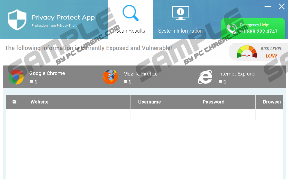 PCPrivacyProtectPCPrivacyProtect is a piece of software that is classified as a Trojan because it poses as a legitimate malware scanner, when, in reality, it is just another instrument schemers use to trick gullible users. Also identified as Trojan.FakeMS, this malicious program does not install itself onto the targeted system, which allows it to stay undetected. Of course, the bogus scanner using by this infection cannot appear out of thin air. According to our research team, the executable that belongs to this Trojan is most likely to be dropped onto the computer without its owner’s notice. Most likely, it is going to be downloaded along with other infections or potentially unwanted programs. Needless to say, that is a problem as well. If additional threats have invaded your operating system, you cannot ignore them. Sure, we focus on removing PCPrivacyProtect, but you must understand that there are plenty of other malicious threats that are just as or even more dangerous. To make sure that you do not overlook more serious threats, install a legitimate malware scanner and run a full system scan right away. Two different versions of PCPrivacyProtect might exist. One of them – just like the one we tested – could be operated solely via its .exe file, which means that the user would have to open the file to activate the bogus scanner. In another version, the infection might add a RUN registry key to make the executable run automatically, in which case, the scanner would pop up randomly. In either case, this tool should not be trusted because it cannot provide you with accurate or reliable information. The fictitious “PC Security Help” scanner can introduce you to “information” that is “Exposed and Vulnerable,” but that means nothing. Also, you could be introduced to a warning suggesting that your bank accounts, social media, and other sensitive accounts are at serious risk. To make things worse, PCPrivacyProtect also creates this warning: “These results may shock you. Please remain calm and contact your Certified Security Expert.” If you see a notification like that, the first thing you need to do is employ a legitimate malware scanner to analyze your PC and check if you need to remove any malicious infections. The purpose behind the malicious PCPrivacyProtect is to make you call +1888 222 4747. This number belongs to the cyber crooks who have created the malicious Trojan. Our research team has seen plenty of scams that use fictitious helpline numbers via which schemers can trick users into paying for bogus services, downloading malware, and opening up security backdoors. In most cases, these helpline numbers are introduced to users via fictitious pop-ups or malicious web pages. A few scams we can mention include “VOTRE ORDINATEUR A ÉTÉ BLOCKÉ, “Windows Firewall Blocked The Internet,” and “Call technical support +1 888-850-8578.” All of them use fake helplines to trick unsuspecting users into communicating with schemers. Needless to say, nothing good can come out of it. Whenever you are asked to call an unfamiliar number – regardless of how it is introduced to you – it is a good idea to check if it is legitimate. All you need to do is use a preferred search engine to cross-examine it. The instructions displayed below explain how to delete PCPrivacyProtect manually, but remember that this is not the only option, and our research team strongly recommends that you at least consider using anti-malware software. Why should you? There are several reasons for that. First of all, this software can automatically get rid of all existing infections, which means that if you install it, you will have PCPrivacyProtect removed automatically. This is particularly helpful if more than one threat is found because all of them will be erased simultaneously. Secondly, this software is primarily created to keep the operating system protected, and that is what you need if you do not want to face Trojans and other infections again. If you still choose to erase the infection manually, you can follow the instructions below. Just do not forget that malicious threats might remain active afterward. Make sure you employ a trustworthy malware scanner to inspect your PC for malicious leftovers. If they exist, delete them ASAP. PCPrivacyProtect Removal