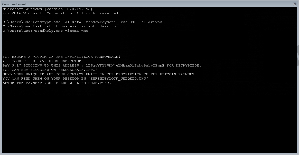 InfinityLock RansomwareInfinityLock Ransomware is one more application that is designed by cyber criminals so they could make illegal profits from unsuspecting Internet users. If you are not familiar with ransomware programs, you should know that they are crafted to encrypt vast quantities of data. Once that is done, developers such applications demand a ransom in return for decryption services. To have an in-depth knowledge of the intricate inner workings of this malicious piece of software, be sure to read this article. Additionally, our research team has compiled a few simple, yet extremely effective virtually security tips that will allow you to maintain a fully secure at all times. Finally, we also present a comprehensive removal guide that you should carefully follow to delete InfinityLock Ransomware once and for all. InfinityLock Ransomware functions quickly and aggressively. Once it enters your operating system, it immediately determines the contents of your entire hard drive. After that, it instantly starts the encryption procedure. It is not surprising whatsoever that the encryption process is quick and silent; most developers of ransomware programs design them in such a way so the malicious application would not be detected in action. During the in-depth analysis, our malware experts have noticed that this malware affects data located in folders such as %PROGRAMFILES%, %PROGRAMFILES(X86), %USERPROFILE%, and others. Thus, due to the malicious functionality of this program, a large number of your applications will no longer work. It is also important to note that InfinityLock Ransomware does not affect any files that are essential for your operating system's overall functionality. Unfortunately, manual decryption is out of the question because every single file is locked using a robust cipher that is known as RSA-2048. The devious application should also change your default Desktop image once your data is no longer accessible. Finally, after the encryption procedure is over, you will notice a ransom note entitled InfinityLock_UniqeID.txt. It contains information about what has happened and also an address to which you should make a transaction of 0.17 Bitcoin in return for decryption services. While at first, it might seem like a viable way to regain access to your files, you must be warned that cyber crooks responsible for this malware are not bound legally to decrypt your data even if you abide by their demands. Thus, you could lose not only valuable data but a large sum of money as well. It should be more than obvious that you must remove InfinityLock Ransomware at the very same time that it is discovered up and running on your personal computer. If you are a security-conscious user that wants to avoid programs such as InfinityLock Ransomware, you must take preventative measures to improve your overall virtual security. Our researchers have discovered that this application is often disguised as a crack for Adobe Premier and is hosted on questionable third-party sites. Thus, you can significantly lower the risk of coming across such devious installers by refraining from all dubious web pages. Malware developers nowadays also favor spam email campaigns as a way to spread their intrusive applications on a large scale. Therefore, it is quite natural that we urge users to avoid all email attachments that come your way from unknown third-party sources. Furthermore, we encourage you to always learn about a program and its developers before obtaining it since cyber crooks are infamous for using hoax advertising to trick users into downloading and installing their devious programs. Finally, and most importantly, every user needs to have a professional antimalware tool running on their PC at all times. Such a tool is paramount because it can detect and remove any virtual threat before it enters your PC. By taking these simple precautionary steps, you will be able to keep your PC safe and secure at all times. It goes without saying that you must terminate InfinityLock Ransomware as soon as possible. Make sure not to rush the termination procedure because a single missed step could result in an incomplete removal. If that happens and traces of InfinityLock Ransomware remain fully active on your personal computer, the malware in question could continue its malicious functionality. There might also be a possibility that leftovers related to this devious program could trigger its restoration without your knowledge. To be sure that every single bit of this malware has been deleted, you need to check your entire operating system for anything associated with InfinityLock Ransomware right after you are done with the instructions below. How to remove InfinityLock Ransomware from your personal computer