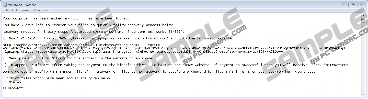 Mystic RansomwareMystic Ransomware is actually a mystical and dangerous threat that seems to be a time traveler since its ransom note seems to be rather old and outdated; yet, this ransomware threat seems to be around and spreading. We have also found that this malicious program may not fully function any longer as the main website provided by the authors seems to be dead; therefore, both payment transfer and decryption are impossible. This, unfortunately, may leave you with lots of encrypted files that you may not recover in any way unless you have a recently saved backup. In situations like this, a backup could be the only thing that can save you from losing all your personal files. It seems that this ransomware may only encrypt files in one main system folder; at least, that is what happened in our case when testing this vicious program. Still, it can cause a lot of headaches and loss. That is why we recommend that you remove Mystic Ransomware from your computer immediately. Before we tell you how you can eliminate this threat, let us tell you more about this infection and how you may avoid similar ones in the future. This ransomware program has been found spreading via spamming campaigns. This is a distribution method widely used by cyber criminals as you can easily infect potentially victims within a short time frame. If the spam is sophisticated enough, even more experienced users may fall for it. The main trick behind such a spam is that it appears to be legitimate and, at the same time, it also makes you believe that it regards a very urgent and important matter. This is why victims actually open it and then, try to run the attached file. This attachment however is the malicious executable of this dangerous threat. Once you launch it, there is no way back and you will not be able to stop its amok running until it finishes encryption. In other words, you can only delete Mystic Ransomware when your files have already been damaged beyond the possibility of repair without the unique decryption key. This is why it is essential that you become more cautious around your inbox and spam folder as well. Whenever you are in doubt about a mail or its attachment, do not open it until receiving confirmation from the sender. It is much less of a hassle to write an e-mail to the sender and inquire about the attachment and the subject than getting hit by such a ransomware. Keep in mind that no matter how updated and modern your spam filter may be, cyber criminals are always a few steps ahead and that is why a few spam may evade detection. Prevention is the key here and you can lower the risk of infection if you avoid opening suspicious mails and also, if you keep away from suspicious websites, clicking on third-party ads, and update your browsers and drivers regularly. We have no information about the kind of encryption algorithm used by this ransomware program, but it is quite likely the AES-256, which is used by most ransomware infections. This malicious program targets your most important files, including your photos, videos, documents, and databases trying to hit you hard enough to push you to pay the ransom fee for the decryption key. However, in our case, we have found that our sample only encrypted files in the "%USERPROFILE%" folder and below. The affected files do not get a new extension so the file names remain untouched, which makes it more difficult to identify this threat. This infection also drops a ransom note text file onto your system called "ransom.txt." This file contains all the information for you to be able to transfer the ransom fee and get your decryption key. But this ransom note seems to be rather old since these criminals ask for 1.01 BTC to be paid within 5 days, which is an insane 4,242 USD at the moment, but at the time of the release of this ransomware it was as low as 280 US dollar worth. Apart from this, we have also found that the website you are supposed to visit for more information and to be able to get your key after transferring the money is down and looks dead. This means that there is no way for you to pay and to get your key; not that we would advise anyone to pay any amount to cyber criminals. In fact, we recommend that you remove Mystic Ransomware right away. Hopefully, you do have a recent backup that you can use to recover most of your important files even if not all of them. But before you start copying your clean files, make sure that you delete all the related files. Please use our instructions below if you think you can identify the suspicious files that could be responsible for this dangerous attack. If you want to defend your PC against similar malicious threats, we suggest that you start using a reliable anti-malware program, such as SpyHunter. But do not forget about the importance of keeping all your programs and drivers always up-to-date to stop cyber criminals from being able to exploit outdated security holes. How to remove Mystic Ransomware from Windows