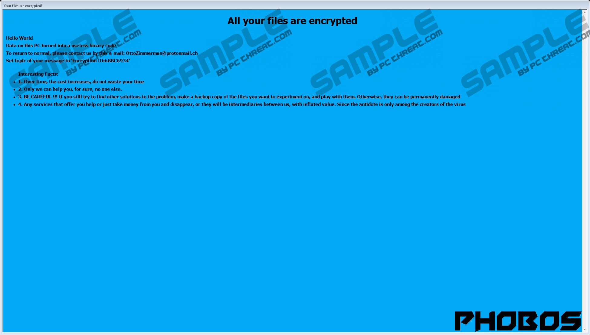 Phobos RansomwarePhobos Ransomware is a new highly dangerous application that can infect your PC by stealth and encrypt your personal files. After encrypting your files, this ransomware will demand that you pay a ransom to decrypt them. However, the sum to be paid is not stated in the ransom note that it drops. In any case, you should remove this program instead of paying the ransom because there is no guarantee that the cybercriminals will keep their word and decrypt your files. For more details on this ransomware, we invite you to read this whole article. Phobos Ransomware was designed to use the Advanced Encryption Standard (AES.) This particular encryption method ensures a strong encryption and is, thus, very (if not impossible) to decrypt. This ransomware should generate unique public encryption, and private decryption keys and the decryption key should be sent to this ransomware’s server to be stored. The full list of encryptable file types is not known at this point, but consider that this ransomware was definitely designed to target pictures, videos, audios, documents, executables, file archives, and so on to encrypt your personal files for which you would be willing to pay the ransom. This ransomware appends all encrypted files with a unique "ID.email.PHOBOS" file extension. Once the encryption is complete, it drops a ransom note called "Phobos.hta" on your PC. It might be opened automatically, but you might have to open it manually. The ransom note says that you need to send an email to OttoZimmerman@protonmail.ch with the subject line “Encryption ID:6BBC6934.” However, the ID number can be different for each unique user. The note also states that required ransom payment is set to increase with time. Furthermore, the cybercriminals want to convince you that you will not be able to decrypt your files without the decryption key offered by them. However, the cybersecurity industry might come up with a free decryption tool, so you should be on the lookout for that. Nevertheless, if your computer has not been infected with Phobos Ransomware, then you might be interested to know how it might end up infecting your PC. We assume that this ransomware ought to be distributed via fake, malicious emails that can be disguised as tax return forms, invoices, and so on. The emails might feature a download link of this ransomware or an attached file that can be zipped and made to look like a PDF or DOC file. If you open that file, then this ransomware will most likely infect your PC, provided that its execution will not be obstructed and prevented by an anti-malware program. Also, this ransomware might also be distributed on infected websites that might have exploit kits on them that can exploit vulnerabilities in Flash or Java and infect your PC secretly. In conclusion, Phobos Ransomware is one highly dangerous computer infection that can encrypt your files and render them useless. Its creators want to extract money from you, but you should not trust them to keep their end of the bargain and send you a decryptor/decryption key. Therefore, we recommend that you remove this ransomware from your PC as soon as the opportunity arises. See the guide below on how to detect the location of this ransomware using SpyHunter’s free malware scanner and then delete it manually. Removal Guide