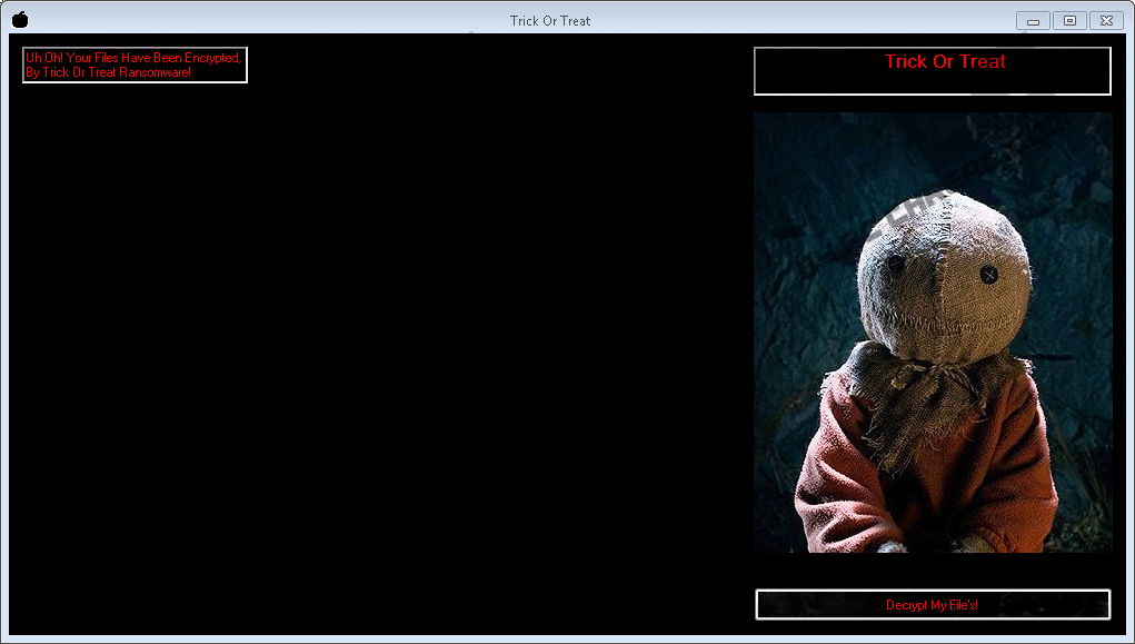 Trick-Or-Treat RansomwareA new ransomware infection Trick-Or-Treat Ransomware has been detected in the wild by specialists who work in the cyber security department. Surprisingly, it is not as dangerous as other ransomware infections. At the time of writing, it did not do anything really bad, we have to admit. It just opened a window on the screen. Therefore, we cannot consider it a very harmful malicious application. Of course, everything might change one day, i.e., it might be updated, so you are not allowed to keep Trick-Or-Treat Ransomware on your computer. Since it is not a very serious infection, you could delete it from your system quite easily too. Generally speaking, your only task will be to delete the file downloaded/launched. If you are just interested in the Trick-Or-Treat Ransomware removal, go to read the last paragraph of this article right away; however, if you are interested in how it works, you should read the article from beginning to end. Trick-Or-Treat Ransomware does not encrypt users’ files, does not lock the screen, and does not apply any other major modifications on victims’ computers once it infects them. The only sign showing that the entrance of this ransomware infection was successful is the black window opened on the screen. It contains the only sentence: “Uh Oh! Your Files Have Been Encrypted By Trick Or Treat Ransomware!.” Also, there is a button “Decrypt My File’s!” at the lower part of the window. Do not worry; there is nothing to decrypt because this ransomware infection has not encrypted any of your files – it just wants to scare you into believing that you have lost your data. Unlike other threats known as ransomware infections, it does not demand a ransom either. Specialists working at pcthreat.com have found it very surprising that this ransomware infection does not demand money from users, so, according to them, the chances are high that this infection is fake or still in development. There are no guarantees that it will not be updated soon, so if you have already detected this threat on your computer, you should uninstall it right away. If you keep it and it ever gets updates, you might find a bunch of your files encrypted. Cyber criminals create ransomware infections that can lock users’ personal files seeking to obtain money from them. Do not become one of these unfortunate users – delete Trick-Or-Treat Ransomware right away if you have already found it on your system. We cannot tell you much about the distribution of Trick-Or-Treat Ransomware because it is a new infection that is still in the development phase, meaning that cyber criminals do not distribute it actively yet. If it ever evolves into a serious threat, the chances are high that it will be mainly distributed via spam emails like a bunch of other ransomware infections, specialists say. Ransomware infections usually travel as attachments in spam emails, but if you ever find an email in Spam containing URL, do not click open it either because you might install malware on your computer. Also, you should keep in mind that ransomware infections might wait for users on file-sharing websites too, so always download software from trustworthy pages only. Unfortunately, other deceptive tactics might be used to promote ransomware infections too. We have to admit that it is not always very easy to prevent ransomware infections from entering systems. Because of this, we highly recommend that you enable a security application on your computer. The window opened on your Desktop by Trick-Or-Treat Ransomware can be easily closed by clicking X. Also, the version of this infection analyzed by our malware researchers does not block any system utilities, does not create a point of execution, does not encrypt files, and does not apply any other changes, so if you have encountered the same version of this ransomware infection, you should not find it very hard to erase it. All you need to do is to close the window and then delete the launched executable file. You should be able to find it on Desktop (%USERPROFILE%\Desktop) or among recently downloaded files in the Downloads (%USERPROFILE%\Downloads) folder. If it is nowhere to be seen, perform a system scan with a malware remover. It will find and delete it for you in no time and, on top of that, it will erase all other malicious components it manages to find. Delete Trick-Or-Treat Ransomware