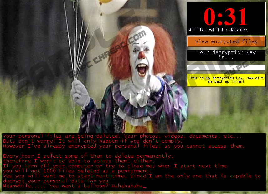 Pennywise RansomwarePennywise Ransomware is a threat that has the potential to encrypt files and demand a ransom fee in return for a decryptor. This devious and dangerous infection comes from the same group of malware as Colecyrus@mail.com Ransomware, Gendarmerie Ransomware, and Trick-Or-Treat Ransomware. Though not all of these threats work in the same ways, they are all designed by cyber criminals who want to trick victims into paying ransom fees. If the malicious threat slithers into your operating system and successfully encrypts your personal files, you might find yourself in a situation where you are presented with no other option but to pay a requested sum of money. The current version of this threat does not request a ransom because it is not yet capable of encrypting files at all. That being said, the threat could be activated, and it could become truly dangerous. If you want to learn more about this malware and how to prevent its infiltration, please continue reading. By doing so, you will also learn how to remove Pennywise Ransomware. If you have encountered the devious Pennywise Ransomware, you know where the name of this threat comes from. When this malware slithers into the operating system, it creates a file that opens a window with the image of a clown. In the recent pop culture history, a clown is associated with Pennywise, a well-known character in the horror Movie called “It.” This window also includes a timer indicating how much time is left before a set number of files are deleted. Right below the timer, you are shown the “View encrypted files” button that should show the list of encrypted files. Since Pennywise Ransomware currently does not encrypt files, this function does not work. The removal of files does not work either. Once the timer runs out, nothing happens. Nonetheless, the message at the bottom of the window is scary, and it might trick some users into thinking that their files are lost. According to this message, all personal files are encrypted, and failure to “comply” will result in their removal. There is an additional threat suggesting that 1000 files would be deleted if you restarted the computer. Since the window is represented in full-screen, you are more likely to pay attention to the threats made via the message. Although Pennywise Ransomware orders you to “comply,” there is no information regarding what you are expected to do. In most cases, file-encryptors demand ransom fees. If the malicious ransomware was upgraded, there is a great possibility that you would be asked to pay for a decryptor as well. Whether or not this is what you are asked to do, you need to be cautious. Cyber criminals always promise file decryptors in return, but they never keep their promise after they get the money. According to our research, the malicious Pennywise Ransomware is a variant of the infamous Jigsaw Ransomware, and it certainly has the potential to act as a real file-encrypting infection. If it worked that way, it should use the AES key to encrypt files, and all files affected by it should get the “.beep” extension attached to their names. Our research team has also managed to reveal that the threat is set up to target over 120 different types of files, including .jpg, .txt, .doc, .mp3, .avi, .rar, and .zip. So, if you do not want these kinds of files on your PC to be encrypted or removed, you need to make sure that you keep malicious ransomware away. If the malicious Pennywise Ransomware got in and encrypted your files, it is most likely that you cannot do anything to reverse the damage. In this case, you should be able to restore your personal files only if they are backed up, and you can replace the corrupted versions of your files with the backup ones. Of course, you should do that only after you delete Pennywise Ransomware. The removal of this threat is not very complex if you know where to find the launcher file. First, you need to terminate the process representing the file of a screen-locking window. If you can identify this process, finding and deleting the malicious executable will not be problematic. What about the protection of your operating system? That is even more important than the removal of the ransomware. If you think you can protect your operating system all by yourself, you might be overestimating your abilities and skills. We suggest employing anti-malware software to have the operating system protected. Besides reinstating trustworthy protection, this software will also eliminate any remaining threats. Pennywise Ransomware Removal