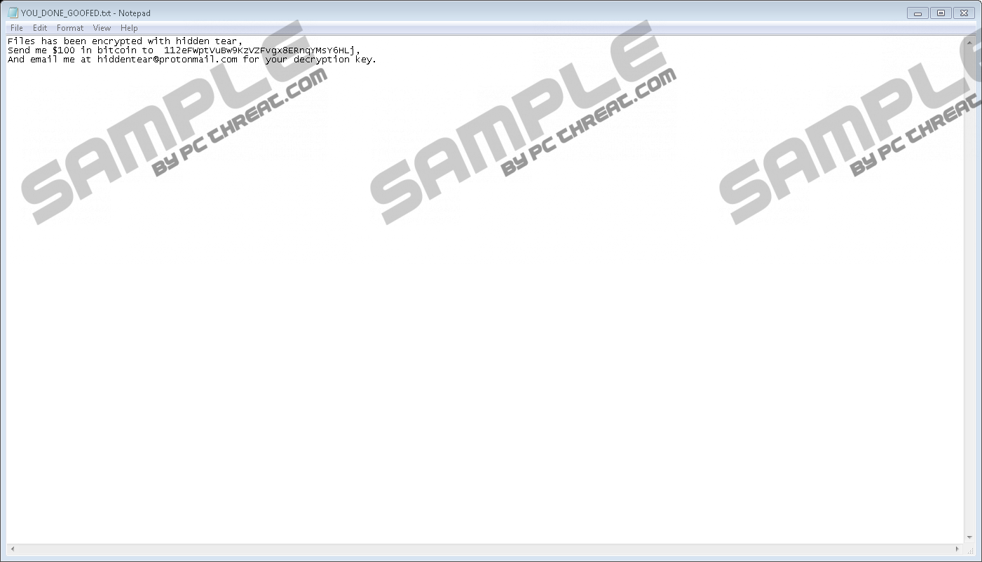 Goofed RansomwareThere are many harmful infections users can encounter these days. One of the newest threats cyber criminals have developed is Goofed Ransomware. It seems that it is still in development because it places a ransom note in a folder called test, which many users do not have, after encrypting files on a compromised machine. Of course, it might still cause problems to you because it mercilessly encrypts files stored on affected computers. In this sense, it does not differ at all from other HiddenTear-based ransomware infections. If you do not have the test folder in %USERPROFILE%\Desktop, you will not see a ransom note demanding money because it is dropped to this only folder, but this does not change anything because we still recommend deleting Goofed Ransomware from the system as soon as possible no matter the ransom note is visible or not. It should not be extremely hard to erase this infection from the system because it is not one of those sophisticated threats that make a bunch of modifications on those computers they infiltrate, but, of course, you should still read this report from beginning to end before the removal procedure. Goofed Ransomware is considered a harmful infection even though it still seems to be in development because it locks users’ files without mercy. Specifically speaking, you will find it impossible to access .txt, .doc, .docx, .xls, .xlsx, .ppt, .pptx, .odt, .jpg, .png, .csv, .sql, .mdb, .sln, .php, .asp, .aspx, .html, .xml, and .psd files after the entrance of Goofed Ransomware. You do not need to go to check all your files to find out which of them have been encrypted because those locked ones get the .goofed extension appended. If you have the folder called test located in %USERPROFILE%\Desktop, you will also find YOU_DONE_GOOFED.txt dropped there when Goofed Ransomware finishes encrypting your files. This file is the so-called ransom note that demands money from users in exchange for the tool that can decrypt files. The ransomware version analyzed by our specialists demanded 100 USD. This file also contained the Bitcoin address, which clearly shows that cyber criminals behind this ransomware infection expect to get money in the Bitcoin cryptocurrency. Never send money to crooks no matter that your documents or other important files have been encrypted and you can no longer open them because you do not know whether it will be possible to decrypt these files after paying a ransom. Of course, you might not have a chance to unlock your data if you do not purchase the decryptor, but you will, at least, not give your money to malicious software developers for nothing. Since we already know what to expect from Goofed Ransomware, let’s talk about its distribution. It has not been detected on many computers yet, but specialists suspect that it is spread just like a number of other ransomware infections. Speaking specifically, it should be spread masqueraded as an ordinary file, e.g. a PDF document in spam emails. When users open the malicious attachment, the crypto-threat starts working on their computers right away, i.e. it goes to encrypt their files the first thing following the successful infiltration. We do not say that it is the only distribution method that might be used to spread this ransomware infection. Theoretically, its malicious file might also be disguised as a beneficial application to trick users into downloading and launching it too, so do not download all programs that look like decent software from P2P and other dubious websites. What you should also do if you want to be safe is to enable security software on your computer. You must use only a reputable antimalware tool to ensure your system’s maximum protection. You cannot fix your data, but you can protect new files you will create someday by deleting Goofed Ransomware fully from your system today. It is not sophisticated malware, so its removal will not be complicated at all. The first thing you need to do is to remove suspicious files downloaded recently to erase the malicious file launched too (if you do not delete it, you might launch the ransomware infection accidentally again). Also, you need to delete YOU_DONE_GOOFED.txt from the test folder located in %USERPROFILE%\Desktop as well (the chances are high that you will not have this folder). How to remove Goofed Ransomware