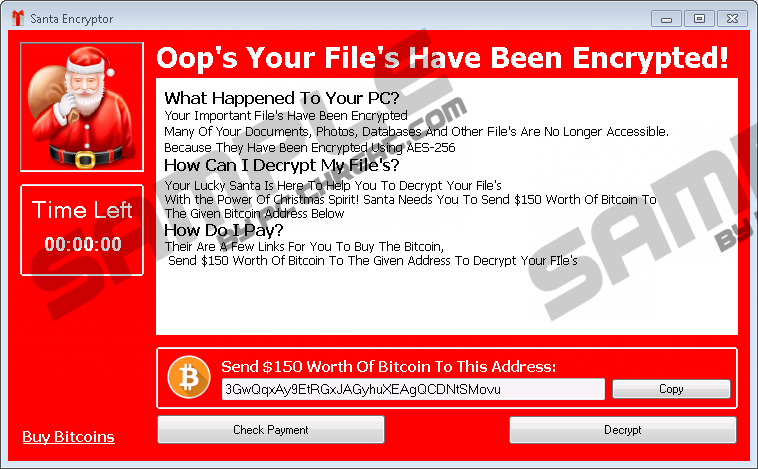 Santa Encryptor RansomwareCyber criminals do not stop developing new malicious applications during the festive season. Santa Encryptor Ransomware is their newest creation. It contains an image of Santa Claus in the top-left corner, but it is still a harmful malicious application. According to researchers at pcthreat.com, this infection is still in development because, at the time of research, it did not encrypt any files. We are sure it is only a question of time when malicious software developers finish it and start actively spreading it with the intention of earning an illegal profit before Christmas. It is unclear whether it will become a prevalent infection or not, but we are sure for one thing – you should take all possible measures to prevent it from showing up on your system. Ransomware infections are malicious applications that are not so easy to prevent from entering the system. This threat might show up on your computer after a single click on some kind of malicious link, so you should be very cautious. If you are reading this article not out of curiosity but because you have already discovered this infection on your system, you should continue reading this article. You will first find out more about it and then we will tell you more about its removal. Ransomware infections are considered harmful malware because their entrance usually results in the loss of files and money. No doubt Santa Encryptor Ransomware has been developed to obtain money from users as well. It did not encrypt any files at the time of writing, but our malware researchers still managed to find some more information about it by analyzing its source code. It has turned out that the ransomware infection tries to encrypt files using the XOR cipher. If it is ever fixed and you encounter this threat, no doubt you will find your documents, pictures, music, and other valuable files with .txt, .doc, .docx, .log, .msg, .odt, and .pages extensions encrypted. As we have already told you above, cyber criminals develop ransomware infections because they want users’ money, so we are sure Santa Encryptor Ransomware will ask money from you either if you ever encounter its fully working version. It wants 150 USD in Bitcoin from users, but, of course, the size of the ransom might change. You should never send money to cyber crooks even if there is no other way to decrypt those encrypted files because you cannot know whether you could decrypt them after you pay the money demanded. Unfortunately, there is not much you can do if you have encountered the working version of Santa Encryptor Ransomware, found your files locked, and do not want to send money to crooks behind this infection because these affected files can only be restored for free from a backup. There is no other way to do this if you have never backed up your data. Santa Encryptor Ransomware is not one of those prevalent threats, so it is not easy to talk about its distribution as well. Of course, there is no doubt that it infiltrates users’ PCs without their knowledge. Our researchers say that users often allow malicious software to enter their computers themselves without realizing that too. For example, they might find malware on their computers after opening attachments from received malicious emails. Also, they might download threats from the web. This usually happens for those users who download tons of freeware from file-sharing websites. It is not always a piece of cake to ensure the system’s maximum protection, but it is definitely not something users cannot do. You will be protected from all kinds of threats spreading through the web these days if you simply enable security software on your computer. As long as it is there, your PC will be protected against malware. The removal of Santa Encryptor Ransomware should not be complicated because you could delete it by removing the malicious file launched. Unfortunately, your files will stay encrypted even if you erase this threat from your PC. Keep in mind that you must erase this threat if your files are fine as well. The manual removal guide you can find below this article will help you to delete this malicious application, but you should still perform a system a system scan with an automated malware remover as well because you cannot leave any components of this infection active on your computer. How to delete Santa Encryptor Ransomware