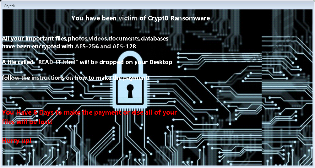 Crypt0 HT RansomwareCrypt0 HT Ransomware is another file-encrypting ransomware we add to the black list. This infection comes from the same family of vicious malware as Crypt0 Ransomware, Cryp70n1c Ransomware, French Ransomware, and many others. These were created using the Hidden Tear open source code, and our research team has analyzed hundreds of them. At the moment, the devious threat we are discussing in this report does not function properly, but that is something that could change very fast. Maybe the infection is still being developed, or maybe there is an issue that is currently being fixed. All in all, although this threat does not function at the moment, it would be a mistake to underestimate it. Instead, you need to learn all about it so you could keep yourself protected against it. This guide also includes instructions on how to remove Crypt0 HT Ransomware in case you end up facing this threat. If anything discussed in this report raises questions for you, note that you can start discussions in the comments section. According to our researchers who have analyzed the code of the suspicious Crypt0 HT Ransomware, it is most likely to spread using corrupted spam emails. It was found that the well-known icon of Adobe PDF is used by this malicious infection, and so it is most likely that the launcher is concealed as a harmless PDF file. If the user is tricked into opening it, the infection is executed silently. If this obstacle is overcome, the devious Crypt0 HT Ransomware starts encrypting files, and it appears that it can encrypt everything outside %PROGRAMFILES%, %PROGRAMFILES(x86)%, and %WINDIR% directories. According to our analysis, over 200 types of files can be corrupted by this threat, and, of course, its main targets include documents, media files, and photos. Right before the files are encrypted, the ransomware also communicates with a C&C server to send your computer name, user name, and a private key that can be used for decryption. All of this is done silently, and it is unlikely that you will uncover the infection until it reveals itself, which it should do using a window entitled “Crypt0,” as well as a text file named “READ_IT.html”. It is not yet clear what message Crypt0 HT Ransomware represents using the “READ_IT.html” file, but the sample we tested showed the “Crypt0” window, which, by the way, can be closed via the Taskbar. According to the message represented within the window, your files were encrypted using the AES-256 key, and that you have 6 days to pay a ransom to get your files decrypted. The message points to the HTML file. Our researchers claim that the cyber criminals behind Crypt0 HT Ransomware demand a ransom of 450 USD to be transferred to 1KDkc2xxvptfWt65h5GHUrRo36Tj4aMSH9. So far, no one has transferred any money to this Bitcoin Address, which is good news. That being said, we cannot guarantee that this threat has not invaded operating systems and encrypted files, or will not do so in the future. In case this has happened, you do not want to pay the ransom, and the reason is that cyber criminals will not give you the decryption tool/password/key in return. They will simply take the money and disappear. That is why instead of showing how to pay the ransom, we show how to remove the ransomware. We offer a simple guide that shows how to delete Crypt0 HT Ransomware manually; however, we cannot guarantee that everyone will successfully eliminate this threat because the most important step, of course, is to erase the launcher, and its location can be random. Needless to say, if you are having issues eliminating malware manually, you should not push yourself to do it. Instead, employ anti-malware software you know you can trust, and the devious threat will be eliminated successfully. If other malicious threats exist, they will be deleted simultaneously. On top of that, this software will take care of your virtual security in the future, and that is extremely important if you want to keep malware away in the future. You also need to be more cautious about the spam emails you open, the files you download, and the links you click because ransomware could be spread in various ways. Also, note that the best way to protect your files is to back them up externally. Crypt0 HT Ransomware Removal