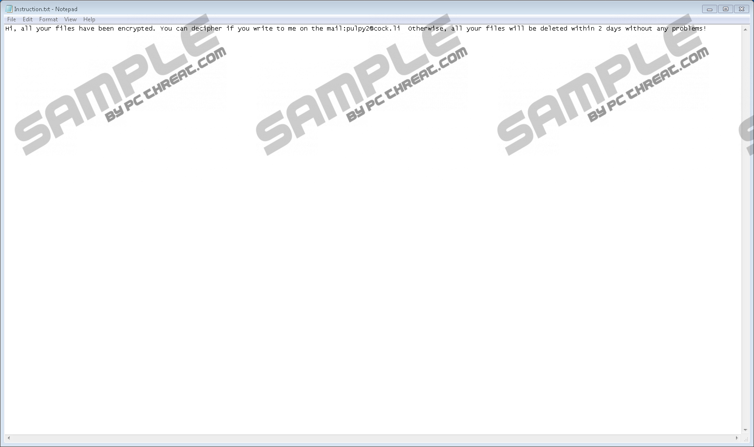 Pulpy RansomwareIt seems that there is no end to this ransomware plague as new infections show up every single day. Pulpy Ransomware is probably the newest additional to the big bag of ransomware programs that users have had to deal with over the years. This program works just like any other ransomware infection out there: it enters the target system surreptitiously and then expects users to pay for the file decryption. Computer security experts strongly discourage users from paying the ransom because that does not guarantee that the files will be restored. It is a lot better to remove Pulpy Ransomware from the affected system and look for other ways to retrieve the encrypted data. Since the program itself is not one of the worst ransomware infections out there, we still do not have many details about it. And it is very likely that Pulpy Ransomware will pass by as your average infection, without getting a lot of interest from the news outlets. Nevertheless, just because we do not know the exact genesis, we can still more or less point out the main distribution patterns that are used by Pulpy Ransomware and many other similar intruders out there. According to our research, this program tends to spread with spam email. Spam email messages are the most common mean for ransomware infections to reach target computers. It is fascinating to think that users still get tricked by this scam, especially as certain email service providers employ algorithms that filter spam messages into junk folders, the chances of finding these messages into your main inbox are rather slim. Nevertheless, some of the messages that carry the infection do manage to slip through. More basic email service providers may not be able to filter them straight into the Junk. What’s more, spam messages that distribute Pulpy Ransomware may look like regular mails from online shopping stores and even financial institutions. For instance, we do know that sometimes spam messages look like invoice messages, and they ask users to check out the invoice document attached to the message. Or the message may look like a financial report from a bank that you need to check. We have actually received similar emails ourselves, but they were ALWAYS from the banks where we do not have a single account. So it is more than obvious that such messages are blatant scam, devised to infect you with malware. Unfortunately, if Pulpy Ransomware enters your computer, it will encrypt your files and drop a ransom note in every affected folder. The ransomware note looks like a text file (Instruction.txt), and it says that you have two days to contact the hackers via the given email address. Otherwise, the criminals threaten to delete all of your files. It is not clear whether they can really delete your files. What’s more, Pulpy Ransomware cannot affect all of your files, too. It mostly encrypts your personal files, but the files in such directories as ProgramData, Windows, AppData, and so on, will not be encrypted. Ransomware programs often refrain from encrypting every single file because then it would not have many ways to collect the ransom. It is not clear how much the people behind this infection want to get from you because you need to contact them first, but it is very likely that the hackers might just scram with your money without even bothering to issue a decryption key. Hence, it would not be a good idea to keep all of your eggs in one basket (betting on the ransom fee). Computer security experts would rather see you delete Pulpy Ransomware from your system and then look for ways to restore your files. Unfortunately, a public decryption tool is not available at the moment, so you may need to remove Pulpy Ransomware and delete all of the encrypted files before transferring healthy files back into your drive. You may need to check out your backup drive (like an external hard disk or a virtual drive) where you keep copies of your files to for the data that you can restore. Finally, please be more careful when you encounter strange messages in your inbox. If the message comes with an attachment, it could be malware, so think twice before downloading it! How to Remove Pulpy Ransomware