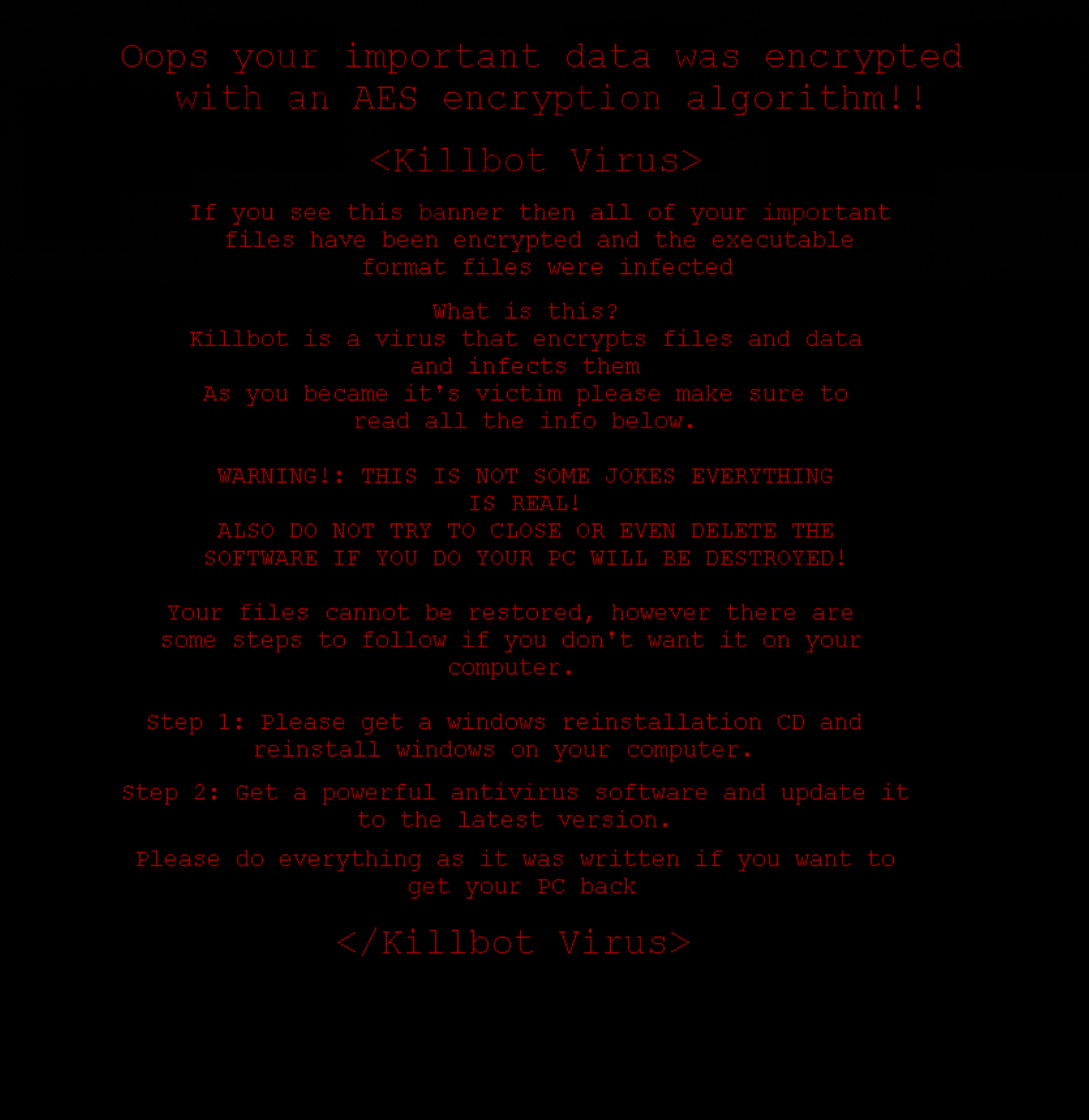 KillBot_Virus RansomwareIf you have just found a full-screen warning saying that your PC is infected with a KillBot Virus, that means that you are actually dealing with ransomware. The KillBot_Virus ransomware is a deceptive infection still in development, and it is aimed at making you think that your files are no longer accessible. A typical ransomware infection would encrypt files and demand for a hefty release fee in a digital currency. There are some so-called screen lockers that only lock the screen by disabling users' access to their data and demanding for a ransom. The KillBot_Virus ransomware is somewhere in between these two types, because at the moment the threat only displays a full-screen warning claiming that your data is no longer accessible even though it is programmed to encrypt file. It is possible to close the warning by clicking the keyboard keys Alt and Tab simultaneously, which you should do right now if the KillBot Virus notification is still present on the screen. After closing the deceptive warning, it is important to remove the threat from the system. The KillBot_Virus ransomware does not affect files, but, if it did, it would encrypt photos, images, Word documents, music and video files, and some more. The infection has been analyzed by our researchers, and it has been found that the threat would use a AES encryption algorithm to corrupt your files. No exceptions regarding file exception have been observed, suggesting that the KillBot_Virus ransomware would literally encrypt all the files present on the computer. The ransomware threats affects different disks by scanning them for files and creating the file My Pictures.exe in each disk. Additionally, the threat would affect .exe files and disable the Windows features such as Task Manager, CMD, and Control Panel. The analysis of the code has also showed that the KillBot_Virus threat would have its point of execution (POE) in the Windows Registry enabling the infection to start is processes at the system's startup. When analyzing the infection, the sample retrieved for the analysis did not use the POE, but, if the infection were renewed or updated, it, most likely, would cause significant damage. Ransomware infections can be prevented by paying more attention to the content you are exposed to. For example, email and RDP are two frequently used ransomware distribution methods. As regards email, it is crucial to ignore emails that are sent by an unrecognized sender. Online schemers also use phishing techniques to infect victims' computer, so you should not download file attachments or click on links in emails that appear to resemble the emails of well-known institutions. If you use the RDP service, you should make sure that your password is strong enough so that no attackers can access your PC surreptitiously and plant malicious programs without your permission. Additionally, you should also avoid questionable websites, including gaming websites, dating websites, and software sharing websites. Such websites may contain some malicious scripts injecting malware to visitors' computers. Moreover, very often such websites are supported by advertising servers displaying various third-party ads, some of which may be aimed at deceiving you into downloading malware. If you want to reduce the risk of getting affected by online threats, do not hesitate to implement a reputable security tool. hat are sent by an unrecognized sender. Online schemers also use phishing techniques to infect victims' If you have not restarted your computer yet in fear of causing more damage, do not worry but use the keyboard shortcut Alt+Tab to close the deceptive full-screen warning. Further one, you would need to kill the process of the infection through the Windows Task Manager. You can have the KillBot_Virus ransomware removed for you by anti-malware, but, if you prefer manual removal, at least scan the system afterwards to make sure that your computer is not affected by any other malicious programs. Malware is installed on your device surreptitiously to take advantage of your data stored or the data you input to the computer, and you should be aware of possible malware attacks. Below you will find our instructions on how to remove the ransom warning of the KillBot_Virus threat and kill its malicious process. In case of any question, feel free to comment below in the comment box. How to remove KillBot_Virus Ransomware