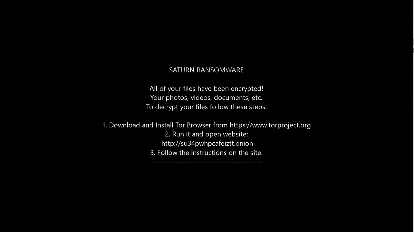 Saturn RansomwareSaturn Ransomware is a dangerous and highly clandestine infection that can slither into your operating system without alarming you. The threat is most likely to conceal itself as a document and introduce itself to you via a misleading spam email. If the trick works, and you open the file, the infection is unleashed, and the encryption of files begins soon. When the malicious threat encrypts your personal files, you are unlikely to notice it either because the threat does not open any windows or show any alerts. If anti-malware software is not installed to protect your system against this malware and alarm you about the malicious activity, you will realize that you need to remove Saturn Ransomware only after it corrupts your files. Unfortunately, if you have found your files corrupted, you will not be able to recover them. Hopefully, you use backups, and you can retrieve files from an online cloud or an external drive because the malicious ransomware is not “decryptable.” All in all, even if you cannot save your files, you can delete the infection, and you will learn how to do it by reading this report. According to our malware research team, Saturn Ransomware has only recently started spreading and corrupting vulnerable systems. It joins such recently discovered threats as SuddenTax Ransomware, Rarucrypt Ransomware, and DCRTR Ransomware. Although all of these infections encrypt files and demand ransoms, all of them are unique. For example, when Saturn Ransomware encrypts your personal files, it adds the “.saturn” extension to their names. This threat also has a unique list of files that it is meant to encrypt. The ransomware encrypts files with such extensions as .txt, .mp3, .wma, .jpg, and .rar. Our researchers have also found that this infection uses commands to delete Shadow Volume copies, to disable Windows startup repair, as well as to clear the Windows backup catalog. These commands are: “cmd.exe /C vssadmin.exe delete shadows /all /quiet & wmic.exe shadowcopy delete & bcdedit /set {default} bootstatuspolicy ignoreallfailures & bcdedit /set {default} recoveryenabled no & wbadmin delete catalog –quiet.” Unfortunately, because of this, recovering files that are backed up on your system is impossible. After the encryption, the infection creates four unique files. One of the files created by Saturn Ransomware is the .KEY file with a unique identification number. The victim is supposed to enter this number into an area represented at http://su34pwhpcafeiztt.onion. Users are introduced to this page via “#DECRYPT_MY_FILES#.html” and “#DECRYPT_MY_FILES#.txt” files. Both of these files represent a message that instructs to download the Tor Browser, visit the mentioned page, and then follow additional instructions. The message within the .onion page is available in Chinese, English, French, German, Italian, Japanese, Portuguese, Russian, and Spanish languages, and once the code is applied, the victim is provided with the ransom payment instructions. The initial fee is $300; however, the ransom is meant to double after 7 days. 13JEwGTEUbUcM7Nhvf24v5DngaTNo8cx98 is the Bitcoin Address to which the ransom must be paid in Bitcoins. Paying the ransom is not recommended because cyber criminals are unlikely to keep their promise to decrypt your files. The last file created by Saturn Ransomware is called “#DECRYPT_MY_FILES#.vbs,” and it is created on the Desktop. All of these files must be removed. Where is the executable of Saturn Ransomware? If you are able to find it, you should be able to remove the malicious threat yourself. If identifying the launcher is impossible for you, employing anti-malware software is strongly recommended. While it is crucial that you delete Saturn Ransomware and all other malicious infections that might be active on your operating system, it is most important that this software can protect your operating system against malicious infections. If you do not enable full-time protection, you are likely to face other malicious threats, and not just ransomware. Needless to say, that is something you want to avoid at all cost, which is why you need to consider installing anti-malware software. If you choose not to, you will need to remove Saturn Ransomware manually. Hopefully, the instructions below will help you. If you have questions for our research team, add a comment below. Saturn Ransomware Removal