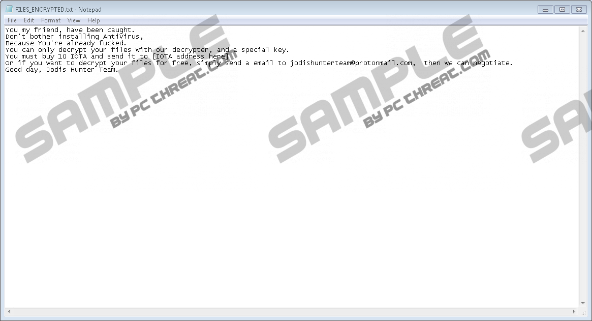 Scammerlocker RansomwareYou want to do everything it takes to keep Scammerlocker Ransomware away. If you are unable to do that, this infection can corrupt many of your personal files. Although this threat is a real file-encryptor, and decrypting the files it corrupts is unlikely to be possible, in comparison to other similar threats, it is not the worst one. That is because this infection is set to corrupt files only in %USERPROFILE%\Desktop, %USERPROFILE%\Documents, %USERPROFILE%\Videos, and %USERPROFILE%\Pictures directories. If you do not keep your personal files in these directories, you might be unharmed even if this malicious threat slithers in. Note that when it encrypts files, it attaches the “.jodis” extension to their names, and so if the gets slithers in, you should check your personal files if they were encrypted, and then you should immediately remove Scammerlocker Ransomware. The bad news is that you will not get your files decrypted if you delete this malicious threat. Nonetheless, that must be done ASAP. Scammerlocker Ransomware is unlikely to have been created by cyber criminals who are responsible for Ultimo Ransomware, Ransomuserlocker Ransomware, Krypton Ransomware, and similar infections, but they all have several things in common. For one, they were created using the same Hidden Tear open source code. Anyone can use it, which is why many of the threats that derive from this family are not always functional. The second thing they all have in common is the goal, which is to make the victim pay a ransom. You might have let in Scammerlocker Ransomware by opening a corrupted spam email attachment or by downloading malicious software, and, as soon as it is in, this infection starts corrupting files in the aforementioned directories. The infection does not corrupt all files that are located in them because it is set to specifically corrupt .txt, .mp3, .html, .php, .doc, .mov, and similar files. Our research team reports that the threat should encrypt at least 32 different types of files. As soon as these files are encrypted, the infection creates a ransom note file named “FILES_ENCRYPTED.txt.” It is safe for you to open this file, but do not forget to delete it when you start the removal of the ransomware. According to the ransom note shown to you by Scammerlocker Ransomware, you need a decryption tool and a key to free the files that are corrupted by the malicious infection. The note offers two solutions. You can either pay a ransom of 10 IOTA (cryptocurrency), which is around 12 USD, or you can email the creator of the threat at jodishunterteam@protonmail.com to “negotiate” a deal. If you go with the first option, you will have to set up a wallet, purchase IOTA, and send it to a special address. If you choose to email cyber criminals, most likely, you will be forced to do the same. The devious cyber criminals – who are introducing themselves as the “Jodis Hunter Team” – cannot be trusted. There are no guarantees that they would provide you with a decryptor regardless of what you do. Our research team has had the “pleasure” of analyzing hundreds of ransomware threats, and one thing that rarely changes is that the victims are always duped. Of course, because the ransom is not huge, some might choose to take the risk, and if you are thinking about doing the same, make sure you think things through. In either case, removing Scammerlocker Ransomware must not be forgotten. Can you delete Scammerlocker Ransomware manually? That all depends on your ability to find and erase the launcher file. Do you know where it is? If you do, go ahead and remove it as soon as possible. After that, erase every single copy of the ransom note file. Finally, install a trusted malware scanner to inspect the operating system. Even if you think your operating system is clean, it is possible that something hidden could still be present, and, needless to say, you want to get rid of it. If you are unable to remove Scammerlocker Ransomware yourself, as well as to keep your system protected against malware, installing anti-malware software is the best decision you can make. Should you have questions about the removal process or the protection of the system, add them to the questions area. Scammerlocker Ransomware Removal