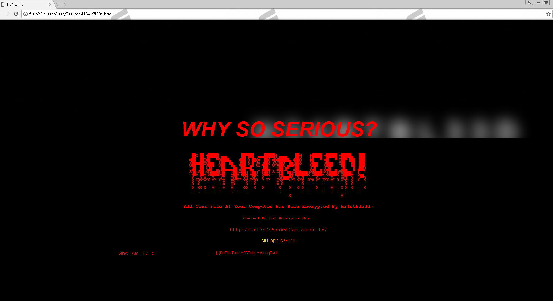 H34rtbl33d RansomwareH34rtbl33d Ransomware is not a program that you want to find up and running on your operating system because it exhibits malicious functionality, to put it lightly. If you are not familiar with ransomware programs, it is essential to highlight the fact that they are designed to lock vast quantities of data stored on the affected computer. Cyber crooks mostly use such devious applications to make illegal earnings from unsuspecting Internet users. The scheme, which such programs follow is quite simple. First, it locks data on your PC and then demands a ransom in return for decryption services. For further information regarding this intrusive application's inner workings, be sure to read the rest of this report. Additionally, we include a few tips that you should take to improve your virtual security. Finally, to help you delete H34rtbl33d Ransomware once and for all, we present a detailed removal guide. H34rtbl33d Ransomware starts doing its dirty work as soon as it is gains successful access to your operating system. During the analysis, our researchers have noticed that this malicious program is closely related to another program of this classification, which goes by the name of Halloware Ransomware. Thus, it is not surprising that both applications function alike. Right upon intrusion, this devious program scans your entire hard drive to determine, which data it will lock. Once that is done, it will delete all of your shadows copies; due to that, you will not be able to use them for restoration purposes. Also, this ransomware disables a few basic Windows functions such as Task Manager and Command Prompt. The next step in the chain of action is the encryption procedure, which is quick and silent. Due to such functionality, very few users, if any at all, are able to identify this malware before it is too late. During encryption, your data will be locked using a robust cipher, which is used for a simple reason - to eliminate any chances of manual decryption. Once your data is no longer accessible, this invasive malware initiates the change of your default Desktop imagine. Additionally, it drops a ransom note in the form of a .txt file. It informs you that your data is no longer usable, and that you must pay a ransom in return for decryption services. Under no circumstances abide by these demands since malware developers are not legally bound to unlock your data even if you pay up. Be sure to delete H34rtbl33d Ransomware without any hesitation. Do that in just a few simple steps by using the instructions below. If you value virtual security and wish to have a clean and safe operating system at all times, you must take a few simple precautionary steps. First, our malware experts urge you to make regularly scheduled backup images of your hard drive. Doing so is essential because they can be used to restore any data if your operating system is infected with a ransomware program. Furthermore, be sure to practice safe browsing habits at all times. Remember to refrain from all unauthorized download sites because they are infamous for hosting bundled installers, which are often filled with invasive and even harmful applications. Also, you must learn as much as you can about any program that you want to have on your PC. We recommend doing so because malware developers often use misleading marketing tactics to trick naive Internet users into downloading and installing their intrusive applications without knowing how they work. Finally, and most importantly, be sure to install a professional antimalware tool if you do not have one already. Such a tool is vital because it can detect and remove any virtual security threat automatically. Remove H34rtbl33d Ransomware at the very same instance that it is found up and running on your operating system. Under no circumstances delay the termination procedure since keeping this malware on your PC might lead to further virtual security problems. Also, we recommend double-checking your operating system for anything associated with H34rtbl33d Ransomware as soon as you are done with the instructions below. Doing so is imperative because leftovers of this malicious program could be used to restore it silently. In other situations, those traces might be enough for H34rtbl33d Ransomware to continue working. If you find such analysis a bit too complex, be sure to scan your PC with a professional antimalware tool because it can detect and delete anything linked to H34rtbl33d Ransomware automatically. How to remove H34rtbl33d Ransomware from your computerWindows Vista/7/8/8.1/10