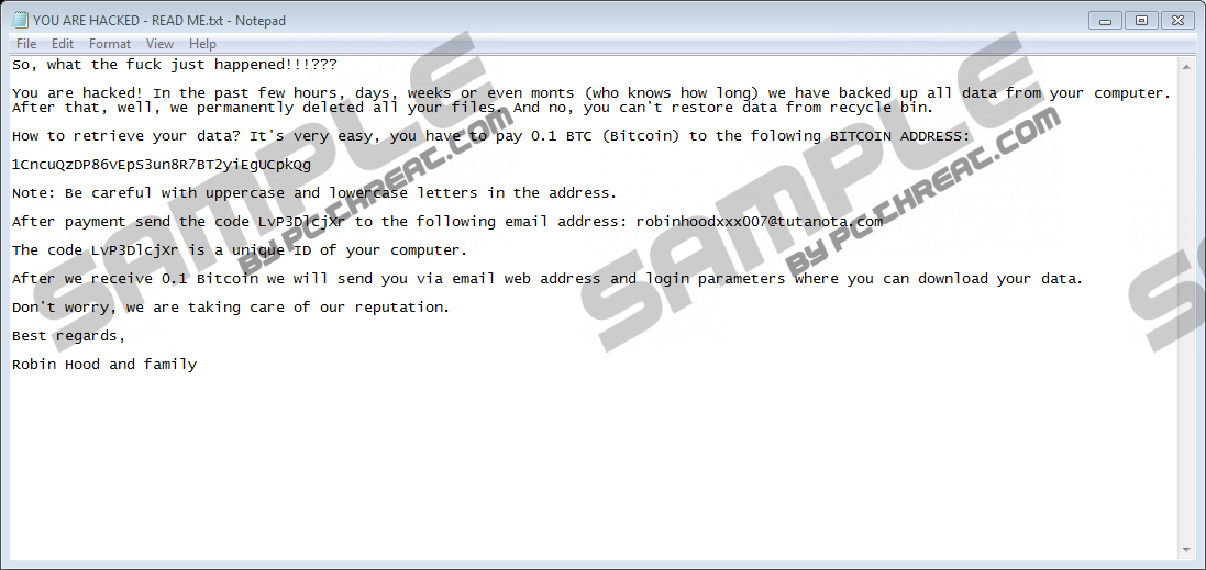 Robin Hood And Family RansomwareWhat happens if Robin Hood And Family Ransomware slithers into your operating system? If that happens, your personal files are likely to deleted, and that is what makes this infection one of the most aggressive threats our research team has seen in a while. The good news is that it does not target all files found on your operating system, and it appears to target two specific directories only. Unfortunately, most Windows users keep highly personal and sensitive files in these directories. Please continue reading the article to learn more about this. Without a doubt, the most important task for you if you face it is Robin Hood And Family Ransomware removal. The bad news is that this threat is pretty unpredictable, and it is unlikely that all victims will be able to delete it manually. Luckily, there is an easier way to get rid of this threat, and it suits all Windows users, regardless of their skills and experiences. Robin Hood And Family Ransomware is not to be confused with RobinHood Ransomware, an entirely unique and unrelated infection that was reported a year ago now. This threat encrypted files using the AES encryption algorithm, and it demanded a ransom of 5 Bitcoins. Today, this kind of a sum is completely ridiculous. Robin Hood And Family Ransomware makes a demand for 0.1 Bitcoin, which, at the time of research, converted to nearly 900 USD and 750 EUR. Needless to say, this is a huge sums, and not all victims will be capable of paying it. The thing is, while it is never recommended that users make any deals with cyber criminals, paying the ransom requested by this ransomware is definitely the wrong move. As we mentioned already, instead of encrypting files, this malware deletes them. Our researchers found that the infection deletes files stored in two specific directories, %USERPROFILE%\Desktop and %USERPROFILE%\Documents. If the files that you had stored here are not backed up online or on an external drive, you are screwed. Unfortunately, the ransom note suggests that your files were backed up by cyber criminals before they were erased, and that is why some might be tricked into paying the ransom. According to our malware research experts, Robin Hood And Family Ransomware creators do NOT back up your files before removing them. What does that mean? That means that there is no point in paying the ransom. According to the message that is represented using the “YOU ARE HACKED - READ ME.txt” file – which is created on the Desktop – you need to transfer the ransom to a special Bitcoin wallet (cyber crooks set up 1CncuQzDP86vEpS3un8R7BT2yiEgUCpkQg) and then send a unique key to a special email address (robinhoodxxx007@tutanota.com). It is suggested that if you do this, you would gain access to an “email address and login parameters” that would allow you to decrypt personal files. This is all a big lie that you should not fall for. If you are not cautious, you could lose both, your files and your money. Also, by emailing cyber crooks, you would be disclosing your personal email address, which is not a good idea either. Without a doubt, you need to be smart about the moves you make next. You are in a great situation if your files are backed up. If this is the case, all you really need to think about is the removal of the ransomware. And if your files are not backed up, they are lost for good. Hopefully, nothing too important was lost due to the attack of this infection. In any case, you need to delete Robin Hood And Family Ransomware, and there are several options you can choose from. You could try to erase this malware yourself, but no one can guarantee success in this case. All in all, the choice is yours, and if you want to remove Robin Hood And Family Ransomware yourself, you definitely should try it. Just do not forget to employ a malware scanner. It will let you know if you have succeeded. What is the other option? You could install an anti-malware tool, and this is what we recommend. Why? There are several answers to this question. First of all, this tool can guarantee successful removal of all threats. Second, it also can guarantee full-time protection in the future. Clearly, the benefits are speaking for themselves. Robin Hood And Family Ransomware Removal