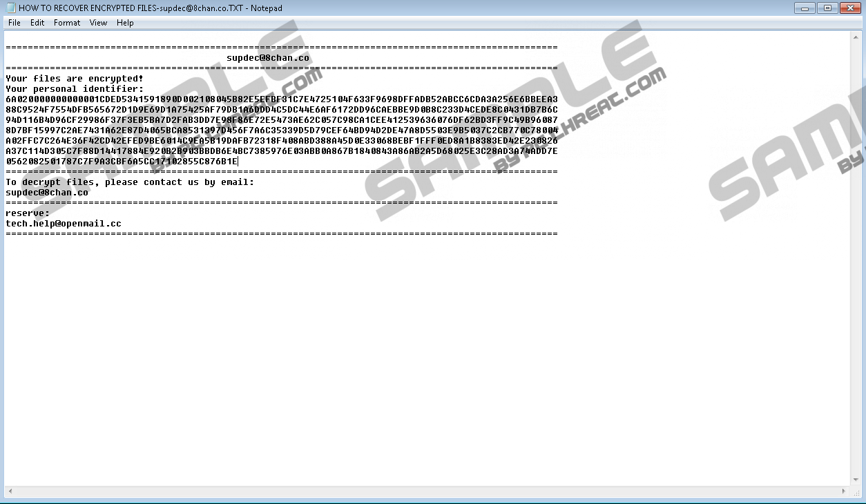 8chan Ransomware8chan Ransomware is a malicious threat that asks to contact its creators through the supdec@8chan.co email address. It is not an option we would recommend since it is entirely possible the cybercriminals behind this infection could scam you and leave you empty-handed. Even though the malware encrypts various personal files located on the computer, victims can still recover them from backup. Also, our researchers say the malicious program is a new variant of Scarab Ransomware and consequently, there is a possibility its damaged files could be decrypted with tools created by volunteer IT specialists. Therefore, if you have no other way to unlock your data, it might be a good idea to see if anyone managed to create a decryptor, just make sure the tool comes right from the website of the security specialists who created it; otherwise, you might end up with more threats on the system. As for more details about 8chan Ransomware’s working manner and its removal, we encourage you to read the rest of our article. According to our researchers, it is most likely the malware is being distributed through Spam emails, unsafe RDP (Remote Desktop Protocol) connections, and other similar channels. Naturally, to stay away from threats like 8chan Ransomware in the future, users should watch out for suspicious files received from unknown senders or other untrustworthy data downloaded from the internet, for example, software installers, updates, etc. In addition, we would advise updating the operating system and all other programs that could be out of date. Plus, if you have any old and weak passwords, you should change them to strong ones right way. Doing all of this might help users eliminate possible system’s vulnerabilities that could be used to gain access to the computer and plant malware directly. No doubt, another good idea would be to employ a reliable antimalware tool as such applications are designed to guard the PC against various malicious programs. However, if you are not so cautious and end up receiving 8chan Ransomware, all your personal files should become encrypted, and they may have one of the following second extensions: .decrypts@8chan.co, .777@8chan.co, .recover@8chan.co, and so on. Besides, victims should see a text document called HOW TO RECOVER ENCRYPTED FILES-[used_extension].txt on their Desktop or other directories containing encrypted data too. It is a ransom note from the infection’s creators and accordingly it carries instructions on how to contact these people to unlock damaged files. The problem is, once the user approaches them the hackers might try to extort money from him and sadly, there are no guarantees they will hold on to their words. Meaning, the threat’s developers could start asking for even more money or just never reply you. Thus, if you do not wish to lose your money in vain, we would recommend finding other ways to decrypt your files. Users who do not want to put up with any demands and risk their savings should delete the malware with no hesitation. The process might be a bit complicated as the threat could place randomly titled files in different directories, but if you follow the instructions located a bit below this article, we will try to guide you through it. Nonetheless, if you do not think you can get rid of 8chan Ransomware manually, you could install an antimalware tool of your choice and use it to eliminate the malicious program. Lastly, it is crucial to mention that if the malware enters the system, it may drop even more malicious programs on it. Our researchers report, 8chan Ransomware placed a Trojan infection on the computer they tested it with. This is why, if you decide to erase the threat manually, it might still be a good idea to scan the system with a reliable antimalware tool too. In case the ransomware came not alone, the antimalware tool of your choice might help you detect and remove the other infection before it causes more trouble. Should you need any additional assistance or have questions about the threat, keep it in mind, you can leave us a message below the text too. Erase 8chan Ransomware