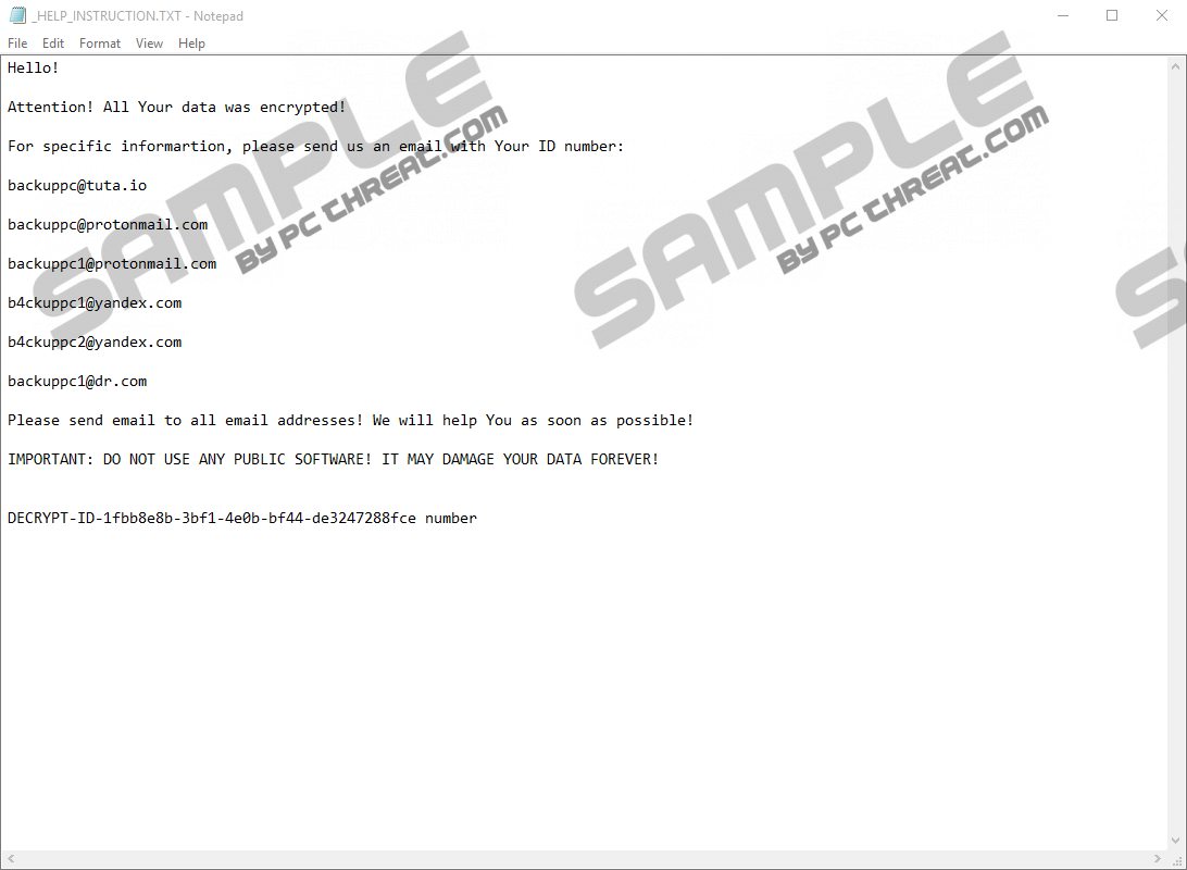 .BACKUP RansomwareThere is little doubt that .BACKUP Ransomware has corrupted your operating system if you have found the “.BACKUP” extension attached to all of your personal files. This malicious infection belongs to the group of malware that encrypts files with the purpose of terrorizing victims into paying ransoms for tools or keys that, allegedly, could decrypt data. Although it has unique features, the infection is very similar to other threats from the same group. It is most important to note that the ransomware can encrypt files everywhere on the disk. Unlike some threats, it does not go after specific directories, and, instead, it simply looks for certain files with specific extensions. Without a doubt, the threat is most likely to go after photos, media files, and documents because these files are the most sensitive and valuable. Hence, you are more likely to pay for them; at least, in comparison to system files that can be easily downloaded online. Unfortunately, some people might give in, and that could be a mistake. The only recommendation we have for you is to remove .BACKUP Ransomware. The malicious .BACKUP Ransomware is a variant of CryptoMix Ransomware. We have seen other infections that are linked to this threat, including Mole66 Ransomware, 0000 Ransomware, and Zayka Ransomware. These threats can be spread in many different ways, but our researchers inform that misleading spam email attachments and vulnerable RDP connections are exploited most frequently. As soon as these infections slither in, they begin the encryption process. At this time, it is not known which encryption method .BACKUP Ransomware employs, but it is most likely to use RSA or AES encryptor. After the process is complete, and the extension is attached, a file named “_HELP_INSTRUCTION.TXT” is created. Although it is a file created by the ransomware, it is completely safe for you to open it. It is not a functional file, and its only purpose is to deliver the message that cyber criminals have for you. That being said, this file must be deleted during the elimination process. In fact, every single component of the malicious ransomware must be removed without exception. The ransom note file, _HELP_INSTRUCTION.TXT, immediately informs that personal data was encrypted, and then it instructs to send a special ID number to six different email addresses. These include: backuppc@tuta.io, backuppc@protonmail.com, backuppc1@protonmail.com, b4ckuppc1@yandex.com, b4ckuppc2@yandex.com, and backuppc1@dr.com. It is stated that a response would be issued right away, and while it is not said in the ransom note, we can guarantee that the response would include ransom payment instructions. Although threats that serve no real purpose exist, .BACKUP Ransomware is not one of them, and its creators built it to get your money. Victims who are not familiar with how ransomware operates and who are desperate to get their files back might be convinced that this is the only way out. Unfortunately, it is most likely that there is nothing anyone can do to help you recover personal data. To the knowledge of our malware researchers, legitimate free decryption tool cannot help you in this situation either. The only thing that can help you is file backups. Hopefully, you still have a secondary access to your personal files after you delete .BACKUP Ransomware via backups. Can you recognize malicious processes, files, and registries? This is the most important questions to ask yourself if you are thinking about deleting .BACKUP Ransomware manually. If you do not have experience identifying malicious components, but you are sure you want to try out manual removal, you need to be extremely careful. Of course, we recommend that instead of trying to catch and eliminate malware, you install software that could take care of all of this automatically. A trusted anti-malware program can do a lot for you. In a situation like this, it can automatically remove .BACKUP Ransomware and other active threats. Additionally – and most importantly – it can protect your operating system against malware invasion in the future. Of course, to keep malware away, you yourself need to be more cautious. Do NOT interact with unfamiliar emails, installers, or links, and do not keep your system unguarded. To ensure this, always install all security updates in time, and set up trustworthy anti-malware software. .BACKUP Ransomware Removal