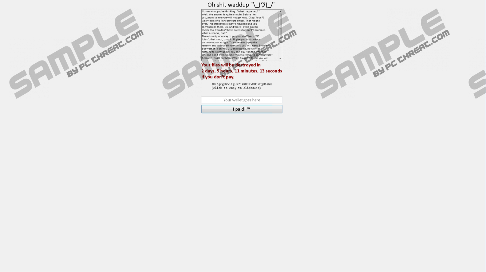 Shrug RansomwareShrug Ransomware is a malicious application that uses the so-called shrug emoji when displaying a ransom note. The malware’s message claims all the user’s essential files were encrypted and in order to get them back, he has to pay a ransom of 50 US dollars. In return, the hackers behind this threat promise to send instructions on how to unlock the infected computer’s screen and decrypt affected files. We would not advise trusting these people as chances are they could be trying to scam you. Not to mention, it appears to be the malicious application is decryptable as the volunteer IT specialists managed to create a working decryption tool. Meaning, instead of paying the ransom you could try searching the Internet for the mention means to unlock your enciphered data. However, users should be cautious while searching for it because harmful sites might offer fake decryptors, so it is best to look for reputable sites only. If you continue reading the article, we will tell you more about Shrug Ransomware and to erase it manually you could use the instructions available below. Like many other ransomware applications, Shrug Ransomware should be spread through malicious Spam emails, fake software setup files, and so on. This is why to protect the system against such threats our researchers recommend not to open untrustworthy data downloaded from torrent and other similar unreliable web pages or received via email. If you feel you must open the file for any reason, but you suspect it could be harmful, the best idea would be to scan it with a reliable antimalware tool of your choice. Unfortunately, once the infected file is launched the malware should start encrypting his data almost immediately. According to our researchers, Shrug Ransomware targets various personal files, for example, user’s photographs, videos, archives, and so on. The next step is locking the user’s screen to prevent him from accessing his computer. The message on top of the locked screen is called ransom note. It might say you cannot unlock the screen without the help from the malicious application’s developers, but the truth is the screen can be easily unlocked by restarting the computer. As you see, the Shrug Ransomware does not create a specific Registry entry that would make the system launch the malware automatically. Therefore, by restarting the computer, the victim should kill the infection’s process, and the screen would only be blocked if the user would relaunch the malware’s installer. Thus, provided you do not make the same mistake, restarting the system should do the trick. Another thing you might have noticed while reading the Shrug Ransomware’s ransom note is all your personal files were encrypted and to get them back you could be asked to pay a ransom in Bitcoins. As the malicious application’s creators say, the sum should be equal to 50 US Dollars. It could seem like a small amount, and your files might be worth risking it, but as we explained earlier, there is a chance you may not have to risk it. At the moment of writing, our researchers report there is a decryption tool available online free of charge. Users should be aware of the fact volunteer IT specialists developed it, and it can be obtained through a particular legitimate website. What we are trying to say is if you need this tool, you should look for it carefully and try avoiding malicious web pages suggesting fake decryption tools. Moreover, we should mention all encrypted files can be replaced with backup copies. In other words, if the victim was smart enough to backup all essential files he might not have to depend on any decryptors. Just make sure you erase Shrug Ransomware properly before uploading any copies to keep them safe. More experienced users could try deleting the malware with our manual removal instructions available below. On the other hand, if you do not think you are skilled enough for such a task you could acquire a reliable antimalware tool instead of complete our provided steps and use it to get rid of the threat. Eliminate Shrug Ransomware