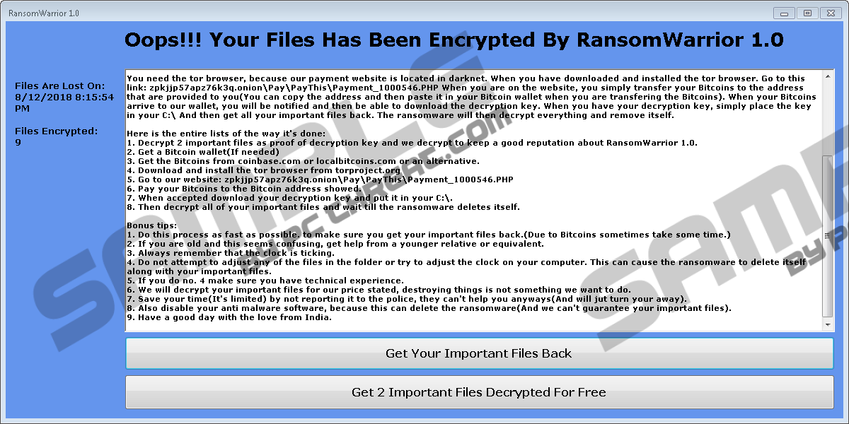 RansomWarrior 1.0 RansomwareThe malicious program’s ransom note says “with the love from India,” which suggests RansomWarrior 1.0 Ransomware might have been developed by hackers from the mentioned country. As usual for such malware, the message states the user can decrypt files locked by the threat by paying a ransom. Needless to say, we would not recommend doing so as no matter what the cybercriminals promise in reality there are no reassurances they will hold on to their words. Therefore, instead of risking your savings we recommend erasing RansomWarrior 1.0 Ransomware with the instructions available at the end of this article. Users who continue reading the text and learn more about the malicious application. It is something we would recommend if you have no made up your mind on what to do yet or if you are simply interested in finding out more details about this malware. Our researchers suspect, RansomWarrior 1.0 Ransomware could be spread via usual channels for such threats, for example, Spam emails or unreliable software installers. Knowing these are one of the two most popular ways to distribute infections alike we always recommend staying away from torrent or other untrustworthy file-sharing web pages and email attachments received for unknown purpose or from people you are not familiar with. As an extra precaution, we could suggest employing a reliable antimalware tool. Just keep it in mind it needs to be updated as soon as there is such a possibility; otherwise, the tool might be unable to detect newer threats. Also, if you have extremely important files and wish to be extra careful, you could scan suspicious data obtained from the Internet first instead of launching it and waiting to see if anything goes wrong. Not to mention, it would be a good idea to back up necessary files regularly just in case. Testing the malware revealed it does not place any additional data on the computer it infects. In other words, the only data belonging to RansomWarrior 1.0 Ransomware should be its launcher (the suspicious file downloaded and launched by the user). This means the encryption process might start right away and its duration depends on the number of targeted files located on the computer. Our researchers say the threat can encipher a wide range of different file types. For instance, it can affect files with .ai, .avi, .bat, .bmp, .class, .cmp, .doc, .docx, .exe, .fm3, .gif, .html, .ico, .java, .jpg, .jpeg, .mov, .pdf, .png, .ppt, .pptx, .zip, and many other extensions. Once the file gets encrypted, it should get a new title consisting of the ID number given to the infected computer by the malicious program and .THBEC extension, e.g., 2536984.THBEC. The final RansomWarrior 1.0 Ransomware task is to display a ransom note. The message from the malware’s developers should start with “Oops!!! Your Files Has Been Encrypted By RansomWarrior 1.0.” Then bit by bit it should explain how to purchase Bitcoins and how to transfer Bitcoins worth of around 350 US dollars into the hackers’ account. Another thing mentioned in the note is the so-called free decryption as a guarantee. Users should realize the while the cybercriminals may show they can decrypt their files there is nothing they can do to prove they will decrypt data as promised. It would be impossible to get your money back so no one could stop the cybercriminals from taking your money and still ignoring you. If you do not think RansomWarrior 1.0 Ransomware’s creators can be trusted either we recommend erasing the infection instead of paying the ransom and putting your savings at risk. Those who would like to remove RansomWarrior 1.0 Ransomware manually could follow the instructions located at the end of this paragraph since they will explain the whole process step by step. Another way to eliminate the malicious program once and for all is to employ a reliable antimalware tool and then perform a full system scan. Remove RansomWarrior 1.0 Ransomware