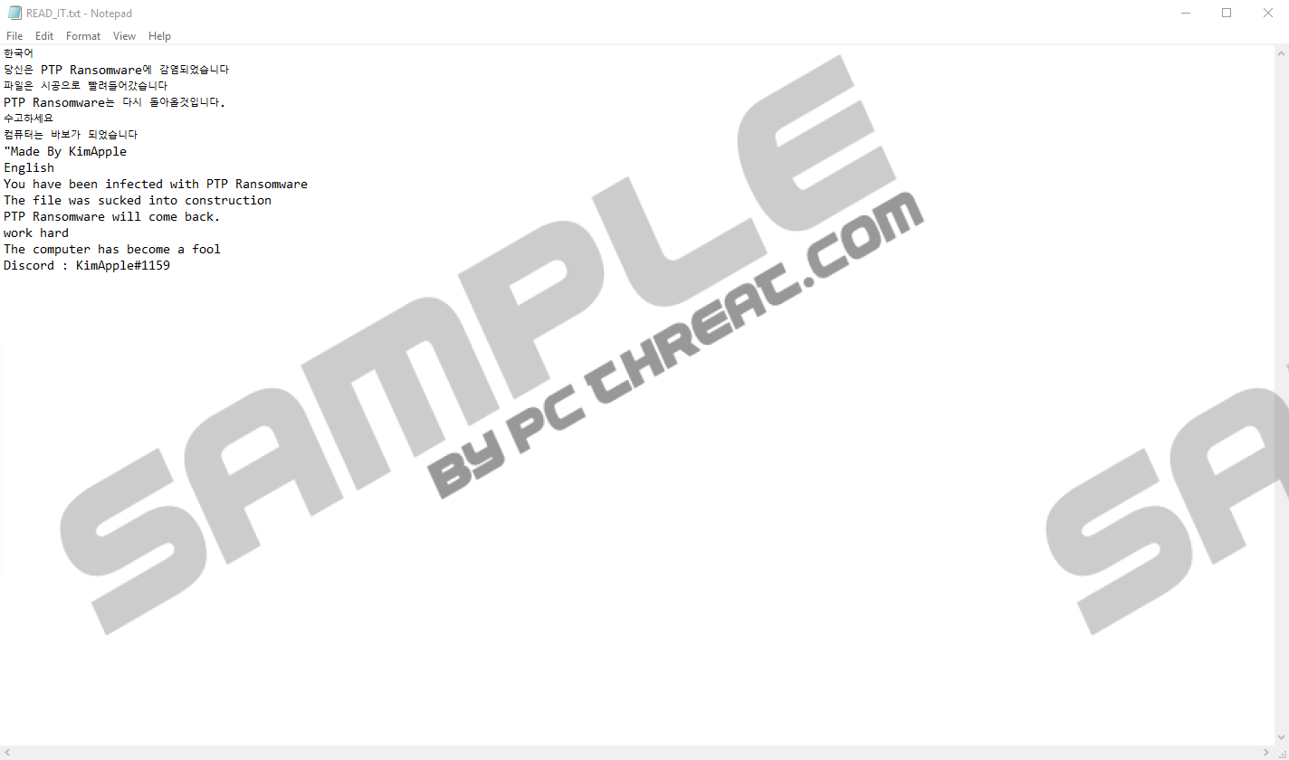 PTP RansomwareThe ransom note introduced to the victims of PTP Ransomware is presented in Korean, which is why it is believed that the infection was either created in Korea, or is targeted at users who live in this country. In the past, we have observed other threats with this specific target, including KoreanLocker Ransomware and Korean AdamLocker Ransomware. The first one was even created using the same open-source code (Hidden Tear) as the one used for the creation of the PTP malware. Our research team has analyzed the threat, and it is unlikely that it is fully functional at this point. If we are lucky, it will not become a serious threat in the future. That being said, we need to be ready, and we need to prepare potential victims. If you are yet to face this or any other ransomware, quickly back up ALL personal files and install a legitimate security tool. If your operating system and personal files were attacked already, there are certain things you need to do as soon as possible. It is most important, of course, that you remove PTP Ransomware. Do you receive lots of spam and strange emails? Even if you do not, one single corrupted email could change the story. It is believed that PTP Ransomware would spread primarily via email if it was active. How does that work? The attacker obtains your email address – which could be recorded with the help of phishing and social engineering scams, or obtained during a data leak – and then sends you a believable message. It could appear to be sent by a familiar package delivery company, and airline, or even your bank. If the message is believable, you could be tricked into opening an email attachment that, in reality, is the launcher of PTP Ransomware. Of course, we suggest deleting spam emails. Once executed, this malware should connect to a remote server to obtain a decryption key, but, at this point in time, a fake one is used, which indicates that it does not work yet. Maybe it is still in development, and maybe hundreds or thousands of Windows users will have to delete it from their operating systems in the future. That is still pretty much up in the air. After successful invasion, PTP Ransomware should go on to encrypt files, and our malware experts have found out that the threat is set to encrypt at least 859 unique types of files, including those with .doc, .ppt, .pdf, .java, .jpg, .mp3, and other extensions. Speaking of extensions, after encryption, the threat should add its own extension (“.PTPRansomware”) to all filenames. The final act should be the creation of the “READ_IT.txt” file, and it is most likely to be created on the Desktop. The current version of the message inside the file is available in both Korean and English, and it informs that the system was infected. No details are available, and it is not even clear that files are encrypted. That is something the user, apparently, has to figure out on their own. In most cases, of course, ransomware threats request ransom payments in return for alleged file decryptors. If PTP Ransomware was ever upgraded, it is likely to request the same thing too. Paying a ransom is NOT something anyone should do because all promises are empty and are only meant to trick gullible users into giving up their savings. PTP Ransomware does not really spread or exist in the real world, and there is a good chance that it will shift and change in the future. This is why the removal guide below is quite vague. Nonetheless, it might help you catch and delete PTP Ransomware manually. Of course, if we learn about any specific components or elements that require removal, this guide will be upgraded. Since manual removal is kind of uncertain, implementing anti-malware software is the better idea. It can detect and erase all malicious components automatically, which means that you do not need to do anything to clean your operating system. This can be especially helpful if other threats exist. The most helpful thing, however, is if you have your files backed up. If you do not, regaining access to encrypted data might be impossible. This is why backing up data is the most important thing to do, along with the installation of reliable anti-malware software. PTP Ransomware Removal
