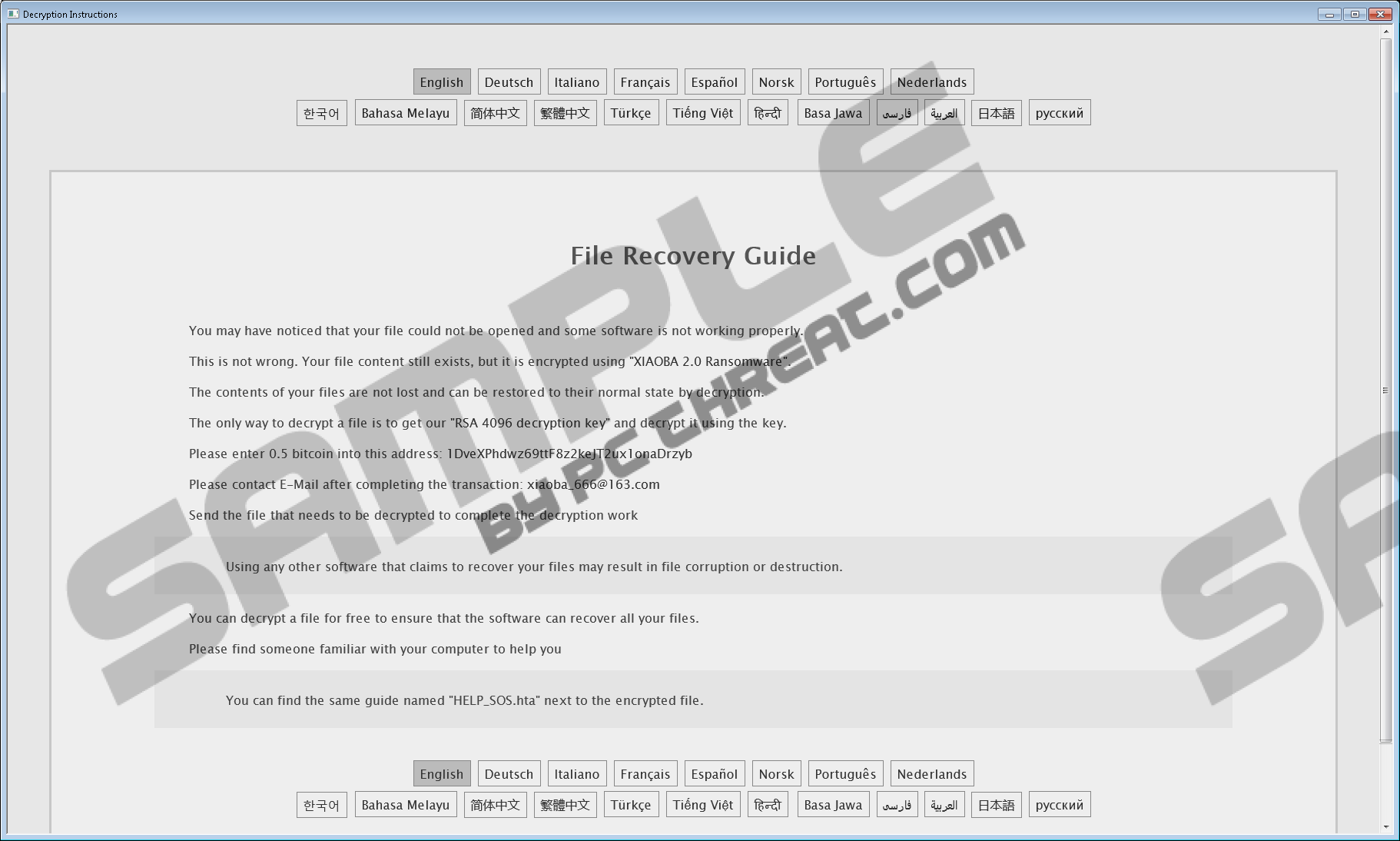 Xiaoba 2.0 RansomwareCyber criminals update malicious applications they create from time to time to increase their chances to obtain money. Xiaoba 2.0 Ransomware is an updated version of XiaoBa Ransomware, a threat that was spotted in the wild some time ago by malware researchers. Without a doubt, they still share the same goal of extracting money from users, so if this infection ever enters your system, it will lock your files with a strong cipher, and then will demand money from you for the decryption of affected data. We can only imagine how badly you need your files back, but we still cannot let you transfer money to malicious software developers in such an unfortunate event because the chances are high that your files will stay as they are, i.e. they will not be decrypted. You will not get your money back in this case. The ransomware infection will not leave your system too no matter what you decide to do. Luckily, it deletes itself after it locks personal data on affected computers, so the removal of components it leaves behind will be quick and easy. You can find more information about the Xiaoba 2.0 Ransomware removal in the final paragraph. Xiaoba 2.0 Ransomware starts working immediately after its executable is launched by the user. In other words, it encrypts personal files and then scatters a ransom note HELP_SOS.hta all over the affected computer. It locks almost everything, including media files and important users’ documents. All files it locks get this extension: .[xiaoba_666@163.com]Encrypted_(random id).XIAOBA. Therefore, it will be obvious which files have been locked on your PC if this nasty infection ever slithers onto your computer and encrypts your files. You will be offered to purchase a decryptor for 0.5 Bitcoin (~3240 USD), but we hope that you will decline it. As mentioned, there is nothing smart about transferring money to malicious software developers because they might not unlock a single file. Cyber criminals only want users’ money, so they might change their intentions and do not give users a decryptor/unlock encrypted data once the money sent is received. Xiaoba 2.0 Ransomware has been thoroughly analyzed by specialists working at pcthreat.com. Research has shown that this malicious application also deletes volume snapshots so that it would be impossible to use the so-called shadow copies to retrieve files. Free decryption software is not available too, meaning that it might be impossible to get files back without the decryptor cyber criminals have. It does not mean that you should hurry to purchase it from them. What we recommend for you instead is retrieving files from a backup (this will work only if you created copies of the most important files regularly). There is probably no need to say that users do not download malicious software on their computers consciously. Instead, threats slither onto computers illegally. As for Xiaoba 2.0 Ransomware, it is mainly distributed via malicious attachments spread via spam emails, according to malware researchers. Actually, it is the most common way to distribute all ransomware infections. It is, of course, not the only way to spread threats. Cyber criminals might drop malware on users’ PCs after they hack insecure Remote Desktop Protocol connections as well. Finally, users might download harmful threats from the web themselves. Unfortunately, they find out that the downloaded application is pure malware only after they notice the damage done. Being careful does not always help to avoid threats, especially sneaky malicious applications, so we highly recommend that you also keep an antimalware tool enabled on your computer. If malware ever tries to enter your system illegally, the automated antimalware scanner will make sure it cannot do that successfully. Xiaoba 2.0 Ransomware removes itself after it locks users’ files, but you will still have to erase several components it drops on affected computers yourself. This will be a piece of cake if you use our manual removal guide (see below). As you can see, you need to remove two files HELP_SOS.hta and HELP_SOS.vbs only and check for recently downloaded suspicious files. You should remove malware from your PC without difficulty, but, unfortunately, it will not be easy to unlock encrypted data. Yes, it will stay encrypted even if you fully erase the ransomware infection from your computer. Xiaoba 2.0 Ransomware removal guide