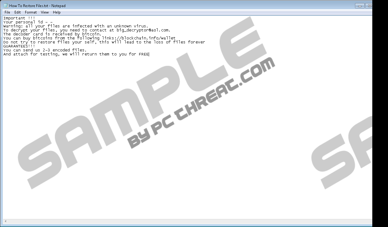 BDKR RansomwareBDKR Ransomware is an infection that attaches “id—[unique code].BDKR” extension to all of the files it encrypts. The bad news is that this malicious threat can encrypt lots of them. In fact, it was discovered that this piece of malware can encrypt every file on your system, unless it is stored in the %WINDIR% directory. The infection is very powerful, and if it invades your operating system, you are in big trouble. At least, right now you are. The infection is a new variant of an old infection know by the name “LockCrypt.” According to our malware research team, previous versions of this malicious threat were known to be decryptable, which means that free decryptors would be discovered or created to assist victims. A decryptor that would assist victims of the latest variant did not exist at the time of research, but you should definitely look into that if your personal files were corrupted, and you have no way of recovering them. While decryption might be the topic you are most interested in, we focus on the removal of BDKR Ransomware in this report. Even if your files were encrypted permanently, you must delete this infection. Spam emails, malicious downloaders, and unsecure remote access channels are among the most common backdoors used for the distribution of the malicious BDKR Ransomware. After it is executed, an encryption key is created to start the encryption process. Afterward, a copy called “searchfiles.exe” – although we cannot guarantee that the name would not be changed – is created in the %WINDIR% directory. The same one that the infection does not touch. A point of execution for this file (“searchfiles”) is created in the HKLM\SOFTWARE\Microsoft\Windows\CurrentVersion\Run registry. So, even if you remove the original launcher of the ransomware, you will not stop it unless you remove the copy as well! Another component created by the infection is a ransom note file called “How To Restore Files.txt.” Copies of this file are dropped everywhere, and you should delete every single one. Just like the executable file, the main TXT file has a point of execution called “unlock” in the same location. Besides encrypting files and creating new ones, BDKR Ransomware also kills launched applications. Luckily, the infection does not affect the Task Manager, and that makes it easier to terminate malicious processes and remove the infection. The “How To Restore Files.txt” file created by BDKR Ransomware is not dangerous to open, but the message can be very dangerous. The purpose of it is to convince you that you need to obtain a “decoder card,” which you, allegedly, can do by sending a message to big_decryptor@aol.com. The ransom note tries to make you believe that your files were infected by a virus, but you would not need a decoder if that was the case, and so it is clear that your files were encrypted. Also, it is suggested that the “card” would have to be purchased with Bitcoins, and while the exact sum is not revealed, surely, it would be after you sent the email. We do not advise corresponding with cyber criminals, paying the ransom, downloading files, or doing anything else in relation to BDKR Ransomware. You do not want to be scammed even more, and if you put your money down towards the decryptor card, there is little doubt that you would not get anything in return for it. Keep it and invest it in reliable anti-malware software instead. Manual removal of BDKR Ransomware might entice you, but you have to be smart about what you do. Even if you are able to delete the infection manually, your operating system will remain weak and vulnerable, and that is something to think about. If you decide to delete BDKR Ransomware using the guide provided by our malware experts, you want to make sure that you take appropriate steps to protect your operating system. At the end of the day, you really want to employ anti-malware software, and if you agree with us that it is time to do it, you do not need to worry about the elimination of the ransomware because the anti-malware software you download will get rid of it automatically. If files cannot be decrypted, hopefully, they can be restored from backups. If you did not back up your files before, we suggest you do that in the future to ensure that files are not lost even if your PC gets corrupted by malware again. BDKR Ransomware Removal