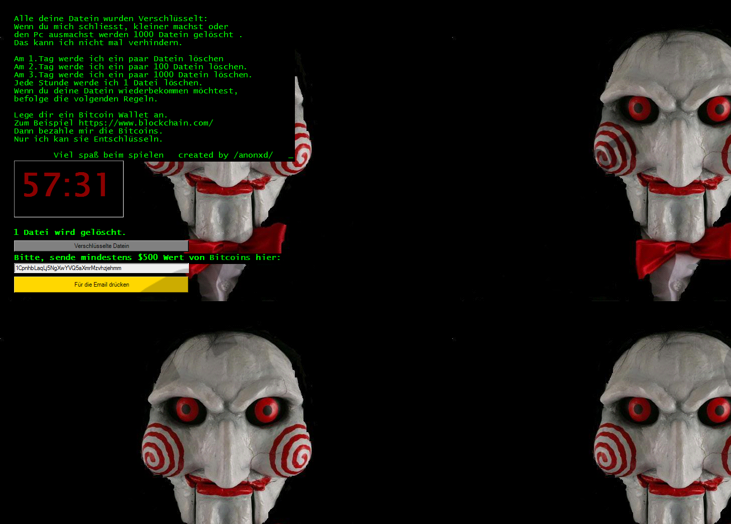 German Jigsaw .spaßThe German Jigsaw .spaß ransomware is a malicious threat that, as it was discovered, is a variant of the infamous Jigsaw Ransomware. This particular variant has been created to target German Windows users, which is why that is included in its “official” name. The “.spaß” part represents the unique extension that the threat adds to the files it encrypts. Just like its predecessor, this malicious infection encrypts files. That is its main task. If the infection is executed correctly, and files are encrypted, it can then be used to demand a ransom payment, which is the only reason this malware was created in the first place. Unfortunately, victims of this infection might be pushed against a wall by it, and they might agree to pay the ransom, which is the last thing our research team recommends doing. Overall, whether or not you pay the ransom, you cannot forget to remove German Jigsaw .spaß ransomware. Hopefully, you can delete the infection without dire consequences, but if you end up losing your files, take this is a lesson; even if it is an incredibly painful one. According to our malware analysts, the functionality of the German Jigsaw .spaß ransomware does not differ much from the older variants. For example, it continues to copy itself in the same two locations, %LOCALAPPDATA%\Drpbx\ and %LOCALAPPDATA%\Google (x86)\. You can find drpbx.exe in the first folder, and Chrome32.exe in the second one. This file also has a point of execution in the RUN registry (HKCU\Software\Microsoft\Windows\CurrentVersion\Run | Chrome32.exe). So, even if you delete German Jigsaw .spaß malicious launcher right away, the infection will prevail due to these copies and the RUN key. If it functions properly, the infection is meant to start encrypting files right away, and it can affect over 120 types of files (including .jpg, .gif, .png, .bmp, .rar, or .zip,) in various locations. It can even encrypt files in the %PROGRAMFILES% directory. Once encryption is complete, you cannot open the files, but you can see which ones were encrypted because of the “.spaß” extension attached to their names. This might be when you realize that you need to remove malware. If you do not notice the encrypted files, you should realize that you need to delete German Jigsaw .spaß ransomware once it launches a window with the ransom note. This note is accompanied by the scary image of jigsaw and a timer that gives you 60 minutes. According to the message – which, of course, is in German – the victim needs to send $500 worth of Bitcoins to a Bitcoin Wallet set up by cyber criminals. This wallet address is 1CpnhbLaqLj5NgXwYVQ5aXmrMzvhzjehmm, and no one has transferred any money to it yet. The ransom note informs that if the victim does not pay the ransom, malware can start deleting encrypted files in batches after the first 60 minutes run out. It also claims that files would be deleted if the victim were to close the ransom note window. Is that the truth? Should you believe these claims? At the end of the day, even if you pay the ransom, the chances of you getting your files decrypted are slim to none. Therefore, instead of worrying about how to deal with cyber criminals, we suggest focusing on the removal of German Jigsaw .spaß malware. Will you lose your chance to decrypt files if you delete German Jigsaw .spaß malware? Well, it is unlikely that you have this option at all, and that is why you should not hesitate to eliminate this threat right away. Although decryption is unlikely to be possible, you might be able to restore your files from a backup. If copies of your files are stored on an external drive or a virtual cloud, all you need to do is remove German Jigsaw .spaß malware and then replace the corrupted files with their copies. Of course, if you choose to do this, delete the corrupted files first because you want to free up space. As for the removal of the ransomware, you have two options. You can eliminate it yourself using the instructions posted below, or you can rely on a legitimate anti-malware program. We suggest going with the second option because you also need the protection this program can provide you with. Also, do not forget to back up your files in the future if you want to guarantee that they are safe! German Jigsaw .spaß Ransomware Removal