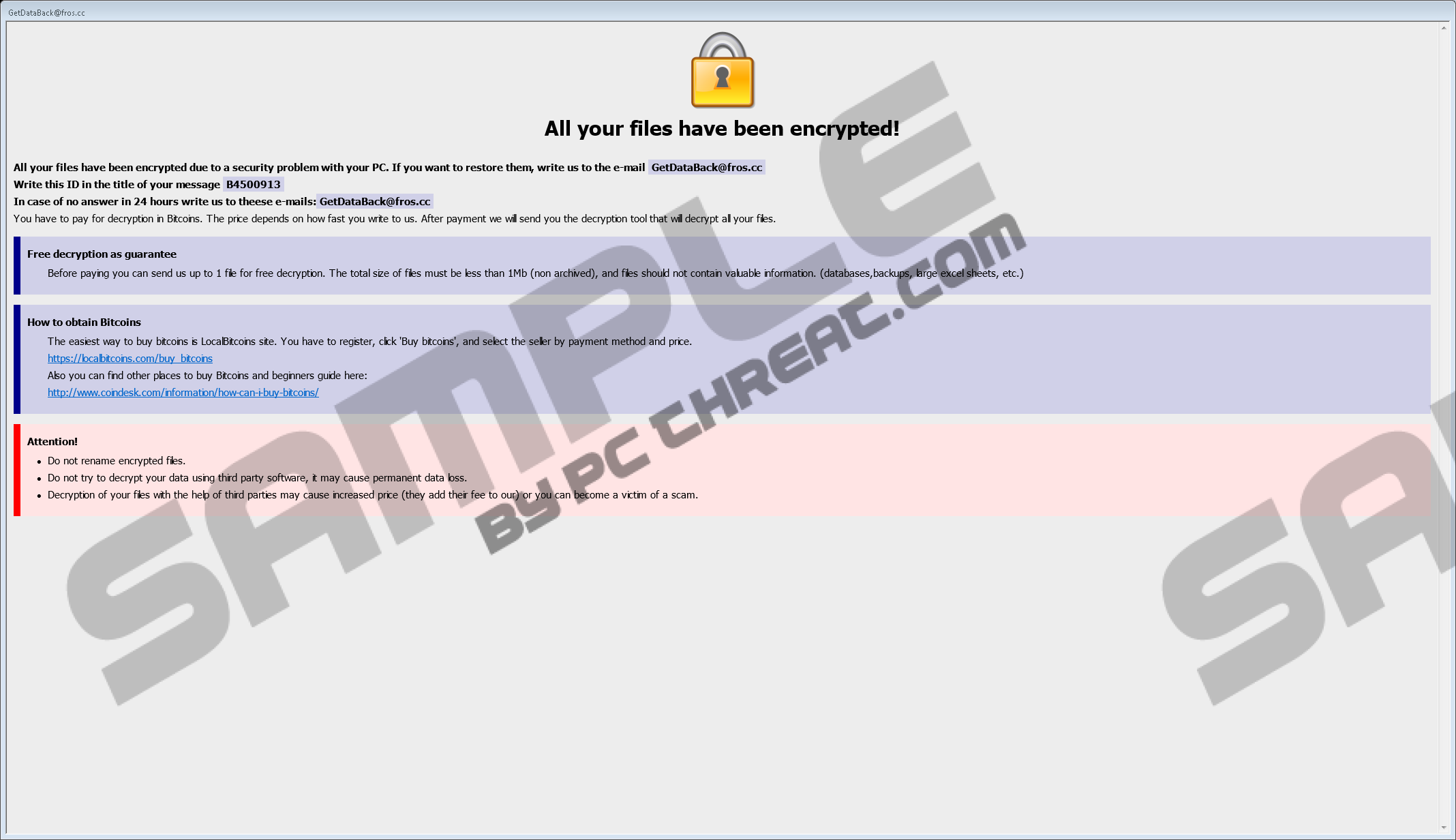 getdataback@fros.cc Ransomwaregetdataback@fros.cc Ransomware is a threat that will turn your world upside down – it will lock all your files, including your documents and pictures you have been collecting all your life if you ever encounter it. Usually, it infiltrates those computers that do not have any security application installed on the computer. If you are one of those users who open email attachments even if they know that this is a dangerous practice, you might encounter this computer threat too in no time. No matter how getdataback@fros.cc Ransomware infiltrates your computer, you should remove this ransomware infection right away. Of course, if you are going to pay money to cyber criminals, you should make a payment first. If you ask us, there is nothing worse than sending money to malicious software developers. Yes, they promise that they will make it possible to decrypt files encrypted by getdataback@fros.cc Ransomware after they receive money, but, to tell you the truth, this might be a pure lie. There is probably no need to say that cyber criminals cannot be trusted. They only want victims’ money, so there is a huge possibility that they will refuse to unlock files for you. getdataback@fros.cc Ransomware is not the most sophisticated computer threat even though it has many components. Once it enters the system, it locks users’ personal files (they get the .id-B4500913.[GetDataBack@fros.cc].gdb extension appended) it manages to find, and then launches a window on Desktop. Luckily, it can be closed without difficulty – you just need to kill the malicious process using Task Manager. Ransomware infections are developed by malicious software developers with the intention of obtaining money from users, so we are 100% sure that getdataback@fros.cc Ransomware does that for the purpose of extracting money from users who fall victim to this infection too. You will see this for yourself if you read the ransom note the malicious application opens: “You have to pay for decryption in Bitcoins.” Users find out that it is the only working way to get their files back and rush to send money to cyber criminals, but this is definitely not what we suggest that you do if you have encountered getdataback@fros.cc Ransomware and your files have been encrypted. There are no guarantees that you could unlock your files even if you pay a ransom, so you should try out alternative data recovery methods instead. To be more specific, you should restore your files from a backup, or, for example, use available file recovery tools. Of course, we cannot promise that you will fix many files with the help of a free recovery tool. All ransomware infections are distributed similarly. getdataback@fros.cc Ransomware should be spread using standard distribution methods as well, according to researchers who have analyzed it. In other words, it should also be spread via emails as a legitimate-looking email attachment. Also, it might pretend to be trustworthy software to convince users to download it themselves from the web. Finally, it might be distributed by other infections, so make sure they cannot enter your system and drop getdataback@fros.cc Ransomware on your PC – install a security application on your computer. As long as you keep it installed, no threats will bother you. Make sure you do not forget to install all updates your security tool gets in order to protect yourself against all the newest infections as well! You cannot be careless either – do not forget that your virtual security highly depends on your actions and habits. You cannot keep getdataback@fros.cc Ransomware active on your system even if this nasty infection has already locked all your personal files because it creates an entry in the Run registry key, meaning that it stays active after the encryption. As a consequence, the chances are high that it will lock more files on your PC and bring more security-related problems if you decide not to do anything about its presence on your computer. The malicious application can be removed either manually or automatically. Needless to say, it will take more time to remove getdataback@fros.cc Ransomware manually. Of course, the choice is yours. Delete getdataback@fros.cc RansomwareKill the malicious process before deleting malicious components