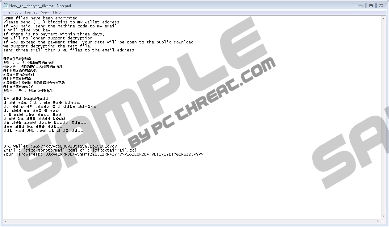 Sicck RansomwarePhotos, family videos, work documents, file archives, and various other kinds of files might be encrypted by Sicck Ransomware if this malicious threat finds its way into your operating system. The infection, according to our researchers, is most likely to be introduced to Windows users via file attachments sent via misleading spam emails. If the infection corrupts a computer that is part of a larger network, it can scan that network to see if other vulnerable computers exist. Specifically, the infection looks for outdated systems with a Shadow Brokers SMB vulnerability. It can be exploited by the ransomware to spread inside the network. It has been used for the attacks of the well-documented WannaCry Ransomware as well. Of course, there is no need to explain that deleting Sicck Ransomware is important, but if you do not know what you need to do before that, you should continue reading. In this report, you will also find useful information on the different removal methods you could employ. The goal that the creator of Sicck Ransomware has is to trick the victim of the infection into thinking that they can purchase a decryptor/decryption key. During the encryption, the ransomware modifies the files to make them unreadable, and it also changes their names. While the original name and extension remain, they are sandwiched by two extensions created by the infection. The first one - [sicck@protonmail.com] – is put at the front, and the second one – .sicck – is appended at the end. There is nothing you can do manually to restore these files back to normal. If you have backups online or on external drives – which is your only option of “recovering” them – you want to delete the copies corrupted by Sicck Ransomware, remove the infection itself, and then, if you need it, transfer the backup copies onto the clean computer. Unfortunately, victims who do not have backups might think that they can recover files by paying the ransom requested by the infection’s developer. The ransom is set at 1 Bitcoin. During the extent of our analysts, 1 BTC converted to around 4000 US Dollars. That is not the kind of money you want to waste, do you? Unfortunately, you would be wasting it by paying the ransom. The developer of Sicck Ransomware requests the ransom via a file named “How__to__decrypt__files.txt.” The request is represented in English, Chinese, and Korean, which suggests that the attackers are ready to target Windows users all over the world. The ransom note instructs to send the ransom in 3 days to a dedicated Bitcoin Wallet (3QxVmxcyVcqDpuVJ8QTSy83BbWvZvCoYcV). So far, no one has transferred money, which is good news. If you were the pay the ransom, you would also be asked to email sicck@protonmail.com and sicck@airmail.cc for confirmation, which would expose your email address too! Without a doubt, we do not recommend getting involved. Cyber attackers have malicious intentions only, and their promises to decrypt files are, most likely, empty. Unfortunately, it appears that the only thing you can do is remove Sicck Ransomware. The instructions you can see below are designed to help you understand the manual Sicck Ransomware removal process. As you can see, we cannot give you the exact name or location of the file that executes the threat, and that is because this is pretty random. The filename can be unique in every case, and the location depends on where, for example, you open email attachments. If you are inexperienced, deleting Sicck Ransomware manually might be quite challenging. The good news is that you do not actually need to remove the threat manually. Instead, you can use anti-malware software. Reliable and legitimate software can automatically erase all existing threats and ensure that you do not leave anything behind by accident. That is definitely something you need to think about if you proceed with manual removal. While the ease of removal is definitely a good reason to install anti-malware software, it is most useful in terms of protection against malware attacks in the future. If you do not want to deal with ransomware and other threats in the future, go ahead and install trustworthy anti-malware software ASAP. Sicck Ransomware Removal