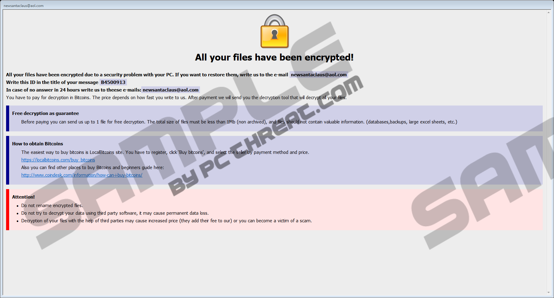 newsantaclaus@aol.com RansomwareIf newsantaclaus@aol.com Ransomware has revealed itself, your files must be encrypted. When this threat is done with the encryption of your files, it launches a window with the email address as its title. It is also the email address that the attackers want you to use to communicate with them. Needless to say, this is where the name of the infection itself comes from. Although you might think that it is unique, our research team indicates that it was created using the Dharma/Crysis Ransomware engine, which has also been used to create skynet45@tutanota.com Ransomware, raphaeldupon@aol.com Ransomware, and a number of other similar threats. They all function in the same manner, but, at the same time, we need to look at them as unique infections too. If you continue reading, you will find information that will help you understand and remove newsantaclaus@aol.com Ransomware from your operating system. If you need answers to questions that have not been answered in this report, post them in the comments section so that our research team could assist you shortly. It is always hard to discuss the distribution of ransomware because that is not a constant variable. Some threats are spread via spam emails, while others can be executed using remote access. Also, it is known that some Trojans and other kinds of malware can download and execute malware too. It would be great if you knew how newsantaclaus@aol.com Ransomware entered your operating system, because that would increase your chances of successfully deleting the threat manually. Of course, that is not the only option you’ve got, and you should not panic if you cannot find and remove newsantaclaus@aol.com Ransomware launcher file manually. Speaking of finding things, you do not need to look for an explanation when you realize that your personal files are encrypted (note that the files that are affected should have the “.id-[ID].[newsantaclaus@aol.com].santa” extension appended to their names). The threat launches the “newsantaclaus@aol.com” window as soon as the attack on your files is complete. This window is launched using an .exe file created in the Startup folder, and if you do not delete it, the window with the ransom note will appear every time you start Windows. The ransom note is identical to the ones used by newsantaclaus@aol.com Ransomware. It declares that files are encrypted due to a security issue and then instructs to email newsantaclaus@aol.com to get more information on how to restore files. The victim has 24 hours to send their unique ID code and a message, after which, they need to pay a certain amount in Bitcoins as a ransom. It is suggested that a decryption tool would be given in return for this ransom. Can you trust cyber criminals? If you think you can, you are very naive. They know what their victims need, and it is their goal to promise anything and everything just to make them think that they can restore files. Can they? Decrypting files is not an easy task, and a decryption key that was created along with the encryption key is necessary. It is not in the interest of cyber attackers to share it, and they are not obligated to do it once the victim pays the ransom for it. Unfortunately, that is the dirty game that ransomware creators play. As we discussed earlier, not everyone will be able to delete newsantaclaus@aol.com Ransomware manually. What if you are one of those victims who cannot handle the threat? If that is the case, you can use an anti-malware program. In fact, even those who can remove newsantaclaus@aol.com Ransomware manually should install this program. Why? There are several reasons. First of all, the program can find and erase malicious threats automatically, and that is done fail-proof, which means that you do not need to worry about leftovers. Second, the program can protect you, your files, and your entire operating system against malicious threats in the future. Since there are thousands of threats that could try to attack you, you really should invest in virtual security. Hopefully, your files can be saved due to existing backups, but if that is not the case, remember to back up files to prevent losing them again. newsantaclaus@aol.com Ransomware Removal