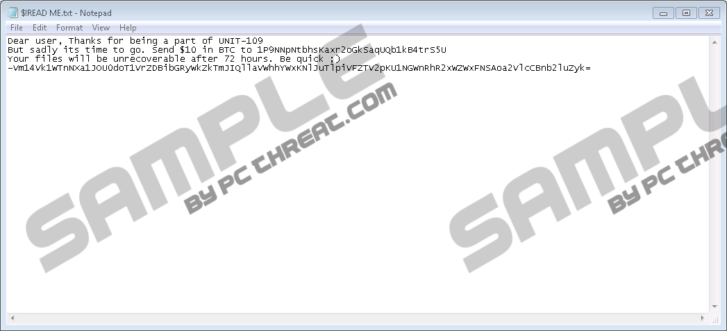 Unit09 RansomwareUnit09 Ransomware is a computer infection that deletes personal files. It may present itself as a ransomware program, but the reality is that it is a wiper. Therefore, paying the ransom would not restore your files. Your best solution, in this case, would be an external hard drive or a file backup. If you do not have one, you may have to start anew, but before you do that, do not forget to remove Unit09 Ransomware from your computer for good. Scroll down to the bottom of this description for the manual removal instructions, and do not forget to safeguard your system against other threats. Perhaps the most annoying thing about such infections is that it is sometimes hard to pinpoint how Unit09 Ransomware and other similar programs enter target systems. We do know for sure that the most common ransomware distribution method is spam emails. Users probably encounter spam or phishing emails every single day, but they are seldom aware of that. For the most part, we tend to ignore messages from unfamiliar senders that we receive in our inboxes. However, sometimes users may feel inclined to open a particular email and to check its contents because of the subject line. It is important to remember that spam email that distributes Unit09 Ransomware and other types of ransomware often comes with attached files. Downloading and opening those files allows malware to slither into your system. Therefore, you have to refrain from opening files that come from unknown sources. If you feel that you have to check a certain file no matter what, you might want to scan it with a security tool before opening it. This way, you would definitely avoid a malicious infection. Nevertheless, if Unit09 Ransomware still manages to enter your computer, you will notice it immediately. This program encrypts target files by overwriting then with random bytes. Normally, a crypto-ransomware infection generates an encryption key that, in theory, should help users unlock their files. With this encryption key, ransomware programs demand a ransom payment, saying that they will give users the decryption key once they transfer the money. Unit09 Ransomware has nothing of the sort. It doesn’t even seem like the program was created to generate encryption keys because the malware is coded in the .NET language and the overall file size is only 8KB. Thus, the program is called a wiper because it merely destroys your files without leaving any opportunity to reclaim them. Computer security specialists say that it is not possible to recover files affected by Unit09 Ransomware unless you have a proper file backup. What’s more, even though the program does not have a decryption key, it still displays a ransom note. The ransom note is dropped in every affected folder. The filename says $!READ ME.txt, and the note says the following: