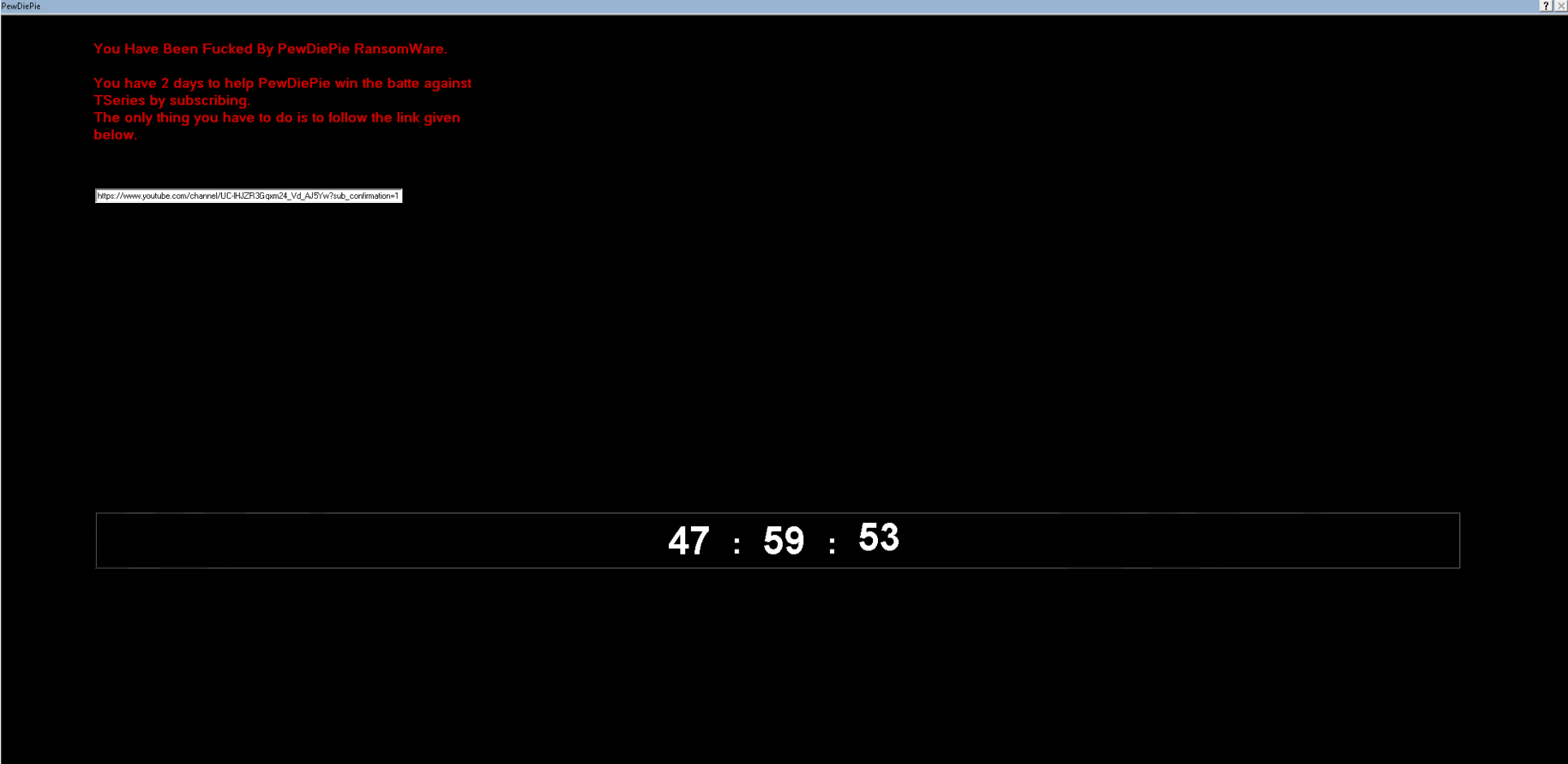 PewDiePie RansomwarePewDiePie Ransomware is a malicious application that was created to help a well-known YouTube channel titled PewDiePie gain more subscribers. If you have not heard about it yet, there is a battle between the mentioned channel and a channel belonging to an Indian company called T-Series. It looks like some of the PewDiePie’s fans took it rather seriously as they even started creating malicious applications that could help increase the number of subscribers by force. On the other hand, our researchers say the malware is not as harmful as most ransomware applications. It only locks the user’s screen, which makes it more annoying than dangerous. Nevertheless, it does not mean you should put up with it. On the contrary, if you encounter this threat, we recommend taking back control over your computer at once. To eliminate PewDiePie Ransomware, you should check the instructions available at the end of the article. Nevertheless, if you would like to find out more details about it, we invite you to have a look at our full report. For some users, the appearance of PewDiePie Ransomware might be a complete surprise, although if you know opening data that is questionable could lead to infecting your computer, you should not be so shocked. What we mean to say is cybersecurity specialists always warn users not to open files that come from unknown or unreliable sources, such as email attachments or software installers. Unfortunately, some users forget all warnings or cannot image catching a malicious application themselves. The truth is that it can happen to anyone. The malicious file might not even look harmful, which is why users should always be careful. It is vital to understand hackers keep looking for new ways to trick us into opening malware installers, so reading cybersecurity articles and knowing what to expect is crucial to anyone who does not want to receive malware. No doubt it is best not to download data from sites where it could be malicious or interact with email attachments received under suspicious circumstances. Even if you do not see anything suspicious about the file (coming from an unreliable source), you should scan it first. It will not take long to check it with a reliable antimalware tool and doing so could help you dodge a bullet. There are far more vicious screen lockers and ransomware applications than PewDiePie Ransomware out there. Therefore, if this is the first such threat you have received so far, you may consider yourself lucky. If PewDiePie Ransomware was a vicious threat, it could encrypt the user’s data and ask for a ransom in exchange for decryption tools or even make the computer unbootable. Luckily, it only locks the user’s screen to show a particular message. According to it, the victim has to help PewDiePie in a battle against T-Series, and to do so he has to subscribe to this specific channel. To complete this task the malicious application’s developers give the user 48 hours. It is unsaid what might happen if the victim does not subscribe. It is likely nothing will happen, although the malware could keep blocking the screen. Another thing you ought to know is if you restart the device, the screen should be locked again. Apparently, PewDiePie Ransomware may place its copies in a few Startup folders, and consequently, the system should load it after a restart. What’s more, the malware can block Task Manager to prevent the user from killing its process. Thus, removing the screen locker requires restarting the infected device in Safe Mode. Our researchers recommend picking Safe Mode with Networking to have access to the Internet so that in case erasing PewDiePie Ransomware becomes too challenging you could download a reliable antimalware tool and leave this task to it. The instructions located below will show how to reboot in Safe Mode with Networking and how to eliminate the threat manually if you feel you are up to such a task. Restart the computer in Safe ModeWindows 8/Windows 10
