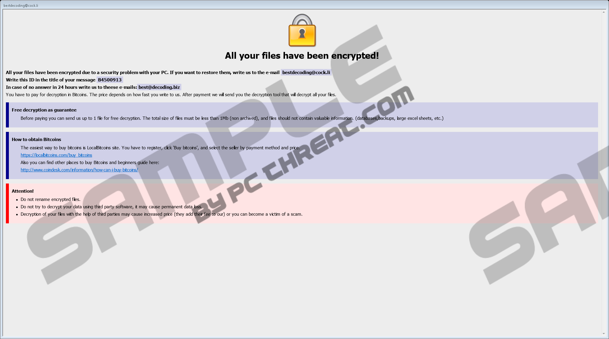 Bestdecoding@cock.li RansomwareBestdecoding@cock.li Ransomware is a new Crysis/Dharma Ransomware version. Same as with the previous variant its goal is to encrypt user’s data and show a message with demands for a ransom. Files that get enciphered become useless without decryption tools, but we would not recommend purchasing them from the malware’s developers. They may promise you anything, but in reality, you cannot know if they will do the right thing. In other words, there is a chance they might not deliver the needed tools or try to ask for even more money. For those who do not want to take any chances, we advise removing Bestdecoding@cock.li Ransomware from the system. The steps available below the article should help you get rid of it manually. Of course, users who would like to learn more about the malicious application first should read the rest of the text. There is a couple of ways of how Bestdecoding@cock.li Ransomware could be spread. For instance, its developers might be sending its installer to targeted victims via email. Therefore, cybersecurity specialists often recommend not to interact with attachments or links coming from unknown senders, especially if it comes as Spam. The first thing you should do is ask yourself whether you were expecting to receive the email. Then check the sender’s email address. For example, if the sender pretends to represent some company, it should be easy to check if the mentioned organization uses a particular email address. Another extra precaution we advise is scanning suspicious content with a reliable antimalware tool first. You should scan not just email attachments, but any other files received from untrustworthy sources, such as installers from file-sharing web pages or pop-up advertisements. Before starting the encryption process, Bestdecoding@cock.li Ransomware should create a couple of copies of its launcher in the %WINDIR%\System32 and few other folders. Plus, the malware is supposed to create a few Registry entries that ought to make the infected computer launch the malicious application and its ransom note with the operating system. It means, restarting the device could result in relaunching the malware. Users should keep in mind, this could mean the threat might start its encryption process once again with each restart. Thus, if the user creates any new data that was not enciphered before, it could become affected too. Sadly, Bestdecoding@cock.li Ransomware can encrypt a lot of various file types, for example, pictures, text document, videos, etc. It is easy to separate encrypted data, as each affected file is supposed to be marked with the malware’s extension. This version’s extension is id-{8 random characters}.[bestdecoding@cock.li].best, for example, a file called picture.png could turn into picture.png.id-B4500913.[bestdecoding@cock.li].best. As soon as all targeted files are enciphered and have the mentioned extension, Bestdecoding@cock.li Ransomware should open a ransom note. It looks almost identical to other ransom notes displayed by threats from the same ransomware family. The note claims the user has 24 hours to contact the malicious application’s developers. The hackers ask to do so because the note does not so how much to pay or how to transfer the money. As usual, there is a mention of getting a single file decrypted free of charge. Ransomware creators often suggest it, to prove the user they have the needed decryption tools. The problem is, even if they do have these tools, there are no guarantees they will deliver them. As you see, Bestdecoding@cock.li Ransomware’s creators will most likely ask paying the ransom first, and they wish to be paid in Bitcoins to remain anonymous. Therefore, the moment the malware’s developers get their money they can take them whether they send the promised tools or not. Naturally, if you do not want to pay to the hackers, we advise you to remove Bestdecoding@cock.li Ransomware from the system. To get rid of it manually users should follow and complete the instructions available a bit below. Provided, the task seems too complicated, it might be better to employ a reliable antimalware too that could eliminate the threat for you. Erase Bestdecoding@cock.li Ransomware