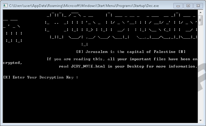 JCry RansomwareJCry Ransomware is a malicious application that was supposed to be distributed during the so-called #OpJerusalem attack. Its initiators were targeting popular Israeli websites that after being affected were supposed to show fake messages asking to update a particular plugin, but instead of downloading it, the infected site was supposed to install the malware. Luckily, there was a severe flaw in the hackers’ code, and the plan failed. Further, we will explain why the attack was unsuccessful as well as talk about what JCry Ransomware could do if it entered the system. Moreover, at the end of the article, we will place removal instructions showing how to eliminate this malicious application manually. The process is not particularly complicated, but we always recommend using a reliable antimalware tool instead if the task seems too difficult. Not to mention a security tool can clean the computer from other possible threats and guard it against various infections in the future. Cybersecurity specialists report the cybercriminals behind JCry Ransomware and the so-called #OpJerusalem attack planned to modify the DNS record used by a popular plugin from nagich.com. As a result, users visiting web pages using this particular plugin were supposed to receive a fake message loaded by a malicious script. This script was designed to check if the victim’s device was running Windows. If the computer appeared to be running Windows, the script would then display a fictitious Adobe Flash Player update message urging to update the plugin. However, there was a flaw in the script's code that made it fail to determine whether the device was running Windows or not. Consequently, instead of the fictitious warning, the infected websites displayed a black page with red text saying: “Jerusalem is the capital of Palestine,” signed by #OpJerusalem. Otherwise, the malware could have infected lots of computers. If the script had no flaws the sites loading it would have suggested downloading and launching JCry Ransomware’s installer that might be called flashplayer_install.exe. Once started the file should create two executable files named dec.exe and enc.exe, one text document titled PersonalKey.txt, and a script called msg.vbs in the %APPDATA%\Microsoft\Windows\Start Menu\Programs\Startup folder. Some of these files delete themselves right after they complete their tasks, while others ought to stay on the system. Soon enough, the threat should start encrypting various data available on the computer. It should be easy to recognize enciphered files since JCry Ransomware marks them with the .JCry extension, for example, picture.jpg.JCry. Eventually, when the encryption process is finished, the malicious application should drop a file titled JCRY_Note.html on the victim’s Desktop. The mentioned text document (JCRY_Note.html) is malware’s ransom note. In other words, it contains instructions or demands from the hackers who created the threat. Apparently, they want to get 500 US dollars in Bitcoins in exchange for decryption tools or to be more precise, a unique decryption key. The instructions explain that the key will be uploaded on a particular website, which victims can load on Tor browsers. Needless to say, there are no guarantees the hackers responsible for JCry Ransomware will hold on to their promises and upload the needed decryption tools as promised. Therefore, we would not recommend putting up with any demands if you do not want to put your savings at risk. All in all, even though the hackers failed to distribute the malware this time, it is entirely possible they could be more successful the next time. Not to mention, the malicious application’s developers could pick easier distribution methods, such as sending targeted victim’s infected email attachments. Knowing this, we would recommend being extra cautious, and if you do encounter JCry Ransomware, we hope our article will help you decide what the best course of action is. In case you choose to erase the threat we can offer the manual deletion instructions available below, although it might be easier to use a reliable antimalware tool. If the hackers make any changes to the malicious application, the provided instructions may no longer work, but a trustworthy security tool should remove it with no trouble. Erase JCry Ransomware