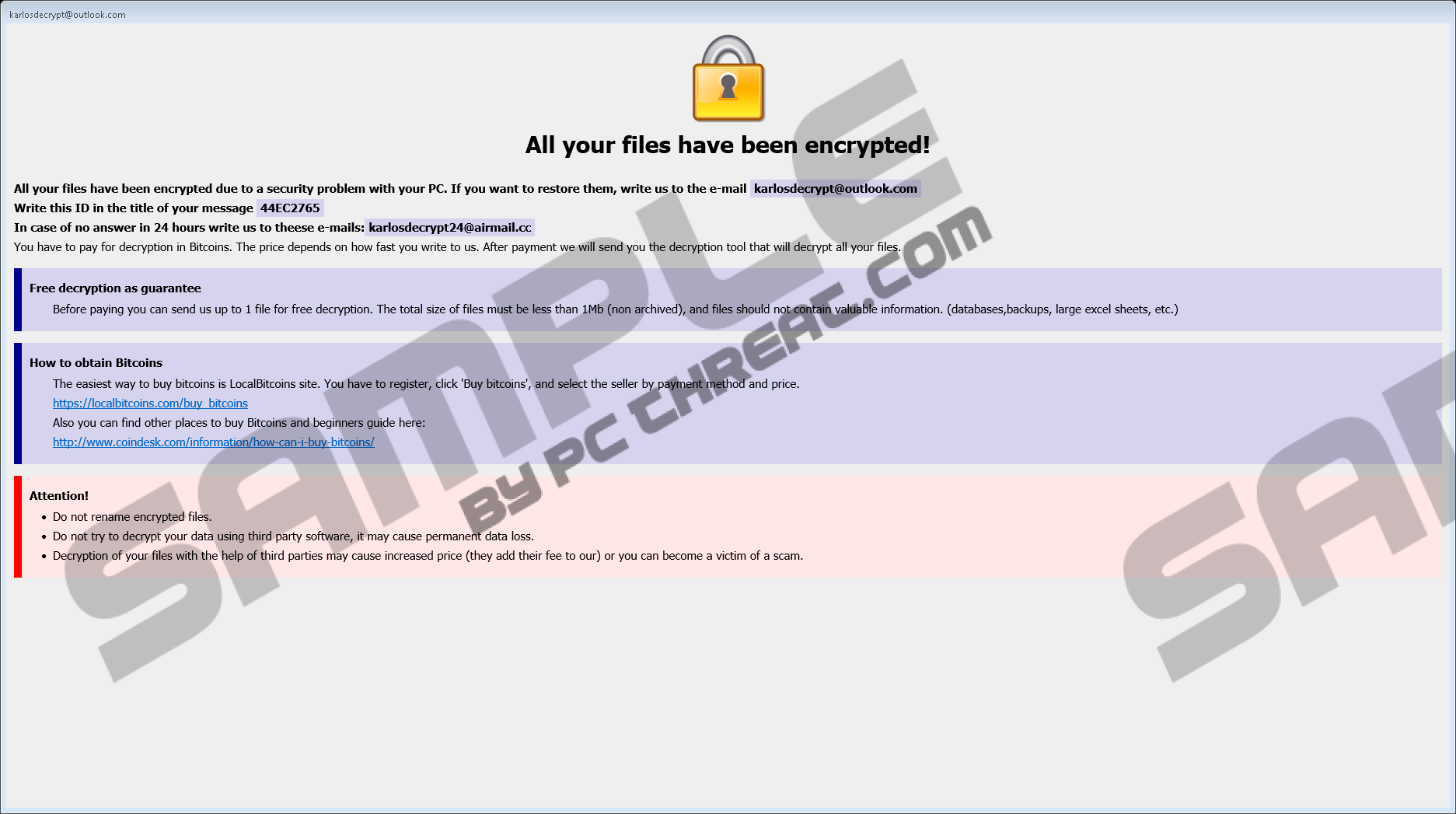 Karlosdecrypt@outlook.com RansomwareNo one wants to deal with ransomware because these are terribly dangerous programs, but we are here to tell you what you should do when the likes of Karlosdecrypt@outlook.com Ransomware manage to enter your system. It is very likely that you may have to wave bye-bye to your personal files, but that is no reason to panic or despair. In this age of cloud computing, you can easily start anew, and your main aim right now is to remove Karlosdecrypt@outlook.com Ransomware from your computer as soon as possible. If you do not want to go through the process yourself, you can leave it to a licensed antispyware tool. Although this program is extremely dangerous and annoying, we cannot offer a lot of pieces of unique information regarding it. The point is that Karlosdecrypt@outlook.com Ransomware works just like most of the ransomware programs out there, so it will try to reach you through the same distribution channels that are usually employed by other programs, too. The most common ransomware distribution method is spam email attachments. It means that Karlosdecrypt@outlook.com Ransomware reaches you through your inbox, and you actually download and install this program yourself. Of course, no one in their right state of mind would ever install a ransomware program, so how does that happen? It happens because spam emails that carry ransomware installers tend to look like something legitimate. For instance, sometimes the ransomware installer file may look like an invoice from an online store. If you are an avid online shopper, you may feel inclined to open the supposed invoice without even checking whether you really have ordered something like that recently. Either way, Karlosdecrypt@outlook.com Ransomware or other similar programs tend to trick users into the sense of urgency, making them think that they have to open certain attachments immediately. However, the moment that happens, ransomware infects the target system, and then everyone has to deal with the consequences of this infection. But what if you really have to open the attached file? Well, you can always scan the file with a security tool of your choice. If the file is corrupted, an updated security program will let you know immediately. This way, you would avoid serious infection. Yet, if Karlosdecrypt@outlook.com Ransomware still managed to enter your system, you will see that this program quickly launches the file encryption, and once the encryption process is complete, the program displays a ransom note, which says the following: