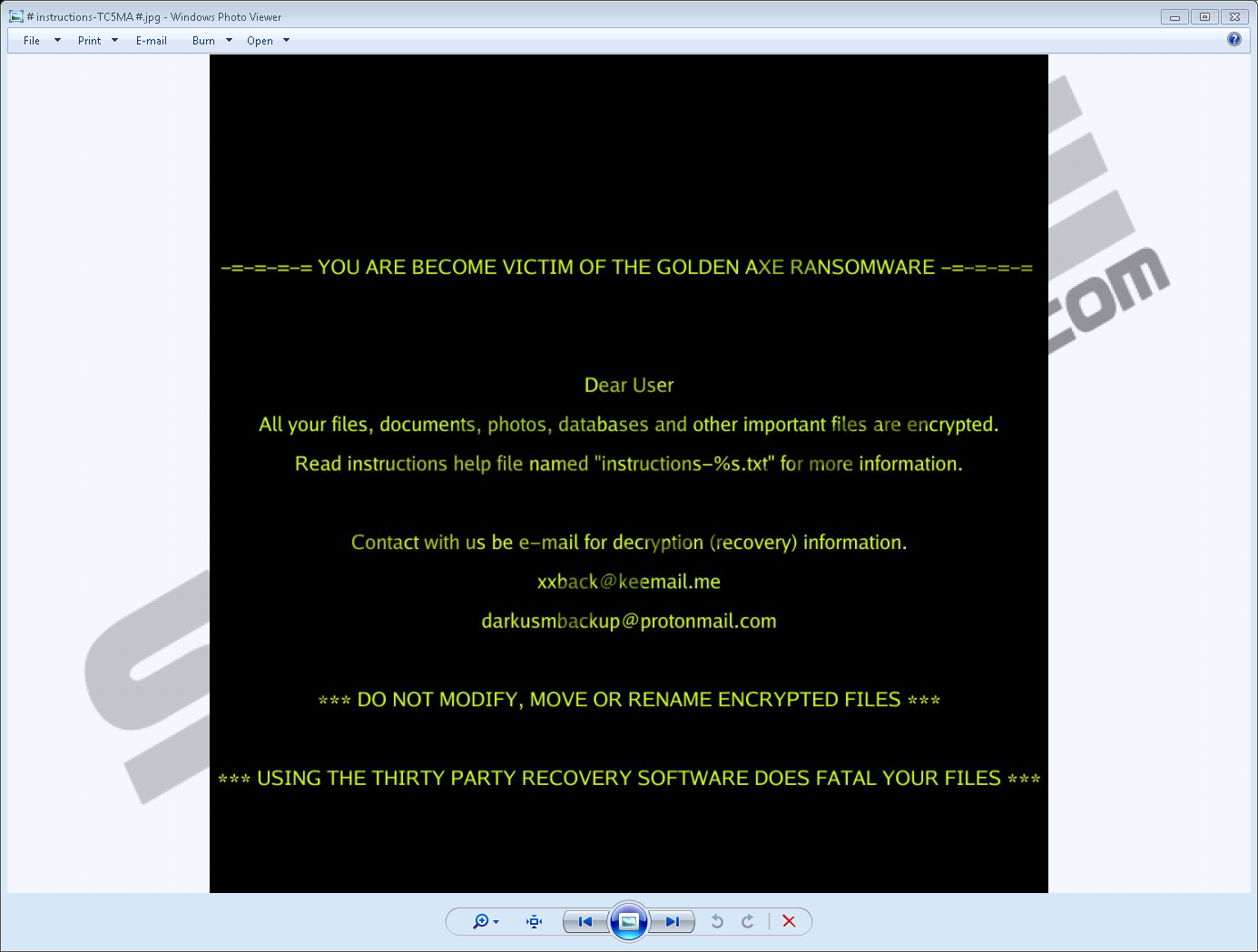 GoldenAxe RansomwareGoldenAxe Ransomware generates a unique ID number from five random characters to all of its victims. The number is used to create an individual extension (e.g., .An5Nn) that this malicious application appends to the files it enciphers. Unfortunately, the encrypted data becomes useless as it can no longer be opened. Cybercriminals behind such threats only care about getting paid for the decryption tools they suggest. The worst thing is you cannot be sure they will hold on to their deal, as there is always a risk they could scam you. If you want your computer to be malware-free again, we invite you to use the deletion instructions added at the end of the article. Of course, if you find them too complicated, you should get a reliable antimalware tool and let it erase GoldenAxe Ransomware for you. In the rest of the text, we wish to talk more about the malicious application’s working manner and its deletion, but first, we should explain how it could end up on the system. A lot of threats similar to GoldenAxe Ransomware infect the system after the victim launches its installer accidentally. It could happen while receiving suspicious email attachments or when opening data download from unreliable sources. Obviously, what you could do to avoid malicious applications like GoldenAxe Ransomware is be more careful with email attachments and when downloading files from the Internet. We strongly recommend not to open attachments if they seem suspicious or you do not know who sent them. As for downloading various files, you should make sure they do not come from torrent web pages and other untrustworthy sites. One other thing that our researchers advise is to have a reliable antimalware tool. You could use it to scan received/downloaded files to check whether they are safe to open. Besides, the tool itself could warn you about potentially dangerous content. Our specialists report that GoldenAxe Ransomware utilizes both AES and RSA encryption algorithms to encipher victims’ files. The malware can affect a lot of different files (e.g., .docx, .mp3, .png, .xls, .txt, .wmv, etc.), but it does not encrypt .exe files, so the user’s program data should be safe. During the encryption process, the threat could also kill the Task Manager so the user would not notice its process or try to interrupt it. Plus, it might try to erase all shadow copies with the following command: /C vssadmin delete shadows /all /quiet. Naturally, if the malicious application succeeds, the victim will not be able to restore files from shadow copies. In such a case, the only option that might be left is to use backup copies stored on a cloud, removable media devices, etc. Your data might always be at risk because if not some infection, it could be ruined because of the device’s malfunction, so if you want to protect valuable or precious files, we strongly recommend doing regular backups. The next thing GoldenAxe Ransomware should do after enciphering victim’s data is to create ransom notes to notify the user of what has happened and demand for payment. The research shows the threat ought to drop both a .txt and .jpg file with a ransom note. On top of that, our researchers say the infection plays a voice message saying the data was encrypted and that the user should read the mentioned notes for help. As usual, they say the hackers can decrypt a single file free of charge, but the user would have to pay to be able to restore all of his data. Plus, it should mention the price depends on how fast the victim contacts GoldenAxe Ransomware’s developers. Our advice is not to make any rash decisions you could later regret. The hackers may assure you will get the decryption tools, but in truth, it is possible they could easily scam you. If you do not want to take any risks, we encourage you to delete GoldenAxe Ransomware. To remove it manually you could follow the steps placed below. As for users who find the task slightly too tricky, we would advise using a reliable antimalware tool that could eliminate the threat for them and ideally protect the system from such threats in the future. Get rid of GoldenAxe Ransomware