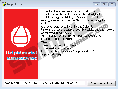 Delphimorix Red RansomwareSometimes malware programs seem to be a joke, but they still cause a lot of trouble. Delphimorix Red Ransomware seems to be one of those programs, and it still causes a lot of headaches to computer users. Of course, this malicious infection encrypts target files and demands that you pay a ransom fee. The ransom fee is unimaginable, so there is no need to even humor the idea of paying it. Computer security specialists say that you have to remove Delphimorix Red Ransomware right now, consequently securing your computer against similar intruders. Please continue reading this entry to find out more about this infection. How does this program manage to enter target systems? Well, the answer is actually quite simple: spam email. It also means that Delphimorix Red Ransomware doesn’t slither into your system behind your back. You have to open and launch the installer file yourself. But why would anyone willingly install a ransomware program on their computer? Of course, no one would ever do that. People simply don’t realize when that happens. Since ransomware programs spread through spam email attachments, the spam emails that distribute these programs often look like legitimate messages. Let’s say, you receive an urgent message from a financial institution that urges you to check your latest financial statement. If you are used to going through such documents, you might not think much of it. Downloading the file and opening it would occur automatically. And this is where Delphimorix Red Ransomware gets installed on the target system. If a message comes with a sense of urgency and it carries an attachment, you should definitely think twice before opening that file. If you must, scan it with a security tool. Do not open emails blindly just because they seem to be really important. Think whether you have been expecting that message, whether you really need it. If you are hasty, you will definitely end up with Delphimorix Red Ransomware on your PC. As far as the origins of Delphimorix Red Ransomware are concerned, we know that it is almost an identical copy of the Delphimoric Ransomware infection (hence the name, of course). Although the program doesn’t seem to take itself too seriously because it demands a ransom fee that is virtually unpayable. Its ransom message says the following: