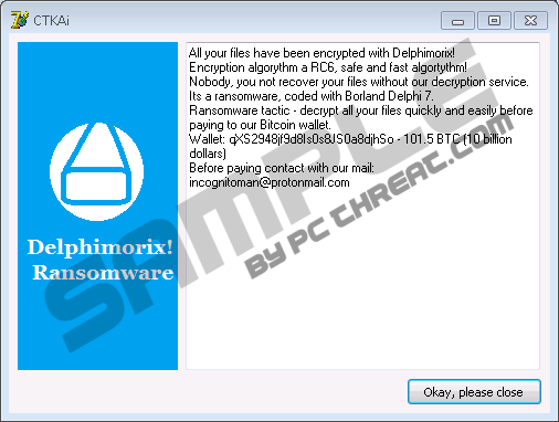 Delphimorix RansomwareDelphimorix Ransomware may show a message asking to pay a ransom of 10 billion US dollars. No doubt, it is merely a joke as the hackers instruct users to email them before making the payment. The sum is supposed to be paid in exchange for decryption tools that might be needed after the malicious application encrypts user’s photos, pictures, documents, and other personal files. Needless to say, we would recommend against making any payments if you do not want to risk being scammed. In which case, the only way to restore data could be replacing encrypted files with backup copies saved on removable media devices, cloud storage, etc. Users who would like to remove Delphimorix Ransomware manually could do so while following the instructions available at the end of this article. Another way to get rid of the malware is to install a reliable antimalware tool and do a full system scan. Further, in the text, we would like to talk more about the malicious application in question. Probably, it would be best to start from where it could come from. According to our researchers, Delphimorix Ransomware might be spread with email attachments and malicious installers downloaded from the Internet. Usually, the launchers of such threats look like text documents, system updates, or setup files of popular applications, which is why users open them without realizing what will happen. To avoid making such a mistake ever again, we recommend being careful with all data that comes from unreliable sources, for example, Spam emails, various file-sharing websites, questionable pop-ups, and so on. If you cannot decide whether the file is harmless or not, you should leave this task to a reliable security tool. Scan the file raising suspicion with an antimalware tool, and if it appears to be dangerous, the chosen application should help you get rid of it safely. The malicious application does not drop any additional files or executables on the infected system. Its main task is to encrypt the victim’s files before he realizes what is going on. After this process is complete, the user should notice something is wrong just by looking at his data, as Delphimorix Ransomware marks each encrypted file with a long second extension that should be difficult not to see. Also, soon after the encryption, the malicious application is supposed to open a window called CTKAi. It contains a note from the malware’s developers. At first, it explains the user’s files were encrypted while using the RC6 encryption algorithm and that no one can decrypt them without the tools the hackers have. Then, it displays a Bitcoin wallet address for making the payment. Surprisingly, the price is 101.5 BTC, which according to the message, was around 10 Billion US dollars at the moment the note was written. However, the price of Bitcoins continues to drop, so currently, the sum is a lot smaller. We do not think the hackers behind Delphimorix Ransomware expect to receive such a huge sum. Below the Bitcoin wallet address, there is a sentence saying: “Before paying contact with mail: incognitoman@protonmail.com.” We have not tried contacting the cybercriminals ourselves, but it is most likely they would reveal the actual price to users who do. Nonetheless, we do not advise doing so if you do not want to risk losing your money. These people can promise you will get the needed decryption tools, but in the end, no one knows if they will hold on to their word. This is why instead of contacting the malware’s developers, we advise deleting Delphimorix Ransomware and then restoring files from backup copies if you have any. As explained earlier, the malicious application can be deleted either manually or with automatic features. If you think you can handle the task, you should check the Delphimorix Ransomware’s manual removal instructions available below this text. Naturally, if they seem to be too tricky, we advise employing a reliable antimalware tool of your choice. Erase Delphimorix Ransomware