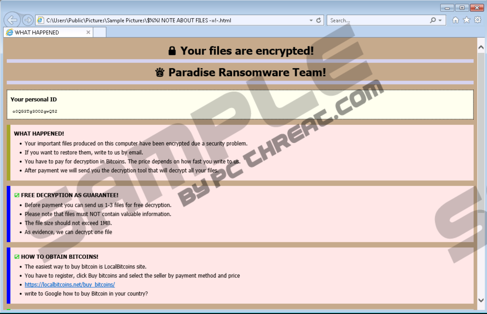 Alexbanan@tuta.io RansomwareAlexbanan@tuta.io Ransomware is one of the many ransomware infections that intend to reap financial profit by extorting ransom payments from innocent users. If you were infected with this program, you can scroll down to the bottom of this description for the manual removal instructions. Although manual removal is not complicated, it would still be a good idea to invest in a licensed antispyware tool that would scan your PC for other potential threats. Also, if you encounter something unfamiliar, do not hesitate to address a professional. Professional help could be especially valuable when it comes to file recovery. From what we know, Alexbanan@tuta.io Ransomware is just another version of the Paradise Ransomware infection. It is very likely that this program is a direct clone of the previously released application. Therefore, if there is a public decryption tool available for Paradise Ransomware, it is possible that it might work on Alexbanan@tuta.io Ransomware, too. However, you might want to check that in advance. So how is Alexbanan@tuta.io Ransomware different from Paradise Ransomware? According to our researchers, the only important part that seems to have been changed is the email address used and the extension added to the encrypted files. When ransomware programs encrypt target files, they usually add an extension to the filename. This extension tends to have something in common with the name of the infection. Also, the extension makes it easy to discern affected files. Although it shouldn’t be too hard in the first place: When the ransomware encrypts files, their icons change too because the system is no longer able to read them. Either way, when you are infected with Alexbanan@tuta.io Ransomware, and this program encrypts your files, the filenames change accordingly: