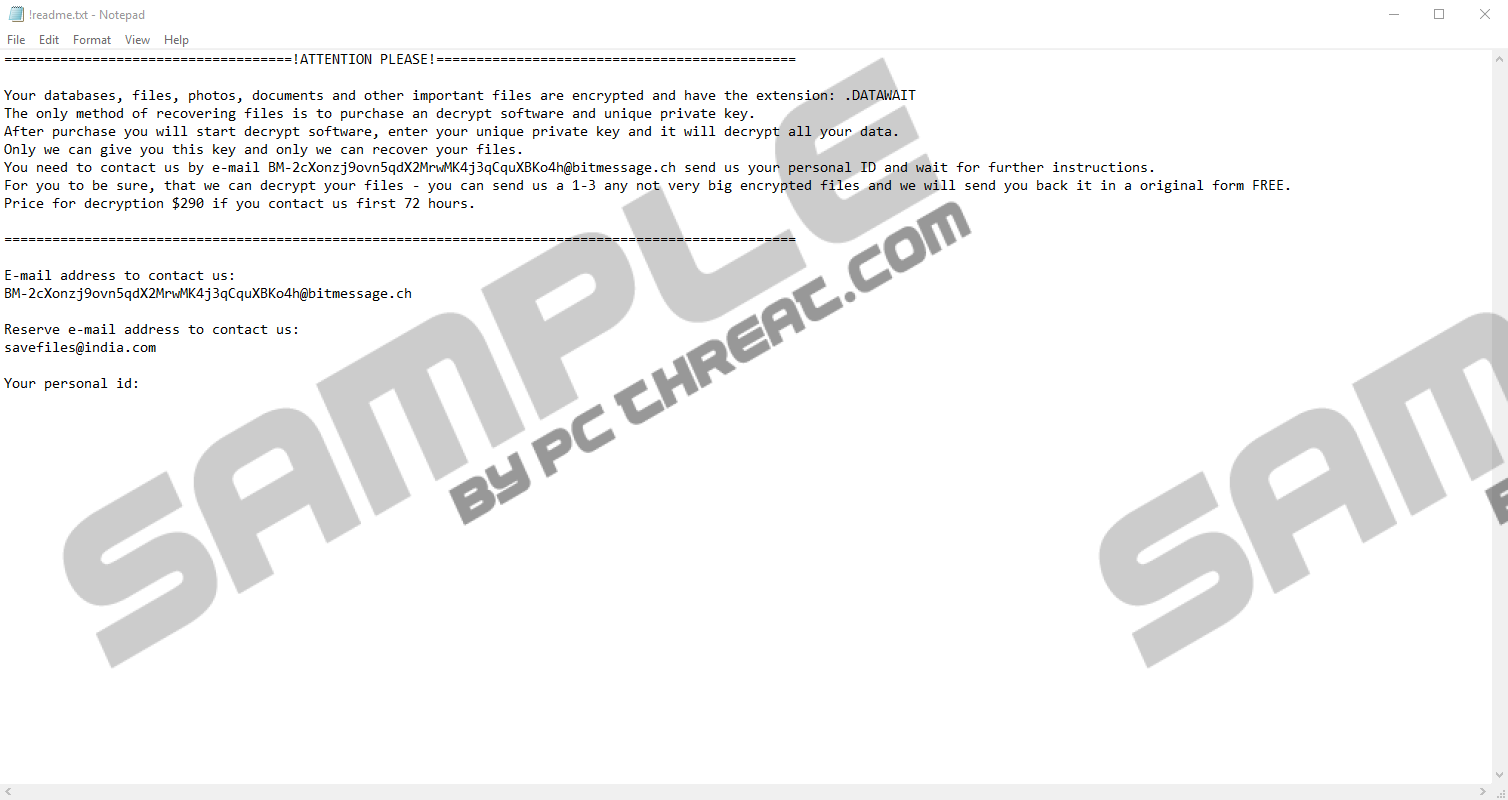 DataWait RansomwareDataWait Ransomware belongs to STOP Ransomware family as it is similar to other file-encrypting threats from it, for example, PUMA Ransomware, KEYPASS Ransomware, etc. The malware encrypts data on the infected device and appends .DATAWAIT extension to it. Afterward, it ought to open a ransom note that says the threat’s developers have decryption tools, which could restore all data to the way it was. Unfortunately, they do not mean to give the needed tools free of charge, as they want to get 290 US dollars. What’s more, victims interested in paying the ransom are supposed to contact the DataWait Ransomware’s developers for further instructions. It may not be a good idea given there are no reassurances the promised tools will be delivered as promised. This is why we do not recommend putting up with any demands if you are not willing to risk your savings. In the rest of the article, we explain more about the malicious application. For starters, we ought to discuss where DataWait Ransomware might come from. Our researchers say it is most likely the malware could be spread via Spam emails, or it might be dropped on the system by exploiting unsecured RDP (Remote Desktop Protocol) connections. Consequently, we advise doing two particular things as a start if you wish to protect your computer from threats alike. Firstly, you should never open attachments received with Spam or from unknown senders without scanning them with a reliable antimalware tool first. Secondly, you should make sure your system has no vulnerabilities that could be exploited, which means you should change old passwords, update outdated software, and so on. In addition, we suggest installing a legitimate antimalware tool that could help you keep the system protected. Next, we should talk about what happens if DataWait Ransomware infects a device. At first, the threat might open a window saying the system is installing necessary updates. In reality, the malware should be encrypting private files of the computer’s user. During this process, the malicious application might block user’s Task Manager to prevent him from stopping the encryption. Also, our researchers noticed that the malware might make the explorer.exe crash from time to time. Before too long, it should create text documents called !readme.txt with a ransom note inside of them. According to the message, DataWait Ransomware encrypted all valuable data, and there is no other way to recover it without special decryption tools that only the hackers behind the threat have. To learn how much it would cost and how to transfer the ransom, users are asked to email the malicious applications developers. There is also an additional condition that says victims have to email hackers within 72 hours. The sum is quite huge as some hackers ask for less than 50 US dollars, but it is not the largest one either. Thus, you should decide for yourself if you are willing to risk throwing 290 US dollars away, since there is a possibility that something could go wrong. As you see, DataWait Ransomware’s developers could change their mind and demand for more money. Not to mention they may not bother sending promised tools as once the payment is transferred, there is no way to take it back. In case, you do not want to take any chances or have a backup, for example, on removable media devices or cloud storage, from which you can restore all your data, we advise deleting DataWait Ransomware. Removing the malicious application manually could be a difficult process as it creates a lot of various files upon its installation. Nonetheless, if you feel up to the task, we offer the instructions located below. They explain where to search for the malware’s data and how to delete it step by step. Still, if the task looks too complicated, you should not hesitate to employ a reliable antimalware tool, as ensuring the threat gets erased is essential for your system’s security. It is possible that while it is on the system it could restart with the operating system, and encrypt new data, which is another reason we do not recommend leaving DataWait Ransomware unattended. Restart the computer in Safe ModeWindows 8/Windows 10