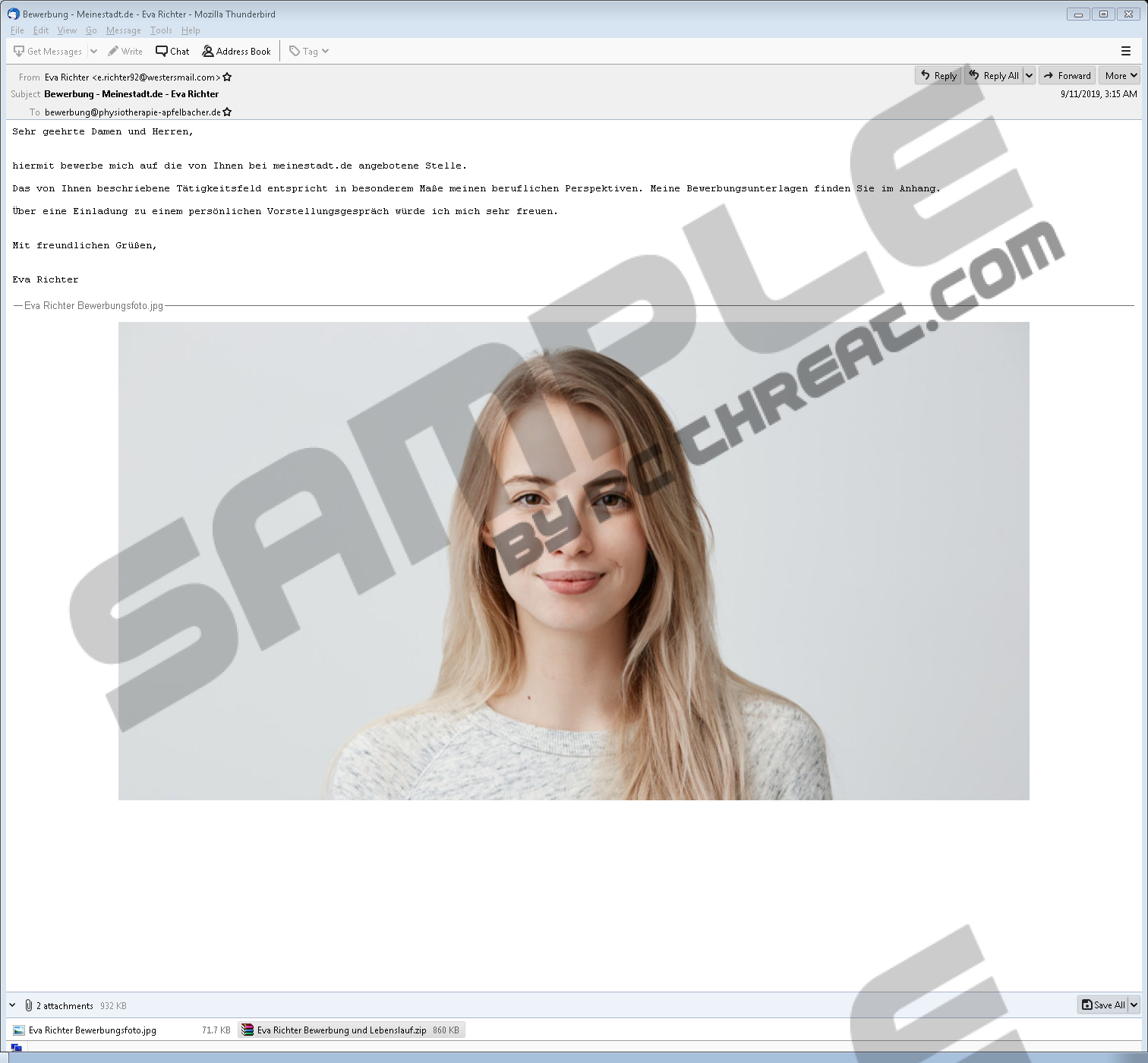Ordinypt WiperReports say that Ordinypt Wiper is targeted at people speaking German. Also, it seems this malicious application is used to attack businesses and not regular home users. As you see, the malicious emails carrying the Trojan appears to be coming from a woman seeking employment. Unfortunately, if victims open data attached to the described emails, their systems become infected. Soon after getting in, the threat should start encrypting various documents and other types of files. The worst part is that even though the malware’s creators may claim they can decrypt affected files, in reality, it is not possible due to the method used to encipher them. To find more about this vicious threat, we invite you to read the rest of this article. If you scroll a bit below it, you can find simple instructions showing how to erase Ordinypt Wiper’s launcher. Users who want to be extra careful should scan their systems with reputable antimalware tools to make sure the Trojan is gone and that there are no other possible threats. Ordinypt Wiper is spread through phishing emails. Besides the message saying the sender wants to apply for a particular job position at the targeted company, such emails should also contain a couple of files. The first one is a photo of a young woman, which is probably just a random photo taken from one of the websites that offer free images. The second file should be a ZIP archive containing a file disguised as a PDF document. In reality, the file in the archive is a malicious executable that launches Ordinypt Wiper if it gets opened. The phishing email with such contents should come from a person called Eva Richter. Naturally, if you get an email from this person and it includes files we described, we advise not to open them. Another thing that employers should know is that businesses are targeted quite often, which is why it is essential to educate employees so they could recognize phishing attacks. It is best not to open files raising suspicion or coming from unknown sources. Also, we highly recommend scanning data received via emails with a chosen antimalware tool first. As mentioned earlier, the Trojan may encrypt various files considered to be valuable to targeted victims. Afterward, the malicious application should show a ransom note in which hackers behind Ordinypt Wiper demand to pay a ransom in exchange for tools that could decrypt locked files. Of course, such tools are offered not free of charge. The sum is not mentioned, but considering that the targeted victims are various companies, the price could be huge. The problem is that it might be impossible to decrypt any files despite what cybercriminals may promise. According to researchers, each file might be overwritten with random characters, which is not the same as having them encrypted. In other words, even if victims pay ransoms, it is doubtful they will get their files back. It is more likely that the money will be lost in vain. What’s even worse is that Ordinypt Wiper might erase all shadow copies to prevent victims from restoring their data. Thus, the only other way to get enciphered data back might be to replace it with backup copies from removable media devices, cloud storage, and so on. There is no point in keeping the malware's launcher on your computer. If you want to remove Ordinypt Wiper manually, you could follow the instructions located below. Our provided steps explain how to look for the malicious application’s launcher and how to erase it manually. This task could be a bit complicated for inexperienced users, in which case, we recommend employing reputable antimalware tool instead. All a victim has to do is scan his computer with a reliable antimalware tool. Next, we advise waiting until the scanning process is finished after which the chosen tool ought to provide a report and a deletion button. Click it and all identified threats ought to be removed. If you need more assistance or have any question about Ordinypt Wiper, do not hesitate to leave us a message below this article. Erase Ordinypt Wiper