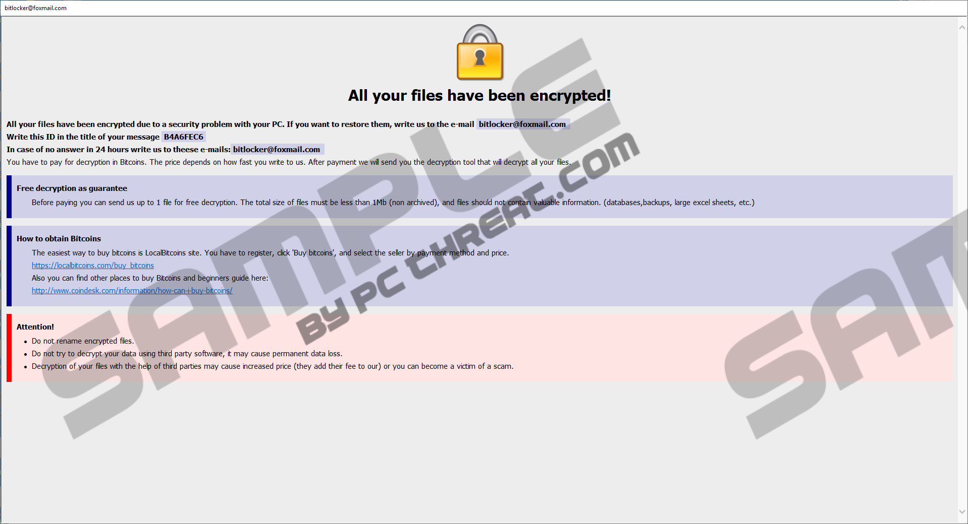 Wiki RansomwareNo, Wiki Ransomware does not spread via Wikipedia pages. In fact, the name of this infection makes no sense at all. The truth is that the attackers behind this infection had to choose some kind of a file extension, and “.wiki” was the one they chose. The full extension is “.id-{ID}.[bitlocker@foxmail.com ].wiki,” and it includes a unique ID given to every victim and an email address. This format has been used by Uta Ransomware, Save Ransomware, MGS Ransomware, Wal Ransomware, and many other infections that came before them. They were all created using the Crysis/Dharma Ransomware code, and that is why they all have so many similarities. In this report, of course, we focus on the removal of Wiki Ransomware, but you can learn about all infections from this family by reading this report. We discuss the common distribution methods, obstacles when it comes to deleting this malware, and, of course, the protection of the Windows operating system against this kind of ransomware. You might have figured out that something has happened only after the “FILES ENCRYPTED.txt” file was created on the Desktop or when the “Info.hta” file was opened. The .TXT file is a text file, and it informs that all locked files can be returned if the victim emails bitlocker@foxmail.com. The .HTA file opens a message via the browser, and it explains the things in more detail. For one, victims are informed that they need to send a message to bitlocker@foxmail.com within 24 hours and that they are expected to pay a ransom in Bitcoin (a virtual crypto-currency) to have the files restored. The exact sum of the ransom is not disclosed, but it is stated in the message that the price depends on how fact the victim contacts the attackers. On top of that, the message claims that free decryption is guaranteed. Can you trust cybercriminals? No, you cannot. Their claims to help you if you follow their instructions are most likely to be bogus, and that is why we do not recommend getting involved. Furthermore, if you contact Wiki Ransomware, you do not know what they could send you. For all you know, you could receive malware installers instead of a decryptor. Some file-encrypting infections are cracked by malware researchers, who are able to create decryptors. The victims of such infections can have their files restored for free. Unfortunately, that is not the case with Wiki Ransomware. At the time of research, a free decryptor did not exist. The promises made by the attackers could not be trusted either. What does that leave you with? Empty hands. It is possible that you are in a helpless situation, but if you have backups, there is nothing for you to worry about. Once you delete Wiki Ransomware – and the removal is discussed in the following paragraph – you will be able to replace the corrupted files with backups. Needless to say, it is imperative to stay on top of your backups because only if you have copies of all of your personal files will the attackers stand no chance of terrorizing you. Hopefully, you are in a position to replace the encrypted files, and you do not need to think about contacting cybercriminals or following their ridiculous demands. As you can see by looking at the guide below, the first step you need to take if you decide to delete Wiki Ransomware manually is to eliminate the launcher. Where is it? What is its name? We cannot answer these questions, and that is why you might have trouble with manual removal. There is nothing to worry about because this is not your only option. You can always hire a professional to do the job for you. Of course, it is best to install an anti-malware tool you trust. Investing in your virtual security is the smart move, and if you invest in it by implementing anti-malware software, you will not need to worry about the removal of Wiki Ransomware or the protection of your Windows operating system. If you do not secure your system, a new infection could invade before you know it. Note that ransomware usually spreads via emails, downloaders, and backdoors opened using unpatched vulnerabilities. Do you have questions? You can share them with our research team via the comments section below. Wiki Ransomware Removal