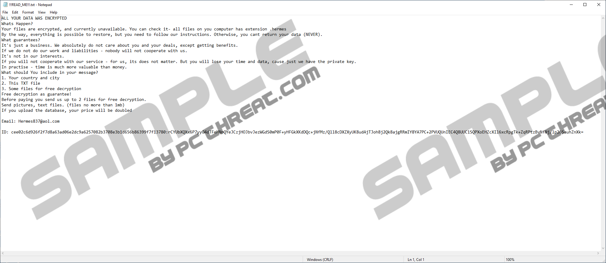 Hermes837 RansomwareHermes837 Ransomware is a recently created Hermes Ransomware variation. The threat acts more or less the same as the versions created before it. It encrypts almost all data except files belonging to Windows or other software and shows a ransom note that claims the threat’s developers guarantee they will deliver decryption tools that can restore enciphered files if a victim cooperates with them. The bad news is that the hackers want to receive a payment in return. They might try to convince you otherwise, but the truth is that there are no guarantees when dealing with cybercriminals, and paying a ransom could end up hazardously. Of course, before deciding anything, we recommend reading our full article to learn all about this malware. As for deleting Hermes837 Ransomware, we recommend using a reliable antimalware tool or trying the instructions available at the end of this article. One of the things users who want to stay away from threats like Hermes837 Ransomware should know is how they might be spread. Our researchers say that many of them travel with infected email attachments, which could be received with Spam. Therefore, it is advisable to be cautious with email attachments, especially if they come from suspicious sources. If you receive data that you did not expect to get, we highly recommend ignoring it if it looks suspicious or scanning it with a reliable antimalware tool that could determine whether it is malicious or not. Hackers have the means to disguise executable files like text documents, pictures, or other harmless-looking files. Also, such threats can hide their presence on an infected computer, so users may not realize they received malware after opening suspicious files. Unfortunately, by the time you figure it out, all of your data could be already encrypted. Thus, it is best no to rush with launching files if you are not sure they are safe to interact with. As soon as Hermes837 Ransomware gets launched, it should locate data that it was designed to encrypt and begin the encryption process. According to our researchers, the malicious application ought to lock all data that is not related to Windows or other software a victim may have on his device. In other words, the infection is after private data, such as documents, pictures, and so on. During the encryption process, all files should not only become unreadable, but they are also supposed to receive a second extension called .hermes837. For example, a document named text.docx would become text.docx.hermes837. The more files there are, the longer the encryption process might take. Once it is over, a user should be informed about Hermes837 Ransomware’s presence and the damage done to his files. The threat should do so by opening a text document that ought to carry a message from its developers. We call such messages ransom notes, and, in this case, it should be titled !!READ_ME!!.txt. The text inside of the Hermes837 Ransomware’s ransom note should announce that all files became unusable. Also, it should claim that the malware’s creators are the only ones who can provide decryption tools needed to decipher the threat’s enciphered files. The rest of the ransom note’s text ought to claim that it is in the hackers’ interest to keep up with their promises and deliver the promised decryption tools. Plus, they may offer to decrypt a couple of files (smaller than 1 MB) free of charge. Needless to say, hackers cannot be trusted as they can tell anything to convince their victims to pay. Users who back up their files regularly might be able to replace all of the data that got encrypted with backup copies. In other words, there might no need to pay any ransom. Whatever you decide, we advise deleting Hermes837 Ransomware as leaving it unattended could be risky. To remove it manually, you could use the instructions available below this article. If the task seems complicated or you do not feel up to it, you could employ a reliable antimalware tool that could erase Hermes837 Ransomware for you. For this to happen, you should install your chosen security tool on the computer infected with the malware and perform a full system scan. After this, you should be able to erase all detections at once. Eliminate Hermes837 Ransomware