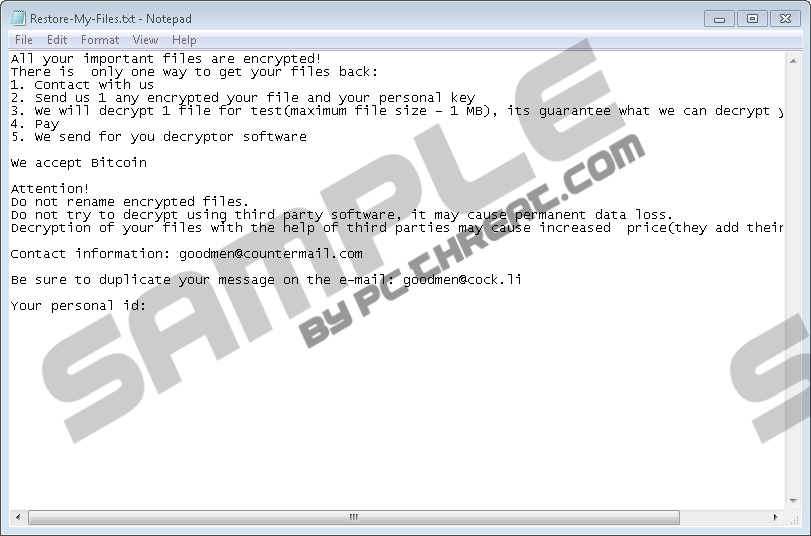 ABCD ransomwareABCD ransomware is a dangerous computer infection that doesn’t have a public decryption tool. Therefore, dealing with the infection might be slightly challenging. However, you shouldn’t lose hope because there is always a way to retrieve at least some of your files. This program deletes itself when the file encryption is complete, but there might be some files left so you can get rid of them when you are set to remove ABCD ransomware (or what’s left of it). As for your files, you might have to go through a number of file recovery options together with a local technician. According to our research team, ABCD ransomware most lightly spreads through unsecured RDP client programs. This also means that users allow these dangerous apps to enter their systems. Here you might say that you would never ever consider leading such programs into your computer. But the point is that users are often unaware of the fact. The ransomware installer file might look like a legitimate document that you need to check out. But whenever you receive new documents via Remote Desktop client, you should check the legitimacy of those documents. Sometimes an account that sends the document could be hacked, and a malicious file can be easily sent out to you. If you fail to scan the received file with a security tool, you could get infected with ABCD ransomware or any other similar infection. When you launch the received file, you automatically start the file encryption, too. Once the encryption is complete, all the affected files also get slapped with a new extension. For example, a flower.jpeg filename after the encryption would look like this: flower.jpeg.abcd. As you can probably tell, this extension means that the files were encrypted, and it allows you to see which files were affected. Aside from encrypting most of your personal files, ABCD ransomware also drops a ransom note in every single folder that contains the encrypted files. The ransom note is in the Restore-My-Files.txt document, and here’s what is has it say: