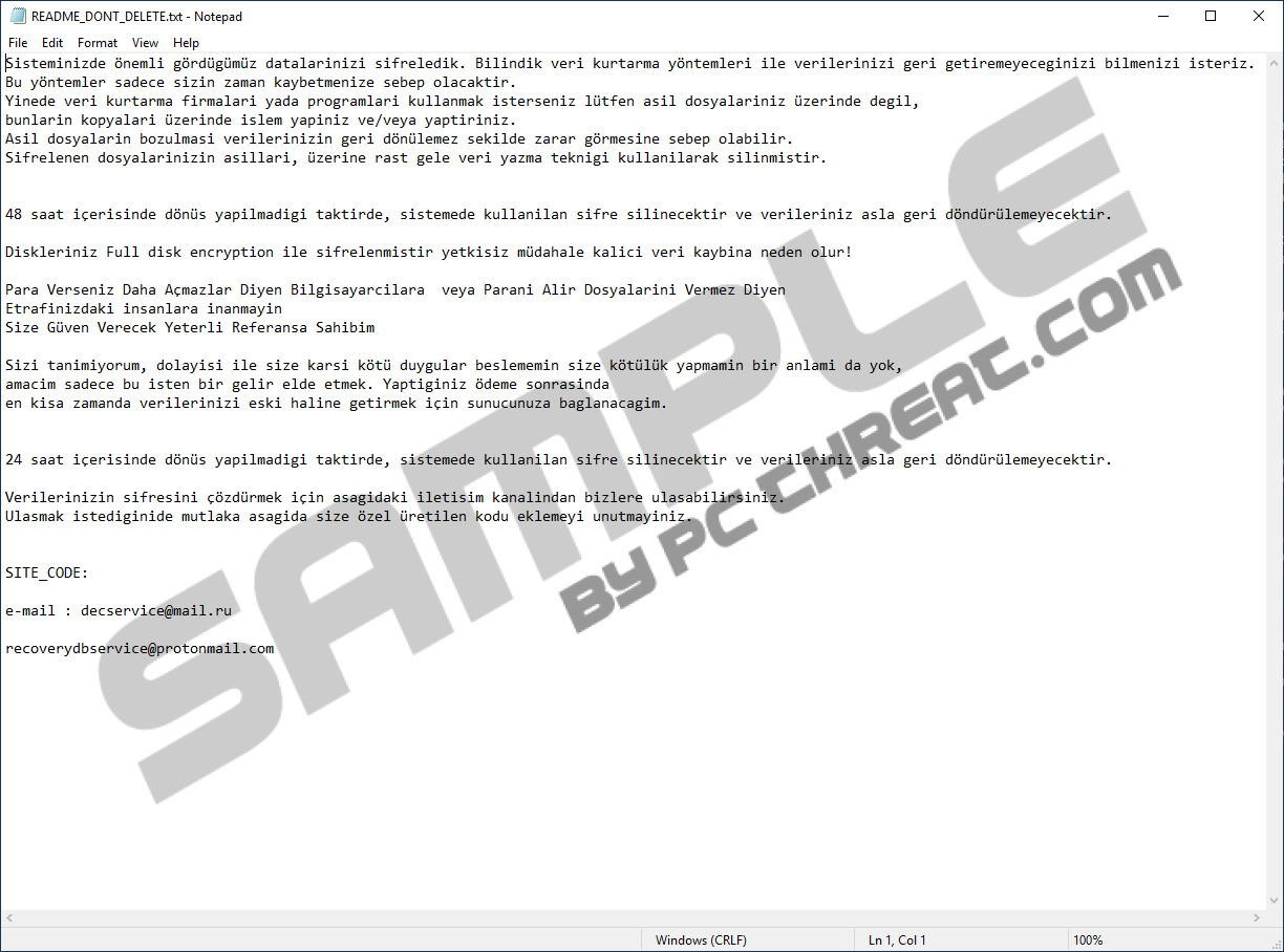 TurkStatik RansomwareTurkStatik Ransomware encrypts files and adds the “.ciphered” extension to their original names. This threat can encrypt over 100 different types of files, including DOC, ZIP, RAR, MPG, AVI, or PDF, and it can encrypt them in all drives, including partitions, USB drives, and the network. Needless to say, this malware can make a huge mess, but it is not all bad news. A free decryptor called “TurkStatic Decryptor” has already been created by malware researchers, and if you can download it onto the infected machine, there is a good chance that all of the corrupted files will be restored. Of course, you want to be cautious about the tool you install because fake lookalikes could always be created by virtual schemers or even malware distributors. Speaking of distribution, do you know how the ransomware got in? Do you know how to secure your operating system in the future? Do you know how to remove TurkStatik Ransomware? These and other questions are answered in this report, so keep reading. The exact method of distribution that TurkStatik Ransomware uses is unknown, but it is possible that the attackers behind this threat could be using different methods at once. For example, they could use leaked email addresses to spread the installer as a document file. They could also exploit your system’s vulnerabilities – for example, within remote access tools – to drop the infection without you knowing about it. Even other infections could be employed to spread the dangerous file-encryptor. It is quite important to figure out how TurkStatik Ransomware got in, because that might determine whether or not you can delete the infection manually. Although we can provide you with a list of potential locations where the launcher file might be, if you cannot find it, it is unlikely that you will be able to perform manual removal. Of course, the launcher is not the only thing you need to delete. Our researchers have found that the threat creates a %TEMP%\windows.dll file, which is likely to include a unique identifier number. Also, in every location that contains encrypted files, the ransomware drops “README_DONT_DELETE.txt.” The text file dropped by TurkStatik Ransomware displays a message in Turkish, and so it is likely that the threat is specifically targeted at Turkish-speaking Windows users. The message informs that the only ones who can restore files are the attackers themselves. Since a free decryptor already exists, we know that this is a lie. Unfortunately, some victims might be scared into thinking that they need to contact the attackers via decservice@mail.ru and recoverydbservice@protonmail.com and then pay a ransom in return for decryption services. The message also declares that victims only have 24 hours to fulfill the attackers’ demands. After this period, files are supposed to become unrecoverable. Hopefully, you have not exposed yourself to cybercriminals behind TurkStatik Ransomware by sending them a message. If you have, make sure you are extra cautious about the emails you receive, because you might end up receiving scam emails, some of which could contain malware launchers. If you have paid the ransom, it is most likely that your files have remained encrypted. Delete the threat and look for a free decryptor. Whether you can replace the corrupted files with your own backups, or you use a free decryptor, you need to delete TurkStatik Ransomware as soon as possible. We suggest doing that before you do anything else. As mentioned before, the threat can encrypt everything, even external drives if they are connected to the machine, and so you do not want to risk your backups. Hopefully, you are ready to remove TurkStatik Ransomware, and your only task is to choose the right option. Perhaps you are thinking about removing this infection manually? As we discussed earlier, you will not succeed unless you can locate the launcher file. So, if that is not an option for you, maybe you should install anti-malware software? We believe that all Windows users should have this software installed because, without it, the operating system will always remain vulnerable to malware attacks. So, if you want to have your system protected, and the dangerous ransomware removed automatically, we suggest installing anti-malware software now. TurkStatik Ransomware Removal