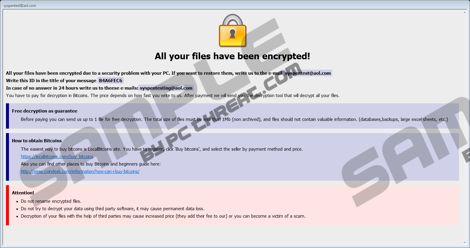 SySS RansomwareSySS Ransomware was created by someone who has no concern for you, your personal files, or your virtual security. Unfortunately, cybercriminals continue to exist, and they often prey on those who could bring in the money. Clever scams are often used to trick people into giving up their money or disclosing sensitive information that could lead to theft. However, when it comes to ransomware, cybercriminals do not need to use trickery. Instead, they take what matters most to computer users – their personal files. Obviously, you do not want your system running disorderly, but if you ever need to reinstall Windows or certain applications, you can do that without much trouble. When it comes to personal files, on the other hand, you might have no way of replacing them, in which case, cybercriminals might suggest making a deal. Needless to say, the deal always involves some kind of payment. So, is paying money to get your files decrypted a good idea, or should you just remove SySS Ransomware? SySS Ransomware is part of the Crysis/Dharma Ransomware family, to which ROGER Ransomware, Devil Ransomware, Dever Ransomware, and many other well-known infections belong as well. These threats can exploit unreliable downloaders, software cracks, spam emails, and other security backdoors to slither into your operating system. Most often, the victim has something to do with the entrance of the threat as well. After a successful entrance, SySS Ransomware is executed, and the encryption of personal files begins. If security software is installed and running, the infection should be removed before it even gets the chance to execute. Unfortunately, when files are encrypted, and the “.id-{unique ID code}.[syspentest@aol.com].SySS” extension is appended to their names, there might be nothing you can do to salvage your files. You can look into using free Dharma and Crysis decryptors, but we cannot promise you that they will work. Ideally, you have copies of all personal files stored outside the infected computer, and you can easily replace the encrypted files after you delete the infection. If you do not have copies of your personal files, and if you are desperate to get the encrypted files back, the messages represented via the “syspentest@aol.com” window and the “FILES ENCRYPTED.txt” file are extremely dangerous. Both of them instruct sending your unique ID code to syspentest@aol.com or syspentesting@aol.com, but doing that is extremely risky. If you start communicating with attackers, they will instruct you to pay a ransom in Bitcoin. The ransom is likely to be big, and if you do not even know what Bitcoin is, it might be an ordeal for you to set up a payment. Well, you should not go through with this anyway because it is very unlikely that cybercriminals would keep their promise to provide you with a decryptor after the payment is confirmed. Remember that SySS Ransomware was created to make money and that cybercriminals have no concern for your files’ or your own safety. Obviously, if money is not a thing of concern for you, you might consider contacting the attackers and paying the ransom, but if you send an email to them, you open yourself up to new scams. Is that a risk you want to take? Hopefully, you understand what you are doing regardless of the path you choose to follow. Most people who face ransomware have two main concerns. Naturally, the first concern is how to get the files back. The second concern is how to delete malware. Deleting SySS Ransomware does not need to be very difficult, and we recommend employing anti-malware software to help you out. This software will thoroughly inspect your system to find all malicious components, and then it will remove them all automatically. You will need to do nothing more than click a button. On top of that, the software will also take care of your system’s protection, so that you would not need to face other threats again. If you decide to remove SySS Ransomware manually, you might face a few obstacles. First of all, the launcher file could be pretty much anywhere, and even its name is likely to be random. Furthermore, there are other files and registry entries with random names, and if you cannot identify malware components, you might be unable to successfully clean your system. If you want to give it a go, follow this guide. SySS Ransomware Removal