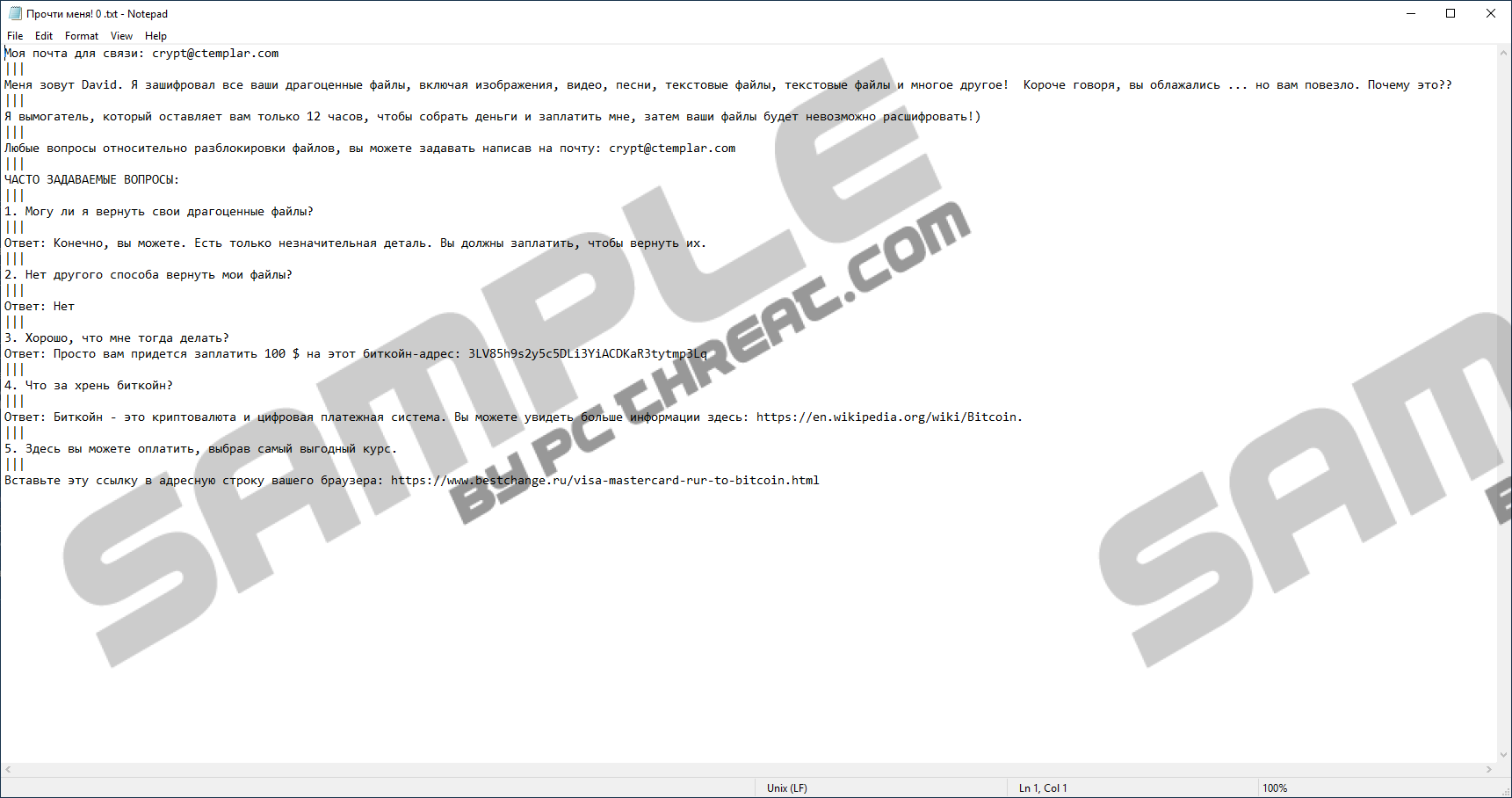 OnyxLocker RansomwareRussian-speaking Windows users are now targeted by OnyxLocker Ransomware, a dangerous file-encrypting threat that can encrypt pretty much all of your personal files. That is the main goal because if personal files are corrupted, the attackers have the chance to make you try to get them back. What is that process? The attackers want you to believe that you can pay a ransom and get a decryptor in return, but we doubt that that is what would happen. Our malware experts have analyzed hundreds of different ransomware infections – some of which are 2048 Ransomware, SySS Ransomware, and 5ss5c Ransomware – and if we know one thing, it is that cybercriminals can make any promises to scam you. Hopefully, you have not contacted the attackers yet, and you have backups that could be used to replace your personal files. Even if that is not the case, you need to focus on the removal of OnyxLocker Ransomware. Your files will not be restored, but you will never be safe unless you delete this threat. There are plenty of backdoors that cybercriminals can use to drop OnyxLocker Ransomware onto your operating system without your notice. They can use spam emails, bundled downloaders, vulnerabilities, other infections, fake program cracks, or social engineering scams. If they achieve success, the infection is dropped and executed instantly. Then, it starts encrypting files, and the “.onx” extension is appended to their original names to make them more noticeable. Our researchers have found that the threat encrypts files in %APPDATA%, %USERPROFILE%\Desktop, %USERPROFILE%\Documents, %USERPROFILE%\Music, %USERPROFILE%\Pictures, and %USERPROFILE%\Videos directories, and it can encrypt pretty much all personal files (e.g., those with .PDF, .DOC, .AVI, .MP3, .JPG, and .PNG extensions). Next to the encrypted files, OnyxLocker Ransomware is likely to drop a file named “Прочти меня! {0-9}.txt.” Since the threat is targeted at Russian-speaking Windows users, the message inside this file is in Russian also. Opening the file dropped by the infection is safe, but paying attention to the information that is introduced via it is dangerous. Also, note that it is the only other component – besides the launcher – that must be deleted. The message introduced to you by OnyxLocker Ransomware informs that someone named David has encrypted all of your files, but can offer you a solution. It is suggested that if you pay the ransom of $100 in Bitcoin (you are supposed to send it to the 3LV85h9s2y5c5DLi3YiACDKaR3tytmp3Lq Bitcoin wallet) and also contact the attacker at crypt@ctemplar.com, you will have your files decrypted. There is no explanation as to how that would happen, and that is a signal that someone is duping you. Of course, if the files that were encrypted are extremely important to you, you might decide that paying $100 is not that big of a deal. Well, if you do not want to waste money, paying the ransom is not something we would recommend doing. Unfortunately, we do not think that you would get your files decrypted if you paid the ransom requested by OnyxLocker Ransomware. What else can you do? If you have backups stored outside the infected computer, you should delete the infection and then replace the corrupted files using the copies you own. Let this be a reminder that you want to have copies of all of your personal files stored someplace else because you never know what could happen to the original files. We cannot know where exactly the launcher of OnyxLocker Ransomware file is. The manual removal guide below lists a few potential locations, but it is possible that this file is someplace else completely. Due to this, victims of this malware might have a hard time eliminating it manually. That is no problem at all, as you can install legitimate anti-malware software to have the threat erased automatically. Besides deleting OnyxLocker Ransomware, this software can also provide you with comprehensive Windows protection, which, of course, is very important if you want to evade malicious threats in the future. It is not enough to secure your system, however. It is also important that you protect your files by backing them up outside the computer and that you do not enable malware yourself. Always be cautious about the emails you open, downloaders you use, links you click, and so on. OnyxLocker Ransomware Removal