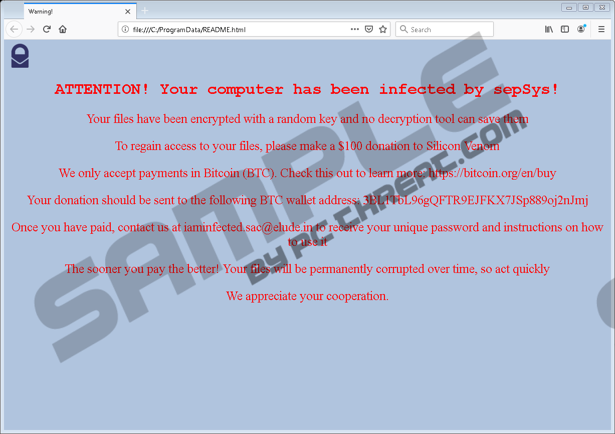 SepSys RansomwareSepSys Ransomware is nothing to joke about. It is a dangerous file-encryptor that vicious cybercriminals stand behind. They take a hold of your files by changing the data within, which ensures that you cannot read them. To put it simply, the threat, hijacks them, and even though it does not delete them per se, they are as good as gone. Of course, the attackers want you to think that you can pay money for a decryptor, but we seriously doubt that you would get it if you fulfilled the demands that are introduced by the attackers. We discuss them further in the report. Hopefully, you have backups and can replace the corrupted files, in which case, you should not even consider paying the ransom. On the other hand, even if you cannot replace the files with backups, paying the ransom is a terrible idea. Hopefully, you can recover files and remove SepSys Ransomware easily, and we are sure that the information presented in this report will help you take appropriate steps immediately. You can tell if SepSys Ransomware has invaded your system and encrypted your files if you can see the “.sepsys” extension attached to their names. You are unlikely to notice when files get encrypted because this process is silent and quick. The threat is able to corrupt files as soon as it slithers in, and it is most likely to do that using spam emails, malicious downloaders, and also vulnerability exploits. Once inside, SepSys Ransomware does not waste time. Personal users’ files are encrypted immediately, and then a file named “README.html” is dropped. To ensure that this file opens every time the system is restarted, an autostart key is added to the Windows Registry. You can learn how to remove the key and the associated file using the manual removal guide below. Before you delete this file – and, by the way, it should be dropped to the %PROGRAMDATA%/%ALLUSERSPROFILE% directory – you might be interested in opening it and reading the message inside. That is safe to do, but you still need to be cautious. The “README.html” file informs that all SepSys Ransomware victims need a decryption tool is they want to “save” their files. To obtain the tool, victims are instructed to donate $100 to a special Bitcoin wallet (3BL1TbL96gQFTR9EJFKX7JSp889oj2nJmj) and then confirm the donation by sending a message to iaminfected.sac@elude.in. After this, the victim is supposed to receive a “unique password” that should show how to use the decryptor. The instructions are clear, and you might be willing to pay $100 to get your files back. However, you should pay the ransom only if you do not mind wasting 100 dollars and if you understand the risks you could be facing if you decided to email cybercriminals. Note that they could use your email address to expose you to malware, blackmailing campaigns, and also other, unrelated scams. Hopefully, you have backups that can be used to replace the corrupted files. If you have this luxury, make sure you delete SepSys Ransomware first because the last thing you need is to have your backups corrupted also. If you do not have copies of personal files, make sure you create them in the future. The instructions you can see below show how to delete SepSys Ransomware ransom note file and also how to modify the Windows Registry to ensure that the file cannot open on startup. Unfortunately, we cannot give you exact instructions on how to remove SepSys Ransomware launcher file because we simply do not know the name or the location of this file. If you are unable to find and remove it yourself, we strongly recommend implementing anti-malware software without further delay. Install it, and you will have all active threats eliminated automatically. Furthermore, you will have your operating system guarded, which will help you prevent new attacks. Also, note that there are thousands upon thousands of file-encrypting threats in the world, and any one of them could strike if you are not cautious. Make sure you create copies of personal files (store them outside the computer), secure your operating system, and be cautious online. If you open spam emails, download malware, or leave your system vulnerable, new threats could invade before the end of today. SepSys Ransomware Removal