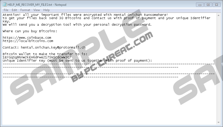 Hentai Onichan RansomwareWhen Hentai Onichan Ransomware attacks, all personal files are encrypted and the ".hor" extension is added to the original names to mark them. So, for example, a file before encryption named "picture.jpg" is renamed to "picture.jpg.hor." We cannot understand why this specific extension was used, but the creator of the threat is responsible for naming it. The name is included in the ransom note that is dropped once files are encrypted. The purpose of this note is to convince them to pay a ransom, but the size of this ransom is ridiculously high, and so we believe that perhaps this malware is still being developed. Maybe someone has more time on their hands than usual, and they are simply building inactive ransomware threats for their own entertainment. We hope that that is the case, but we also have to consider the possibility that this threat is spreading actively. Continue reading to learn how to secure your system and also how to remove Hentai Onichan Ransomware if it slithers in. Hentai Onichan Ransomware might use spam emails or bundled downloaders to trick users into executing the infection’s launcher themselves. Other active threats and existing system/software vulnerabilities could be exploited also. All in all, the fact that this malware managed to get in signifies that you do not have reliable protection for your Windows operating system, and that is a huge problem. If you yourself do not catch and delete Hentai Onichan Ransomware right after it is executed, the threat encrypts files immediately. It also drops its own malware files. According to our research team, the ransomware creates temporary files in the %APPDATA%\Microsoft\Windows\Start Menu\Programs\Startup folder, and the names of these files are likely to take on the names of legitimate files. For example, "lsass.exe," "svchst.exe," "chrome32.exe," "mysqld.exe," crcss.exe," "firefox.exe," "opera32.exe," "spoolcv.exe," "calc.exe," or "ctfmom.exe." These files, just like the launcher file, should delete themselves after files are encrypted and the attack is complete. Of course, you should inspect your system for any potential leftovers anyway because you do not want to miss any threats. The main file dropped by Hentai Onichan Ransomware is called "HELP_ME_RECOVER_MY_FILES.txt," and it represents the ransom note. The message inside informs that victims have to pay a ransom of 30 Bitcoin to the 1ErGqSg86nW2kEH6dFwe217SNSCdcwWJQ7 Bitcoin Wallet and then confirm the payment and send a unique ID code to hentai.onichan.key@protonmail.ch. If you have not figured that out yet, 30 Bitcoin is an incredibly large sum of money. At the time of research, that converted to around $200,000. Perhaps, this is why the Bitcoin Wallet was also empty. Of course, it is more likely that Hentai Onichan Ransomware is not actively spreading at all. That being said, if you are hit by this malware, you DO NOT want to contact the attackers via email, and you certainly do not want to waste any of your money on the decryption services or tools allegedly offered by the attackers. In all cases, ransomware threats are designed primarily to extort money, and the attackers behind them could not care less about what happens with the victims’ files. This is why you always want to have backup copies stored outside the computer that holds the original files. If you have backups, you can use them to replace the files that were corrupted after you remove the infection. Hopefully, Hentai Onichan Ransomware deletes itself after your files are encrypted, in which case, you do not need to worry about finding and eliminating malware files. Of course, no one can guarantee that malware will act as predicted, which is why you want to check for leftovers. See the guide below for tips. Obviously, we recommend installing anti-malware software to help you with Windows security. Hentai Onichan Ransomware is just one of thousands of file-encrypting threats that could slither into your unguarded system, and so it is time for you to bite the bullet and invest in your virtual security. If you install anti-malware software, malware components that could have been left behind will be removed automatically. Another thing we suggest doing is creating file backups. If you have spacious external drives, you can use those to store copies of photos, docs, and other personal files you want to protect. Alternatively, you can implement cloud storage systems to back up files online. This might be the more convenient solution because online backups allow accessing files from any device. Hentai Onichan Ransomware Removal
