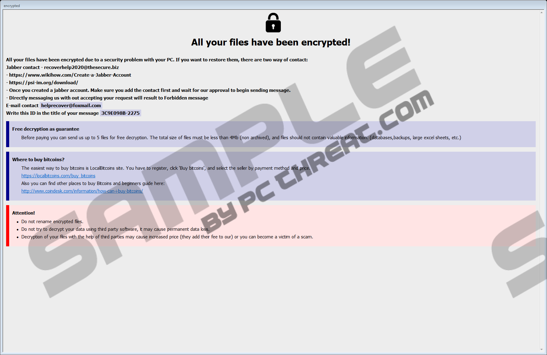 Helprecover@foxmail.com].help RansomwareIf Helprecover@foxmail.com].help Ransomware enters your system, all your pictures, photos, and other personal files could be lost. The malicious application encrypts such data with a strong encryption algorithm. Even though such files can still be decrypted with the right decryption tools, it might be impossible to get them because hackers behind the malware might be only ones who have them. Unfortunately, they demand to be paid before providing the decryption tools, which means there are no guarantees that a user would receive them even if he pays. If you have no intention to put up with any demands, we advise ignoring the ransom note and erasing Helprecover@foxmail.com].help Ransomware. It is advisable to do so because it is possible that the threat could be still dangerous if it is left on a system. To learn how to erase it as well as other details about it, we encourage you to read the rest of this article. If you are wondering how you could protect your computer against such threats like Helprecover@foxmail.com].help Ransomware, there are a couple of things you should know about their distribution. In many cases the launchers of such malicious applications are spread through spam emails, unreliable file-sharing websites, and pop-ups or ads. Thus, a user can launch it unknowingly while opening attachments from suspicious sources, installers from doubtful websites, etc. Thus, one of the ways to keep away from ransomware and malware alike is to stay away from unreliable files. We also recommend getting rid of weaknesses that could expose your system to such malicious applications, for example, outdated software, weak passwords, unsecured RDP (Remote Desktop Protocol) connections, and so on. If you want extra protection, it is advisable to get a reliable antimalware tool that could guard your system against many different malicious applications. What happens if Helprecover@foxmail.com].help Ransomware is launched? At first the malicious application ought to create its copies in the %LOCALAPPDATA%, %APPDATA%\Microsoft\Windows\Start Menu\Programs\Startup, and other directories that are listed in our deletion instructions. Also, the malware may create a couple Registry entries that would allow it to restart with the operating system. It means that the threat might start running every time when you restart or turn on your device. After it creates the files that it needs, the malware should locate files that it was programmed to encipher, for example, text documents, photographs, and other data that a user might find valuable or irreplaceable. Once the targeted files get encrypted, they should receive a second extension, for example, little_panda.jpg.id[8E8F598B-2872].[helprecover@foxmail.com].help. Soon after encrypting the data that the malware is after it should drop files called info.txt and info.hta. The text document should claim that all files were encrypted and that users can purchase decryption tools by paying ransom after they contact the malware’s developers with the given contact details. The other file opens a pop-up window that contains a similar message, except it is longer and with more links to websites that are supposed to help victims contact hackers or pay ransom. Neither of the messages say how much money hackers want to receive so the size of the ransom could be different to everyone. Whatever the sum could be we advise not to pay it if you do not want to risk wasting your money on decryption tools that you may never get. Helprecover@foxmail.com].help Ransomware’s developers might claim to have them or even be able to prove that, but no one can know if they will bother to send them. Thus, we advise against dealing with hackers if you do not like taking chances. Another thing that our specialists recommend to those who encounter Helprecover@foxmail.com].help Ransomware is to erase it. The task might not be easy but if you care about your data’s and system’s safety, it would be wise not to wait too long and erase this malicious application. If you think you are experienced enough, you could try to remove it manually while following the instructions placed below. However, keep in mind that we cannot guarantee that they will work for everyone. Therefore, we believe it would be safer to install a reliable antimalware tool that could eliminate Helprecover@foxmail.com].help Ransomware for you. What you would have to do is install it, start a full system scan, and then click the deletion button that ought to appear after the scanning is over. Remove Helprecover@foxmail.com].help Ransomware